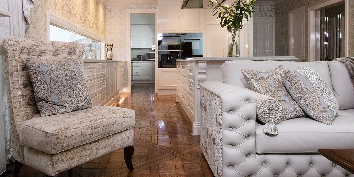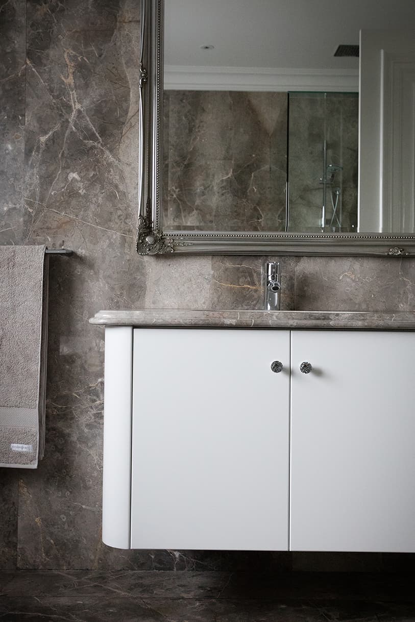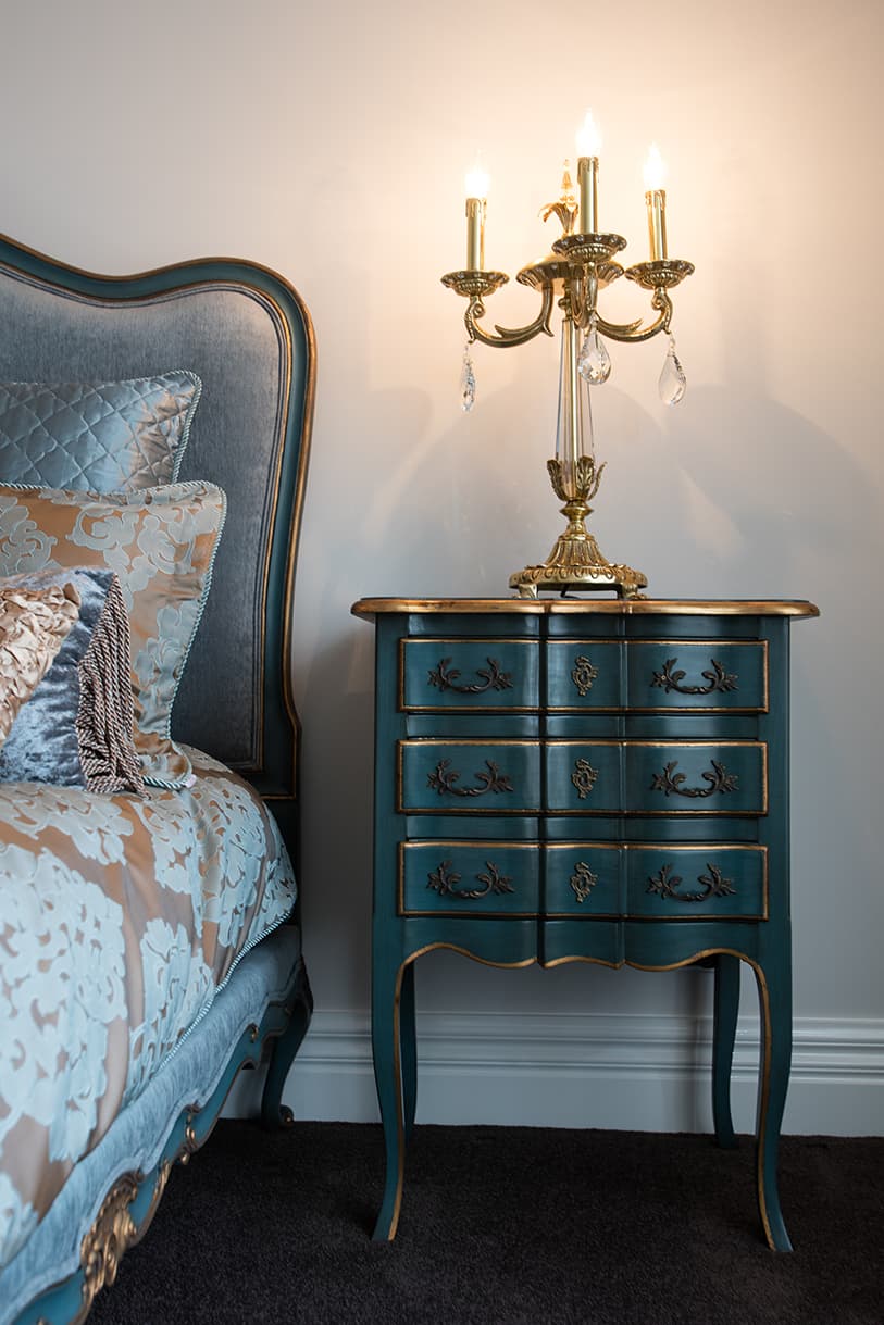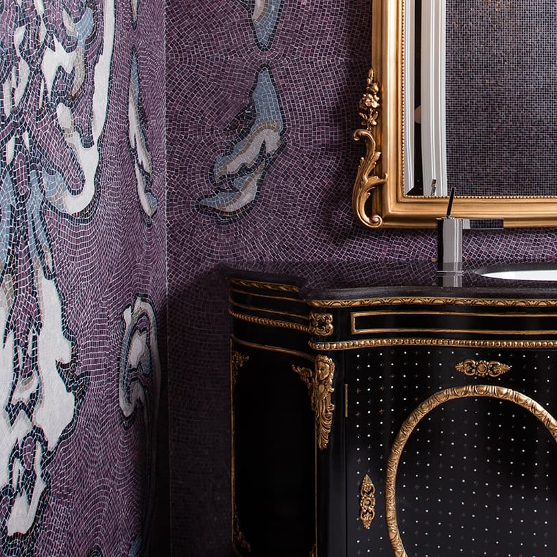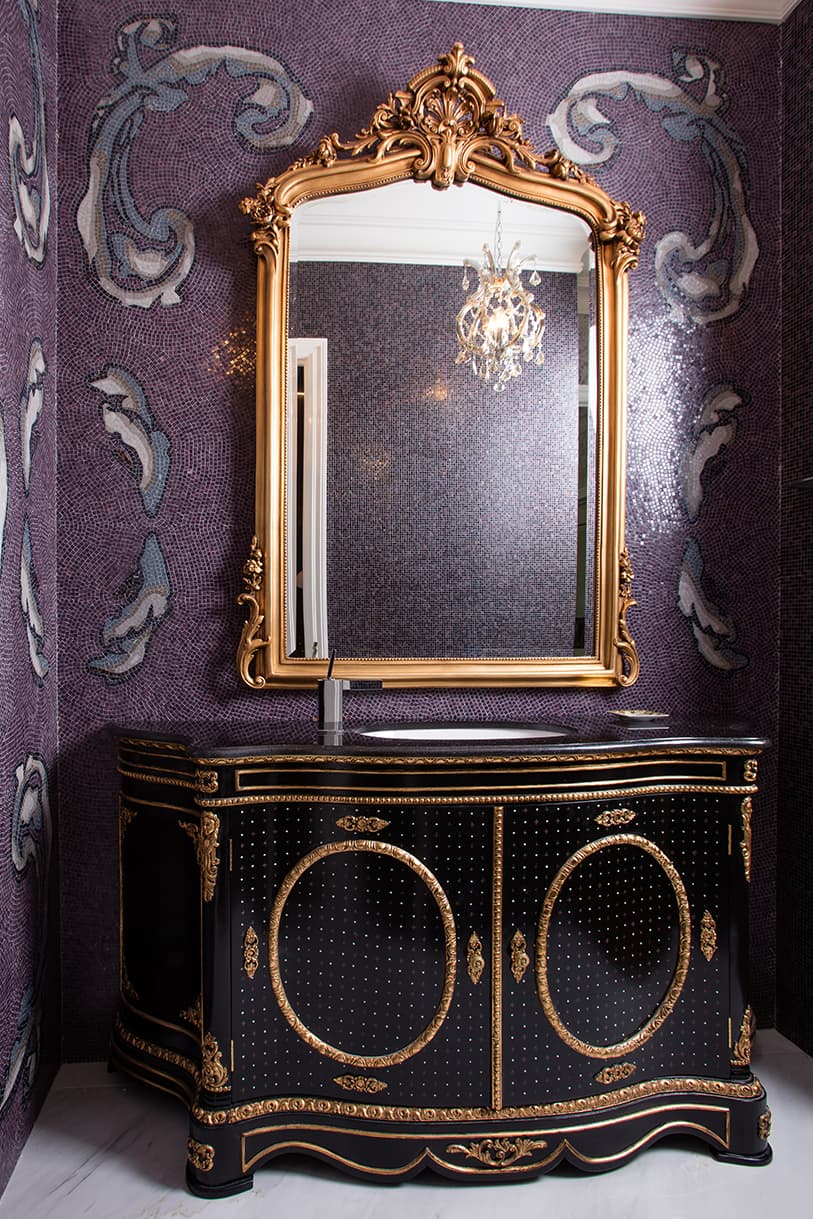 The clients love the specialised, handcrafted furniture from Mark Alexander and had a preference to have it stand alone in the space. These signature items make the home contemporary, soft and stylish. Mark Alexander blended elements of Rococo, modern Parisian stylings and contemporary Western living to seamlessly create a chic palette. The rich textiles and statement lighting match perfectly with the wallpapers, statement marble and deep purple mosaic tiles.