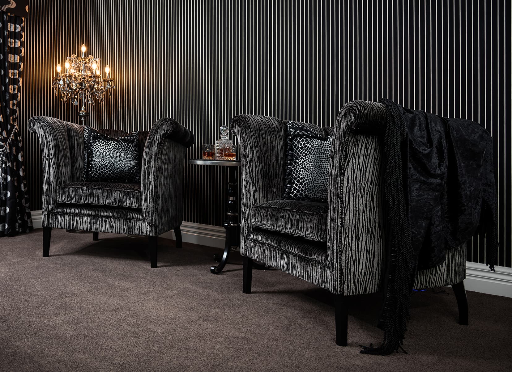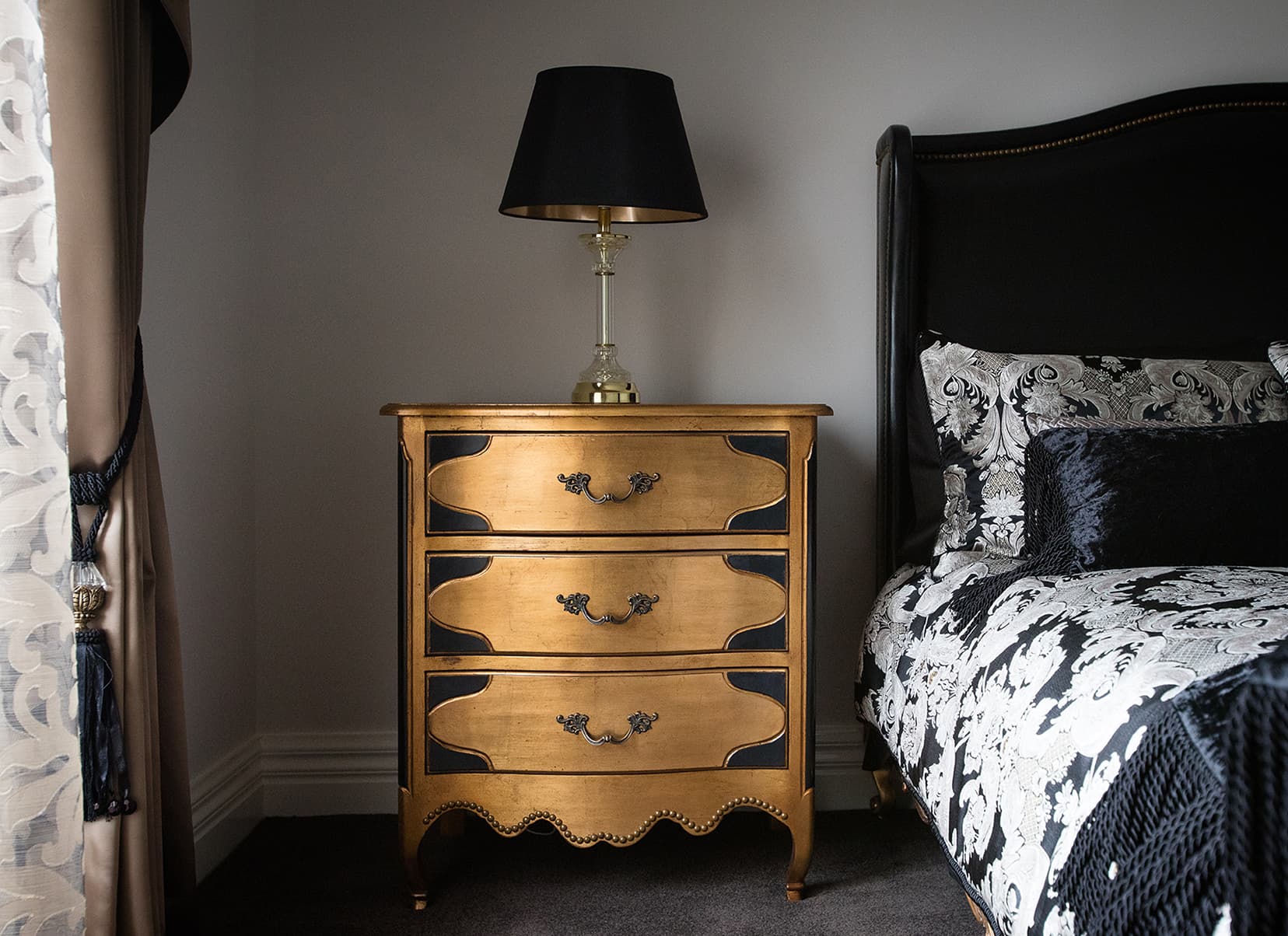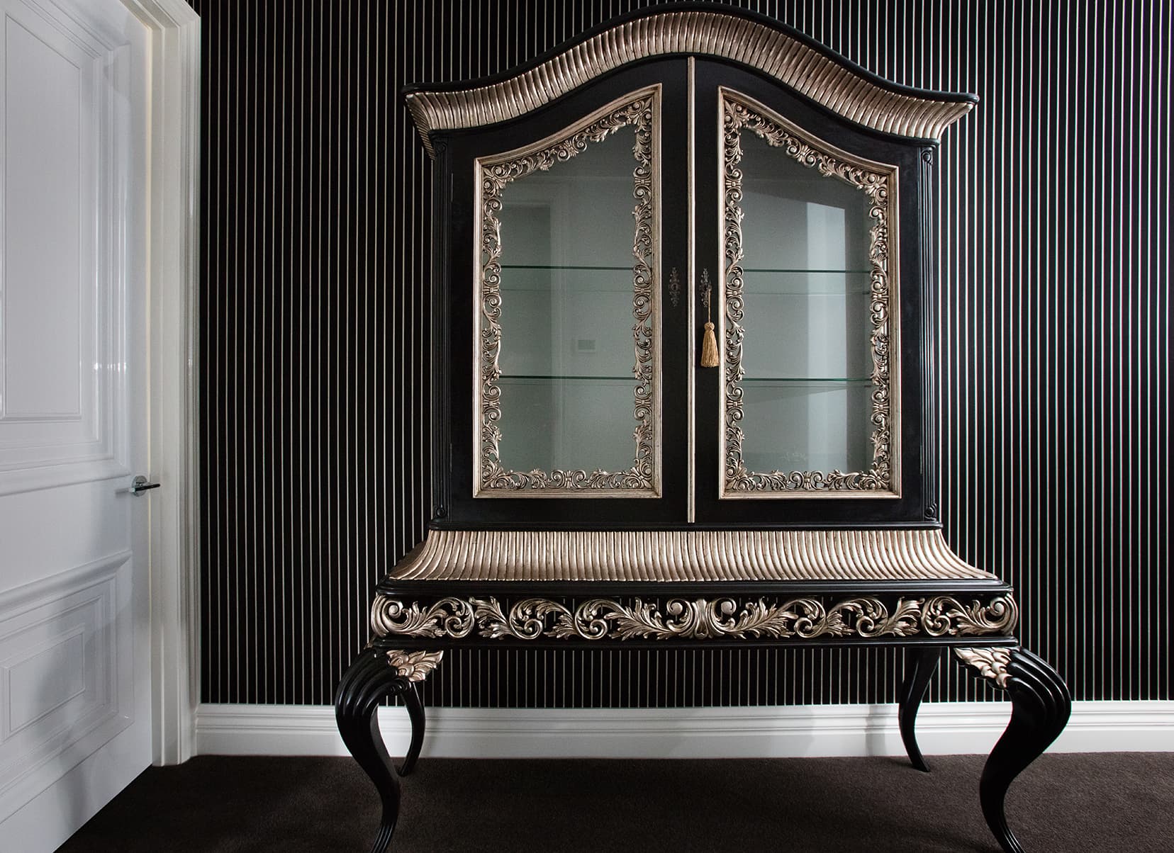 The clients love the specialised, handcrafted furniture from Mark Alexander and had a preference to have it stand alone in the space. These signature items make the home contemporary, soft and stylish. Mark Alexander blended elements of Rococo, modern Parisian stylings and contemporary Western living to seamlessly create a chic palette. The rich textiles and statement lighting match perfectly with the wallpapers, statement marble and deep purple mosaic tiles.