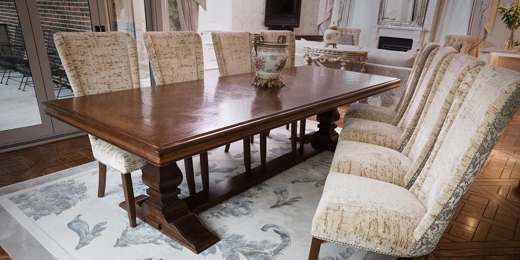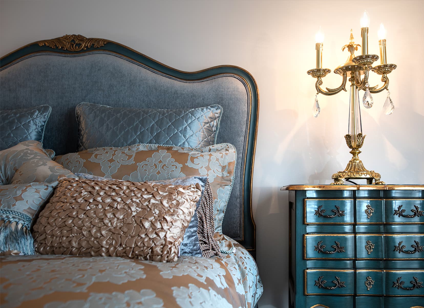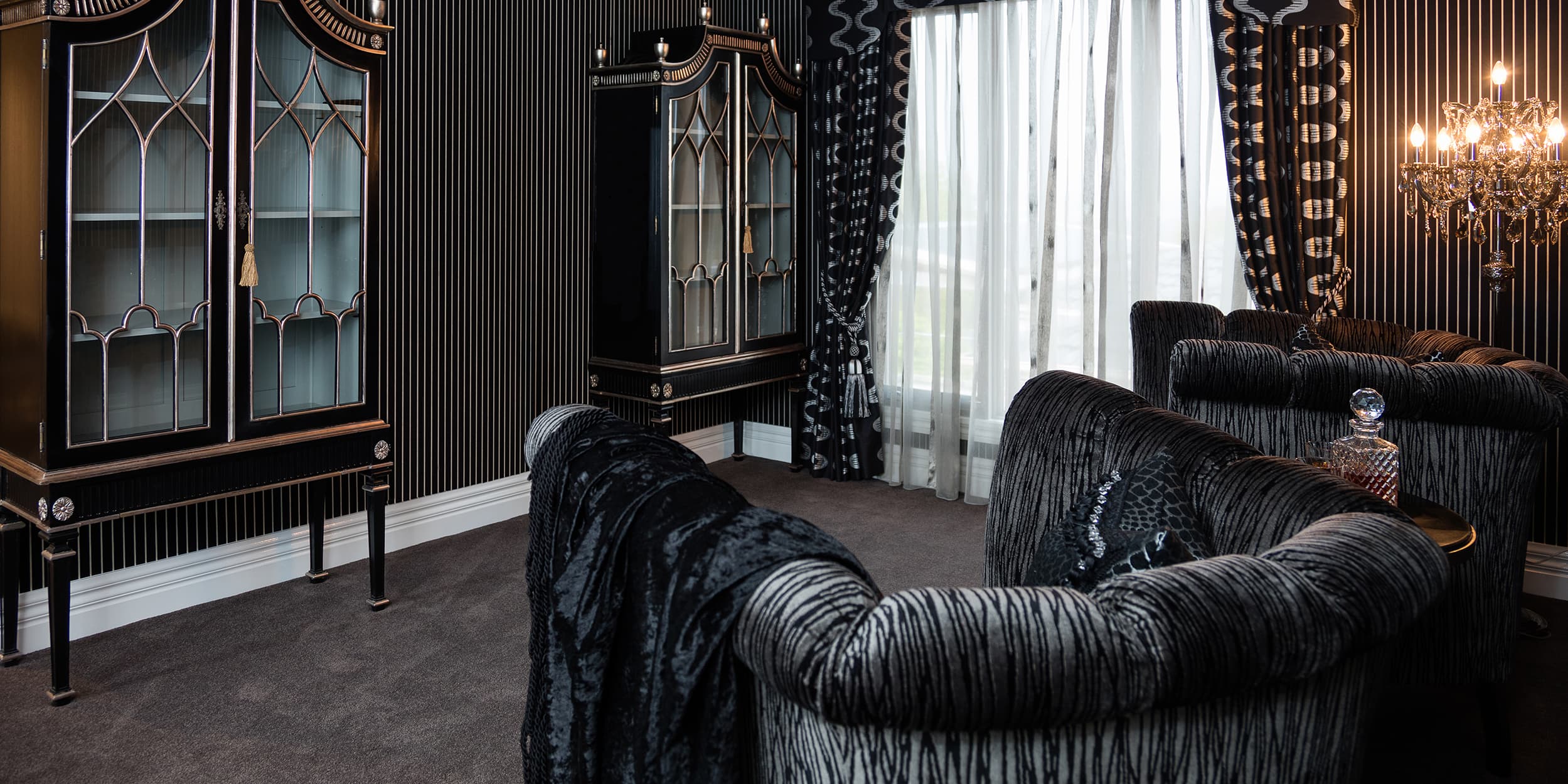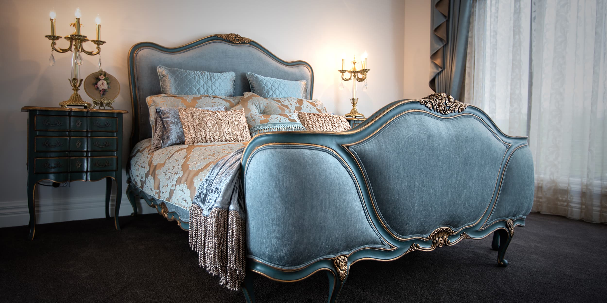 The clients love the specialised, handcrafted furniture from Mark Alexander and had a preference to have it stand alone in the space. These signature items make the home contemporary, soft and stylish. Mark Alexander blended elements of Rococo, modern Parisian stylings and contemporary Western living to seamlessly create a chic palette. The rich textiles and statement lighting match perfectly with the wallpapers, statement marble and deep purple mosaic tiles.