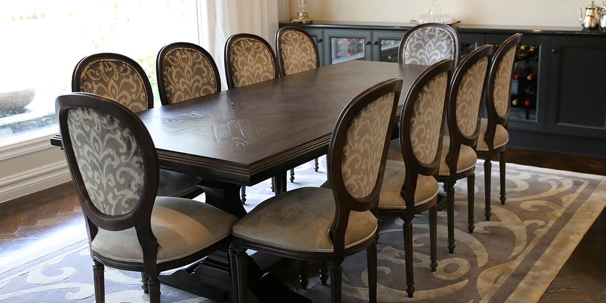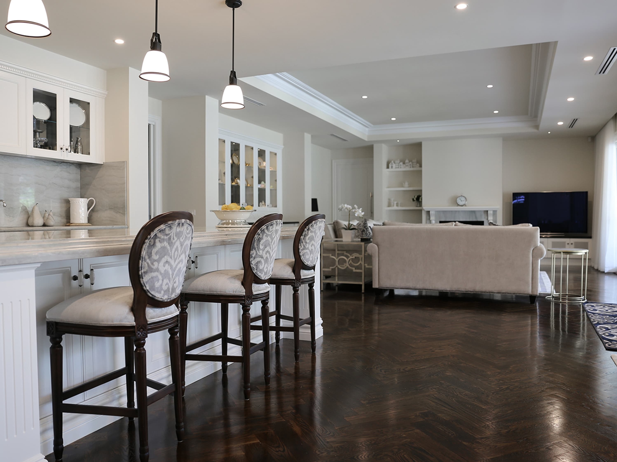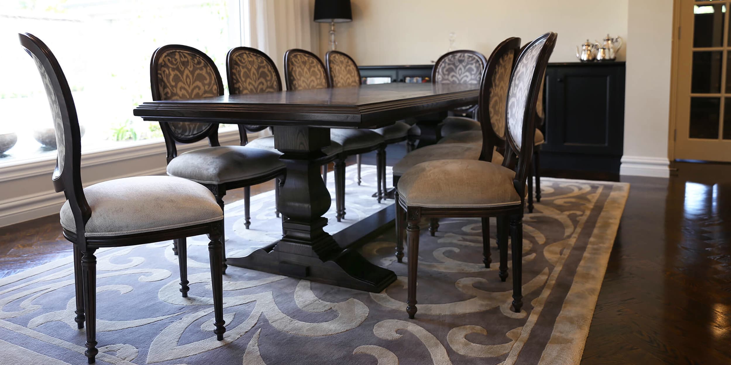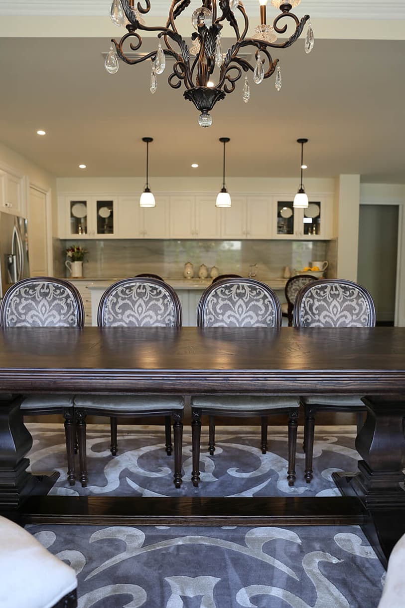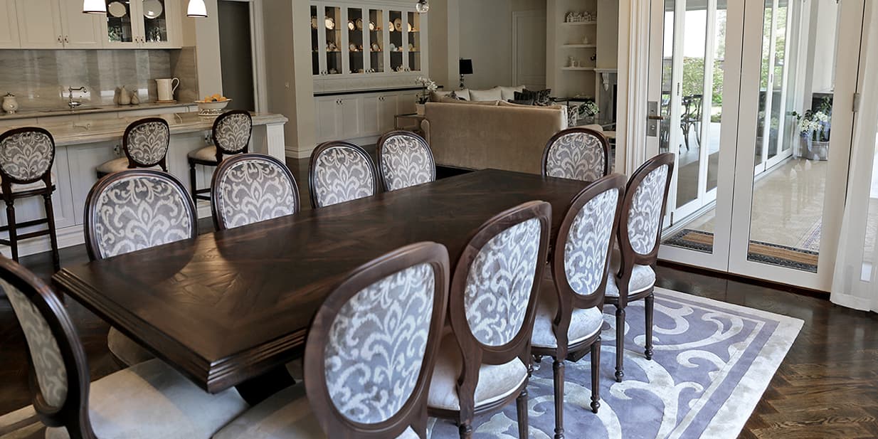 A French style home with contemporary elegance. Comfortable, liveable open plan spaces brought to life with bespoke furniture pieces individually tailored in an elegant palette of soft greys. Parquetry dining table in a dark Oak colour complimented with a classic oval back French Louis XVI dining chair and coordinating kitchen stool. Sumptuous floor rugs create a break between the dark Oaks and seamlessly connect the spaces.