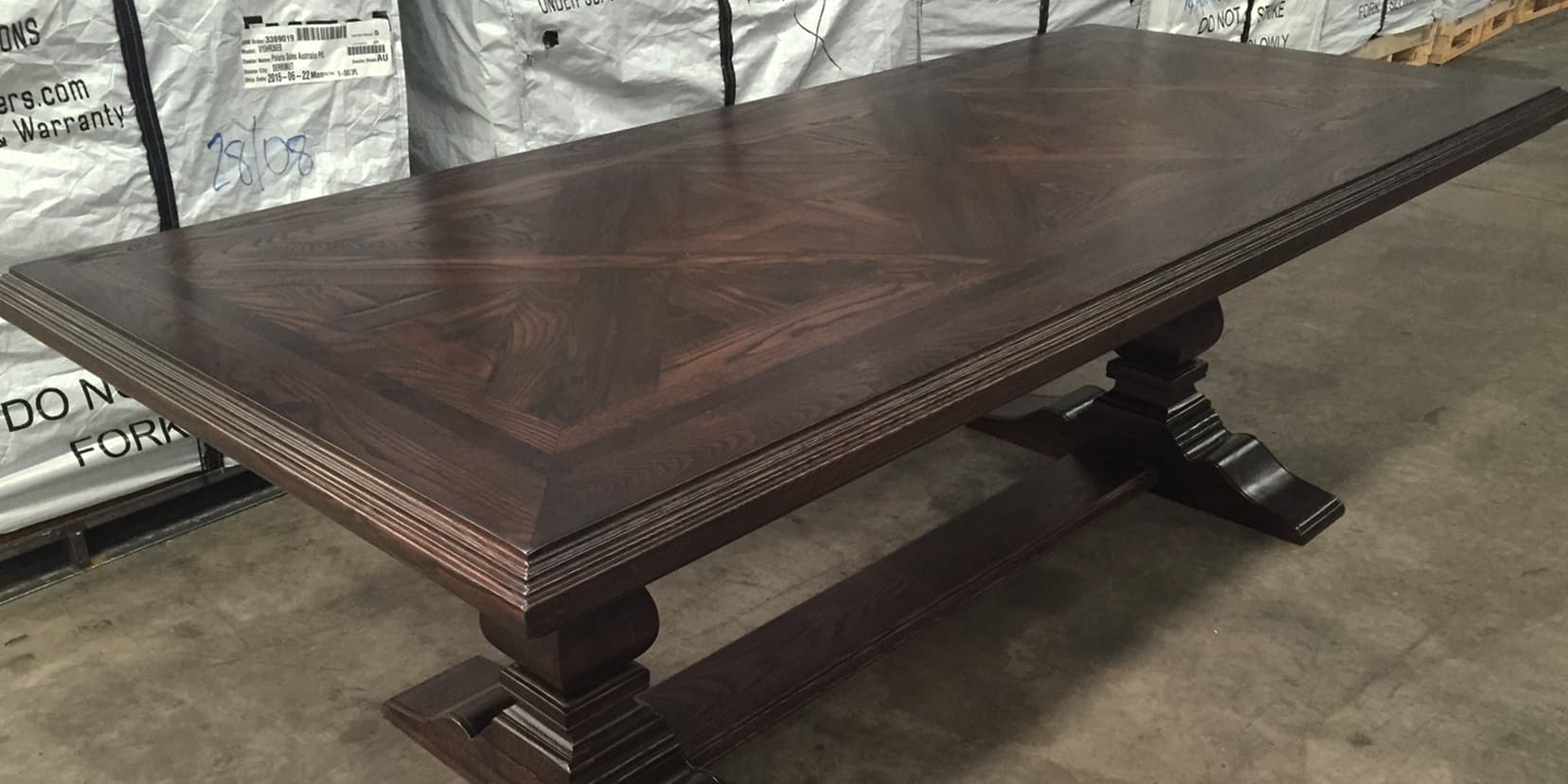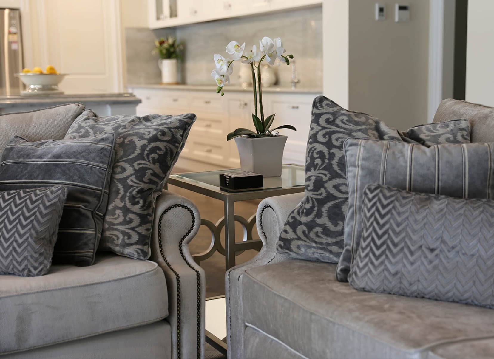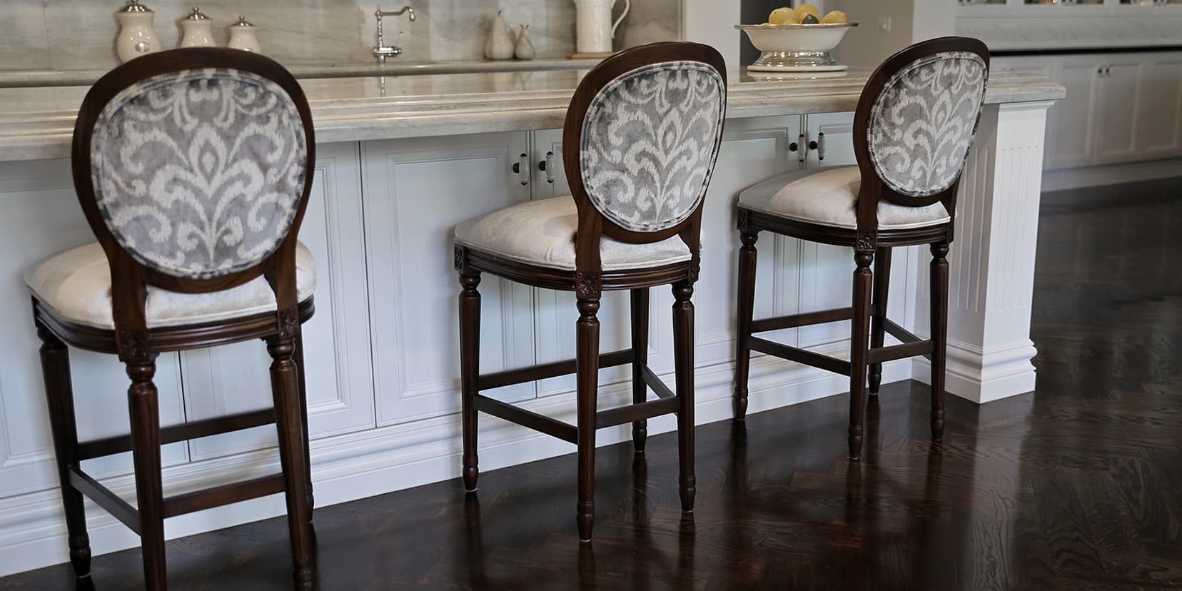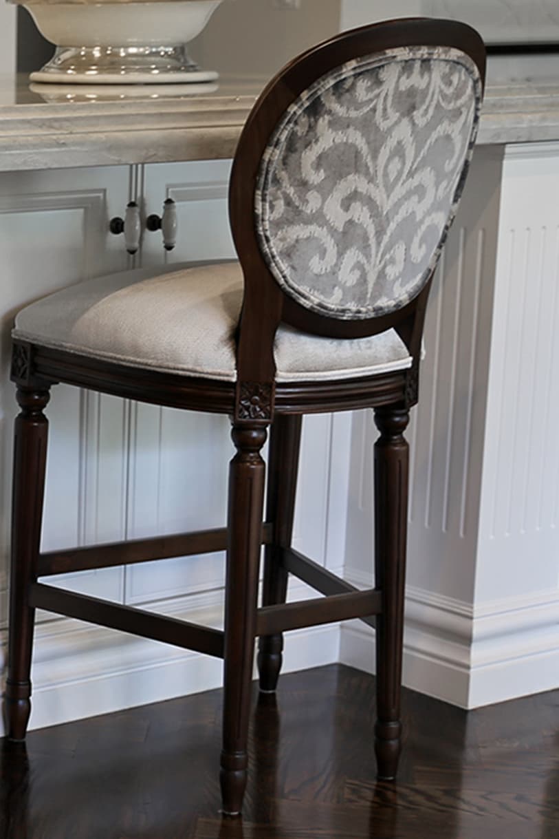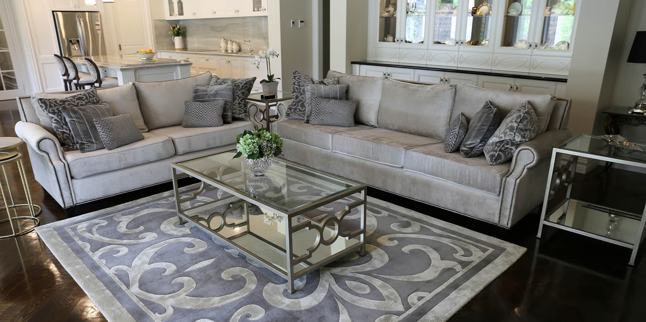 A French style home with contemporary elegance. Comfortable, liveable open plan spaces brought to life with bespoke furniture pieces individually tailored in an elegant palette of soft greys. Parquetry dining table in a dark Oak colour complimented with a classic oval back French Louis XVI dining chair and coordinating kitchen stool. Sumptuous floor rugs create a break between the dark Oaks and seamlessly connect the spaces.
