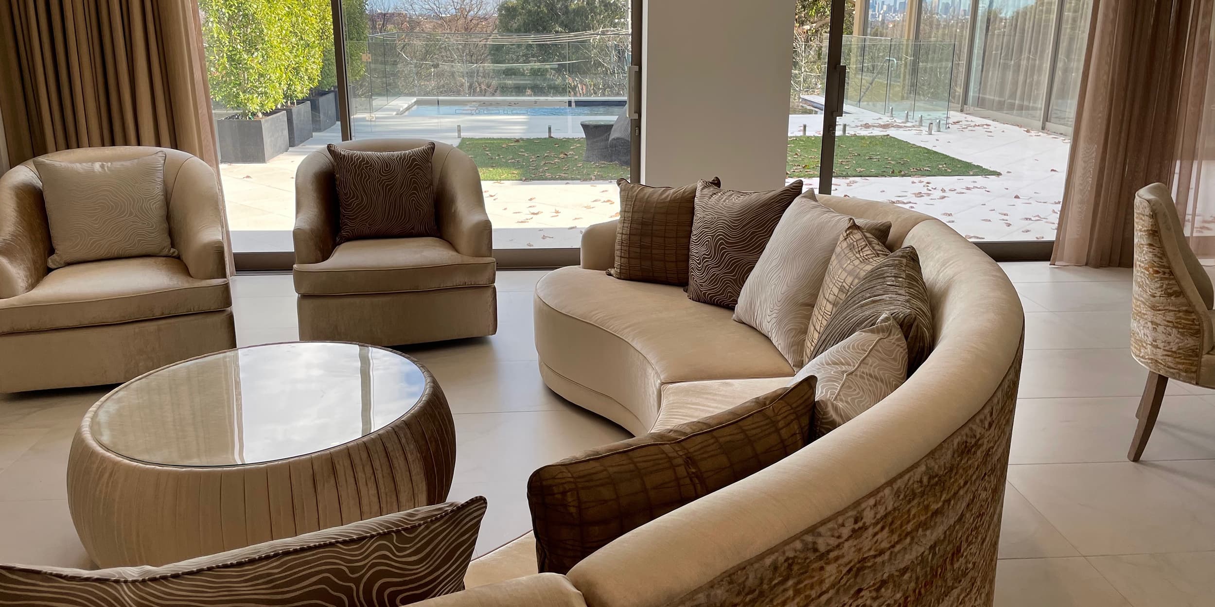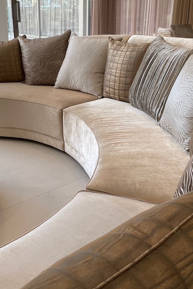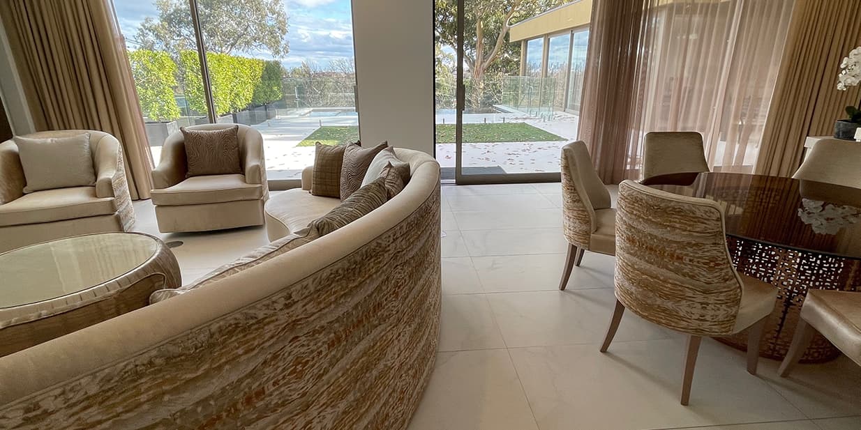 For this stunning inner city Melbourne mansion, Mark’s design priorities included elegant curving forms, natural materials, strong contrasts, warm, rich tones, and attention to detail. Highlighted are the property’s natural light source with a warm colour scheme of cream, gold, and clean structural lines to reflect it’s modern yet welcoming design.