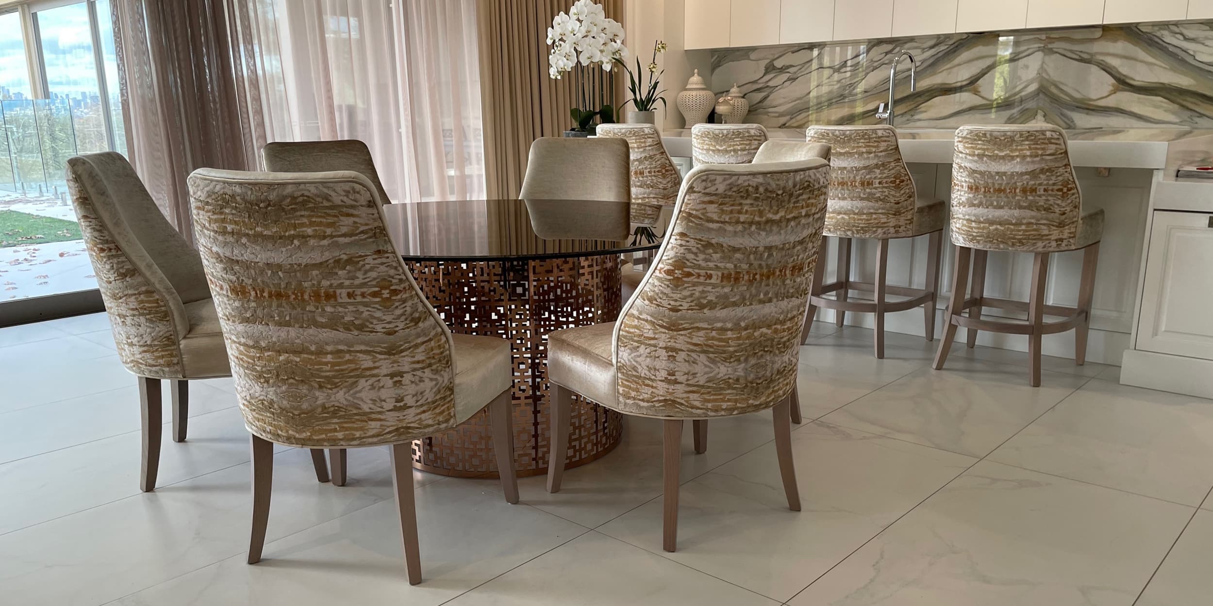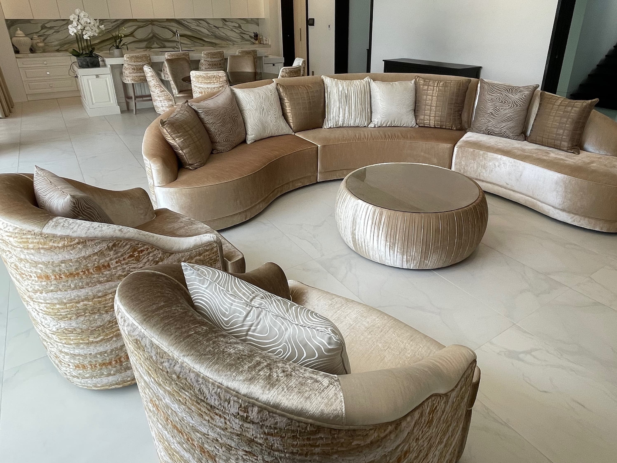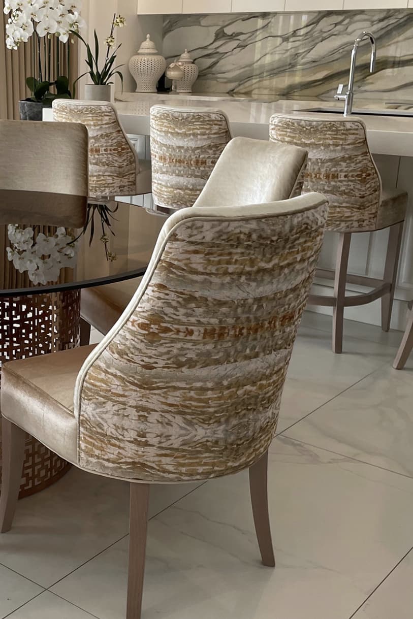 For this stunning inner city Melbourne mansion, Mark’s design priorities included elegant curving forms, natural materials, strong contrasts, warm, rich tones, and attention to detail. Highlighted are the property’s natural light source with a warm colour scheme of cream, gold, and clean structural lines to reflect it’s modern yet welcoming design.