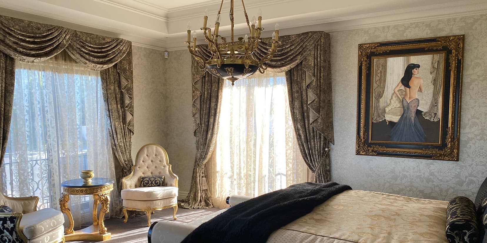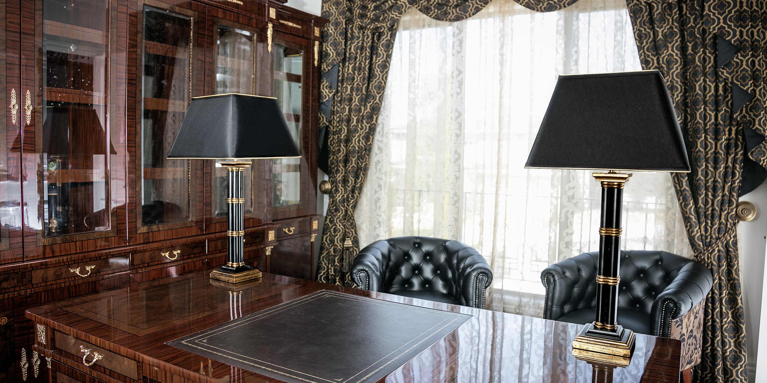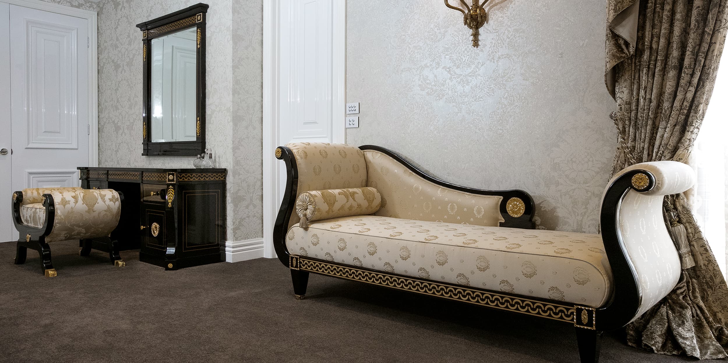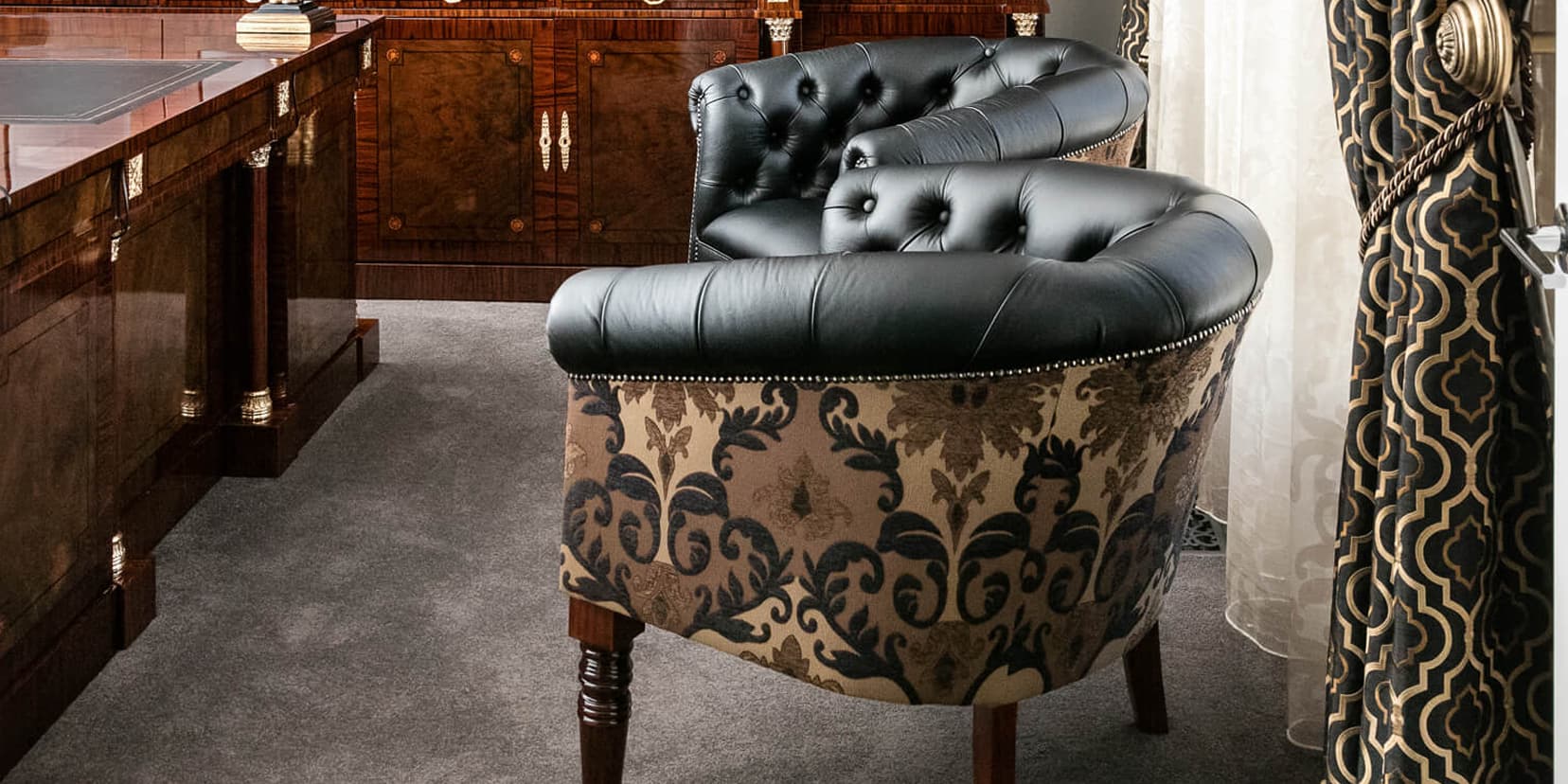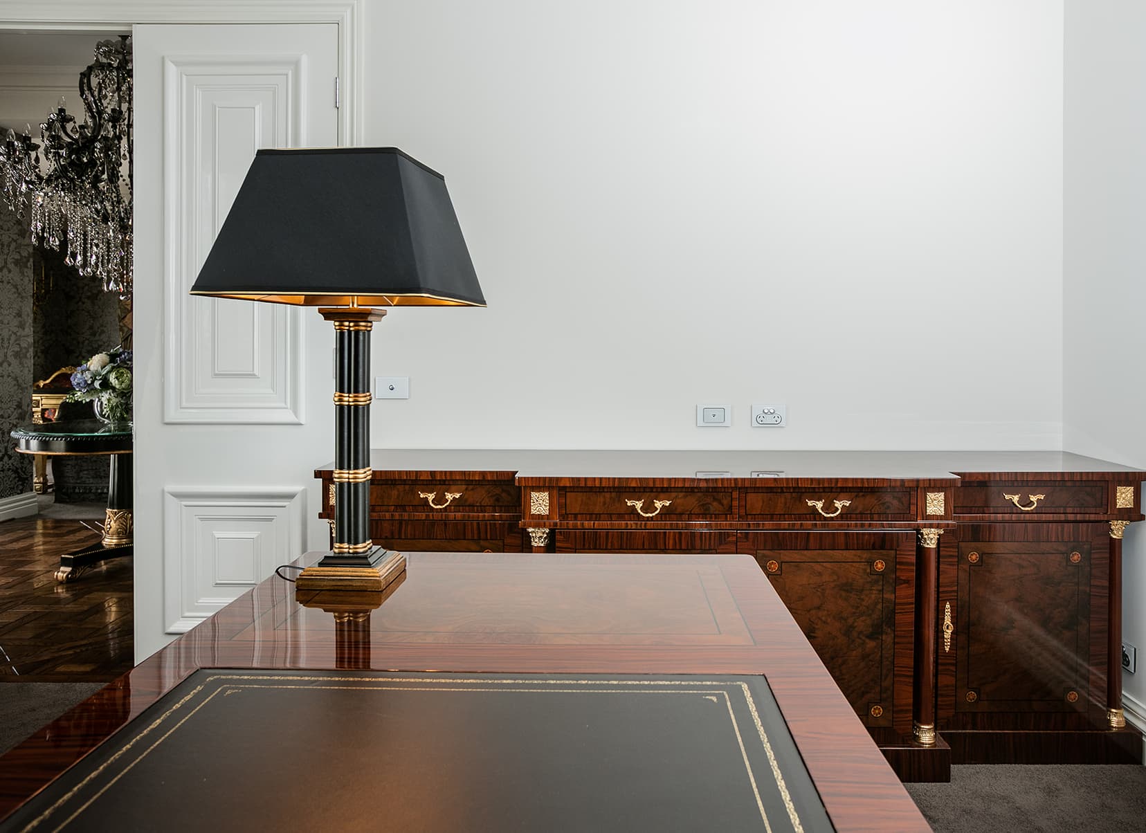A statement of success – An executive office with masculine influence. Featuring richly detailed Mahogany furniture with spectacular burl and Mahogany veneers combined with marquetry inlays and brass highlights. Classic in style showcasing heritage and stature, room is complete with well-appointed Italian leather chairs and opulent drapery. A luxurious space commanding attention and celebrating success.