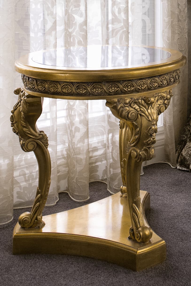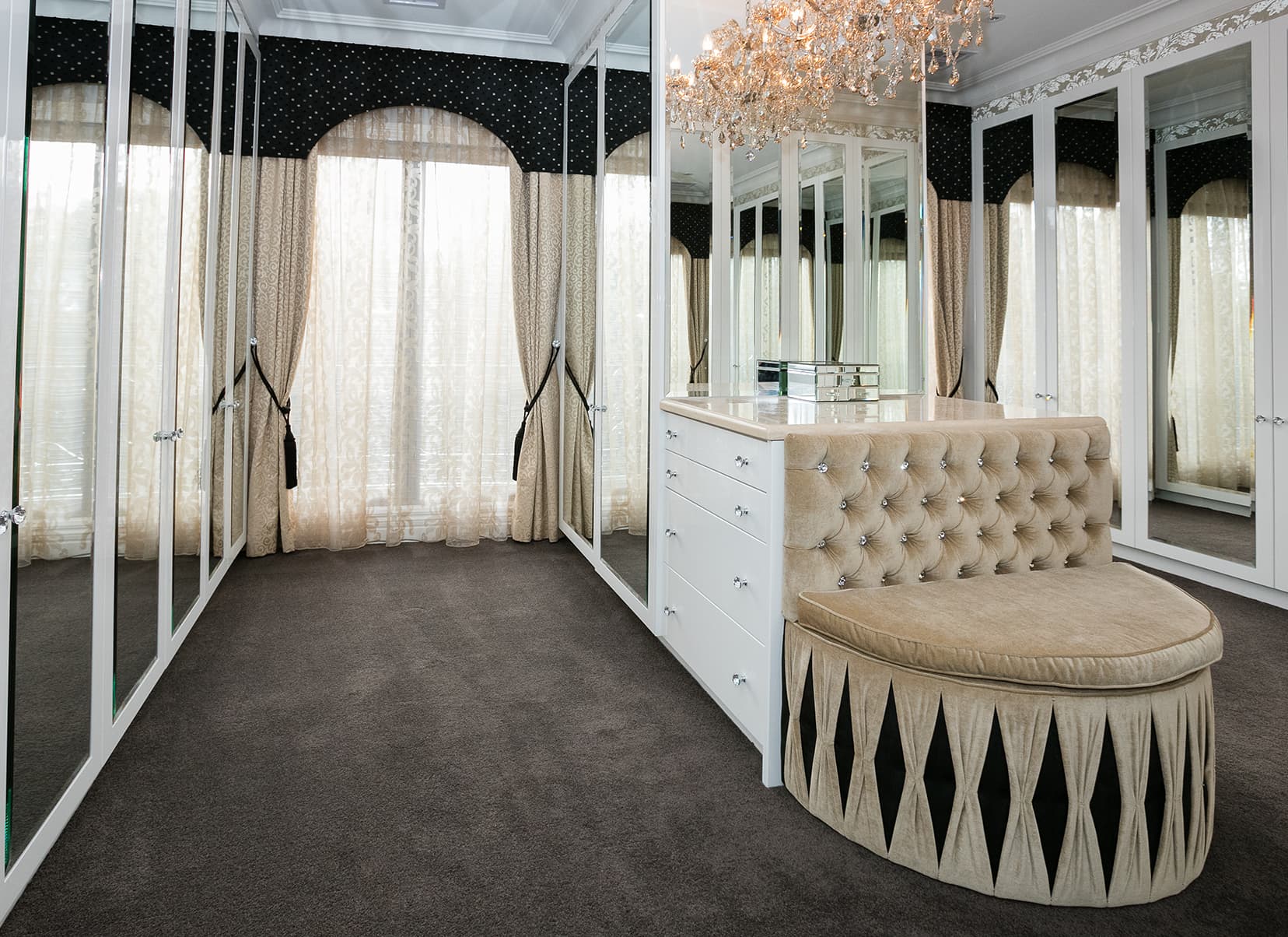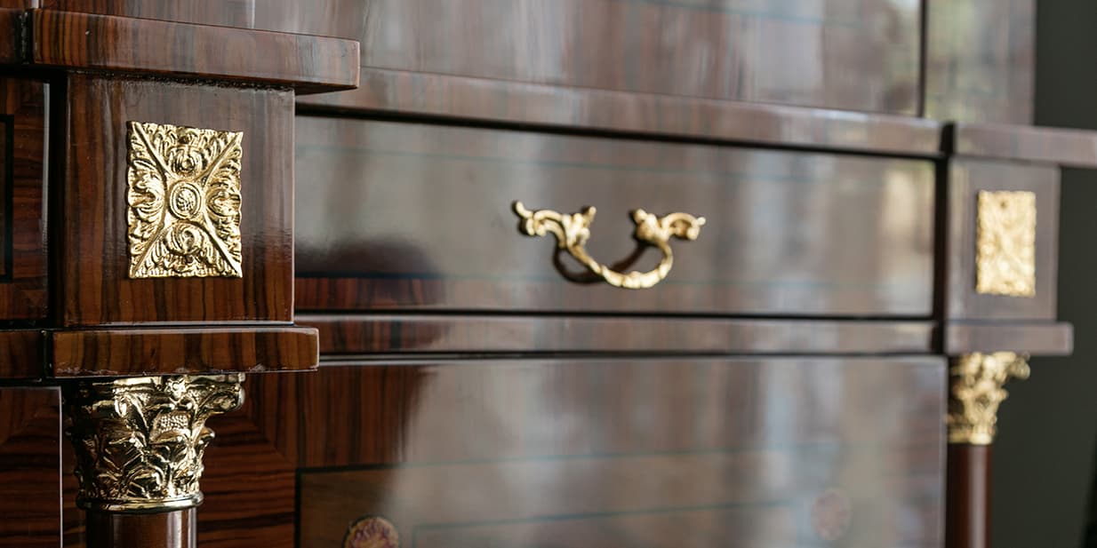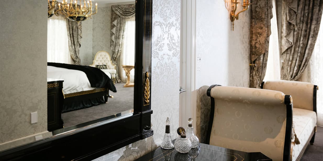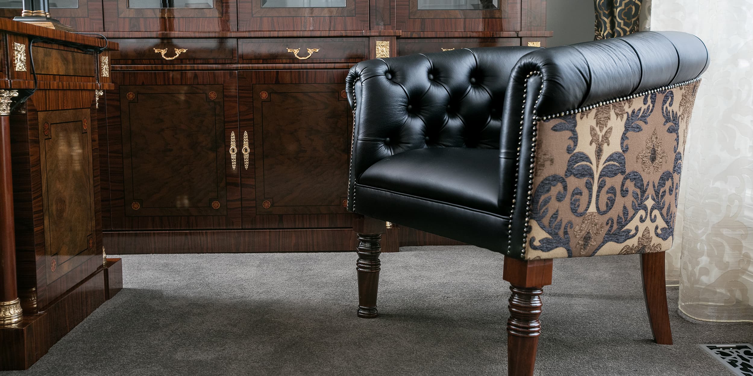 A statement of success – An executive office with masculine influence. Featuring richly detailed Mahogany furniture with spectacular burl and Mahogany veneers combined with marquetry inlays and brass highlights. Classic in style showcasing heritage and stature, room is complete with well-appointed Italian leather chairs and opulent drapery. A luxurious space commanding attention and celebrating success.