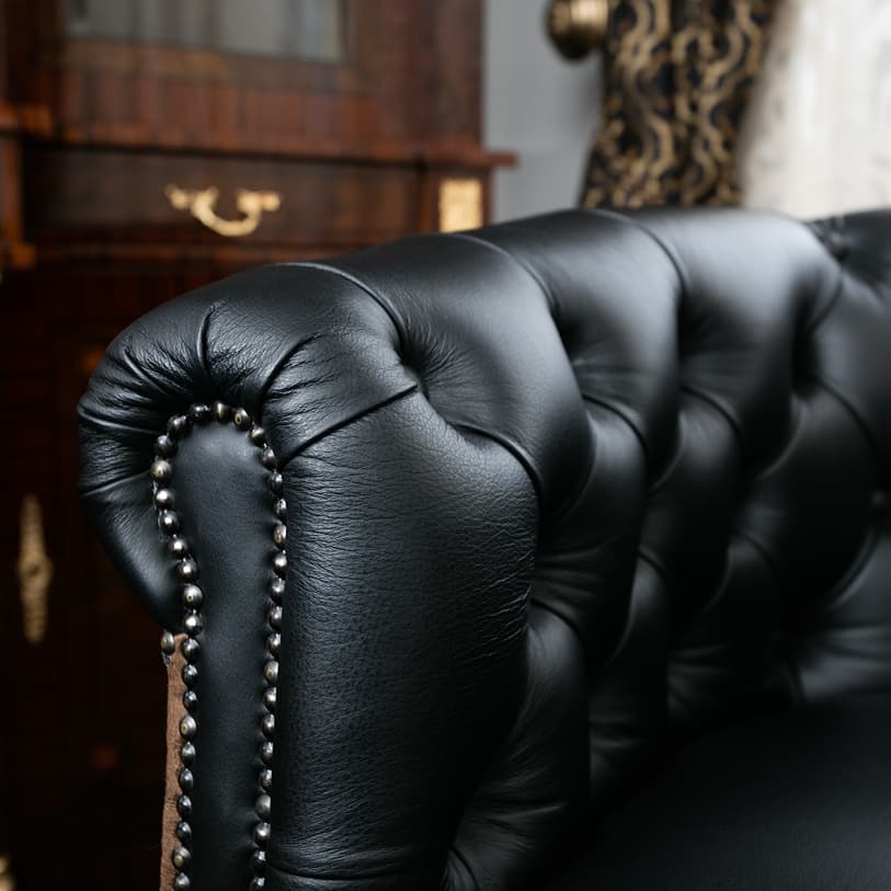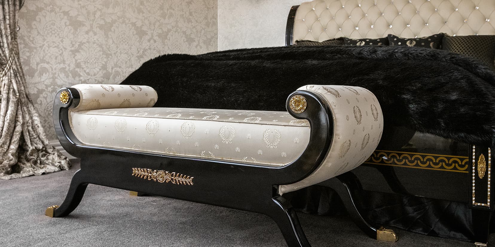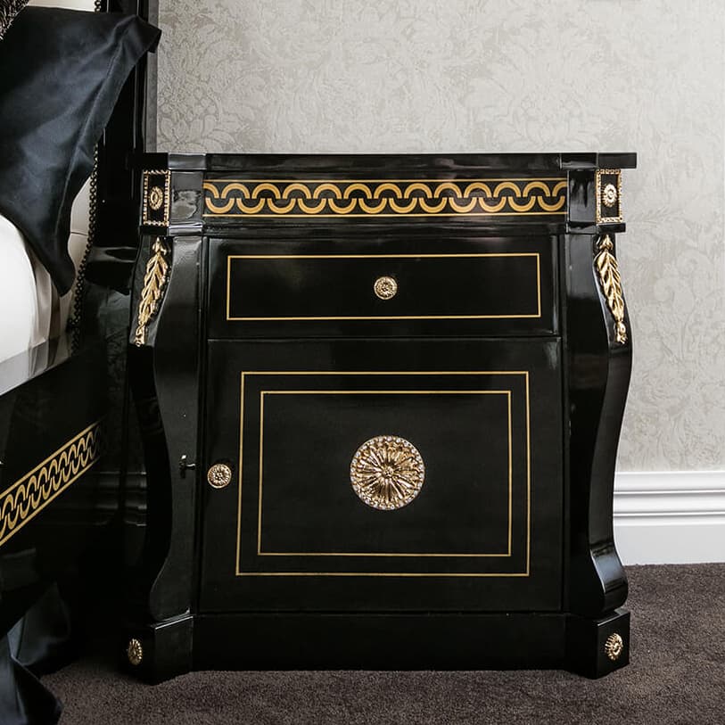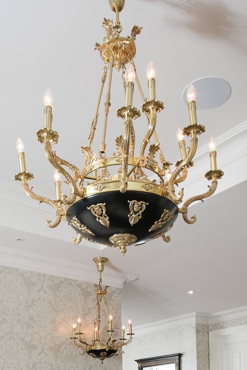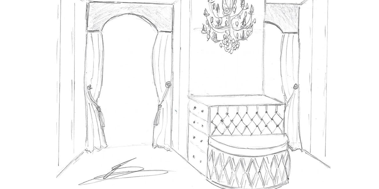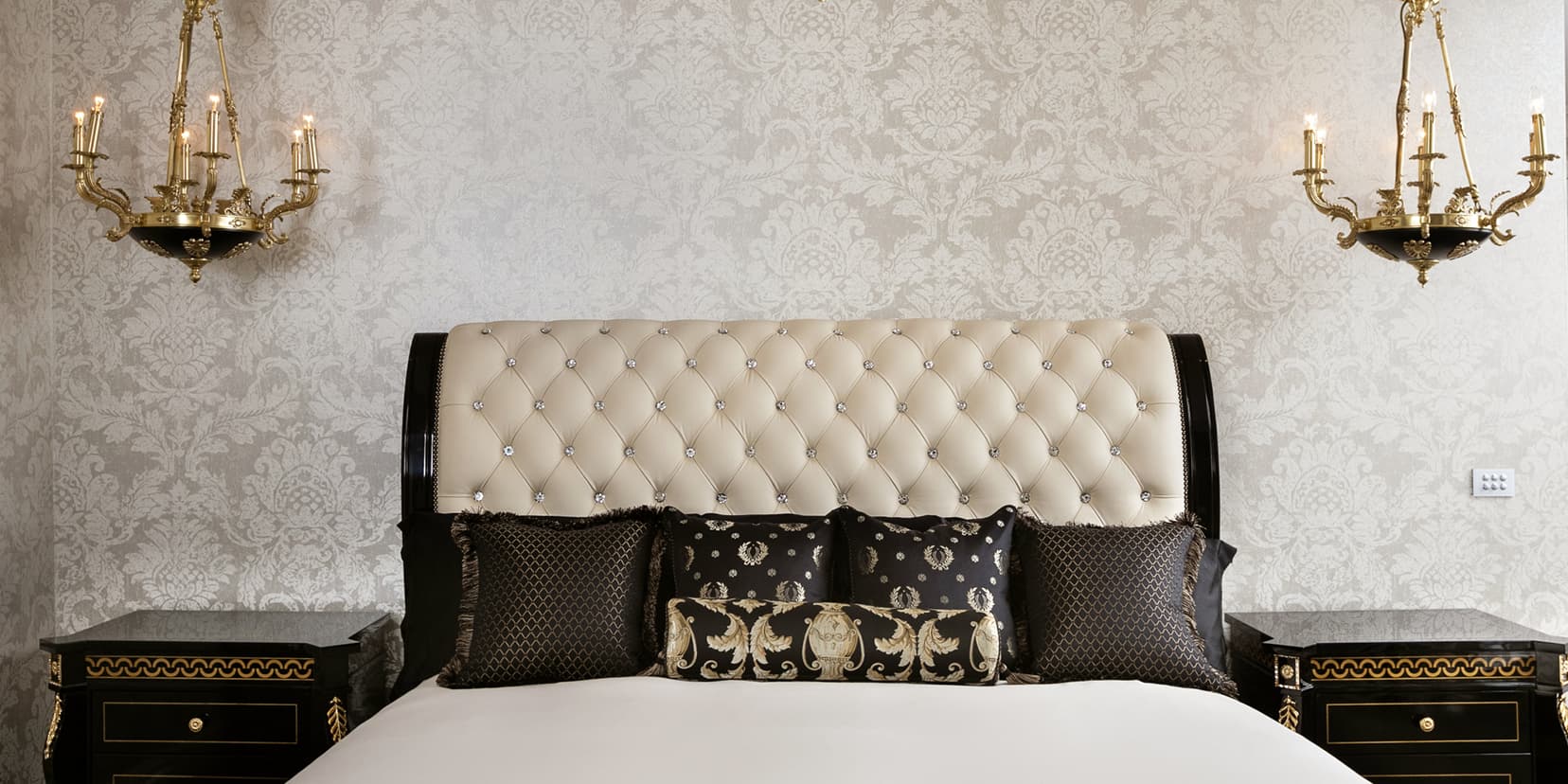 A statement of success – An executive office with masculine influence. Featuring richly detailed Mahogany furniture with spectacular burl and Mahogany veneers combined with marquetry inlays and brass highlights. Classic in style showcasing heritage and stature, room is complete with well-appointed Italian leather chairs and opulent drapery. A luxurious space commanding attention and celebrating success.