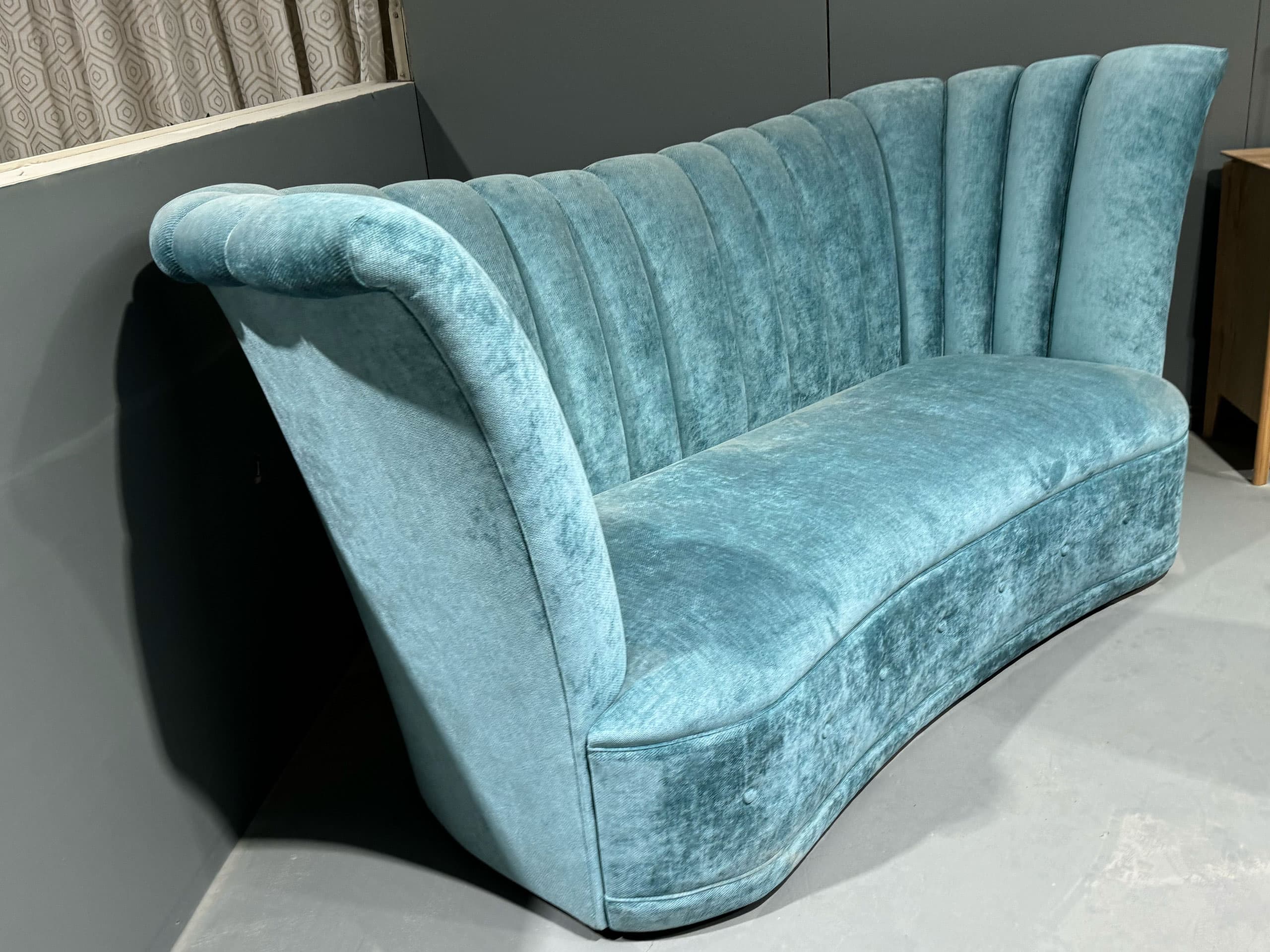 This bespoke Art Deco sofa features sweeping curves and a high backrest, crafted from the finest quality hardwood and premium foams for exceptional comfort.