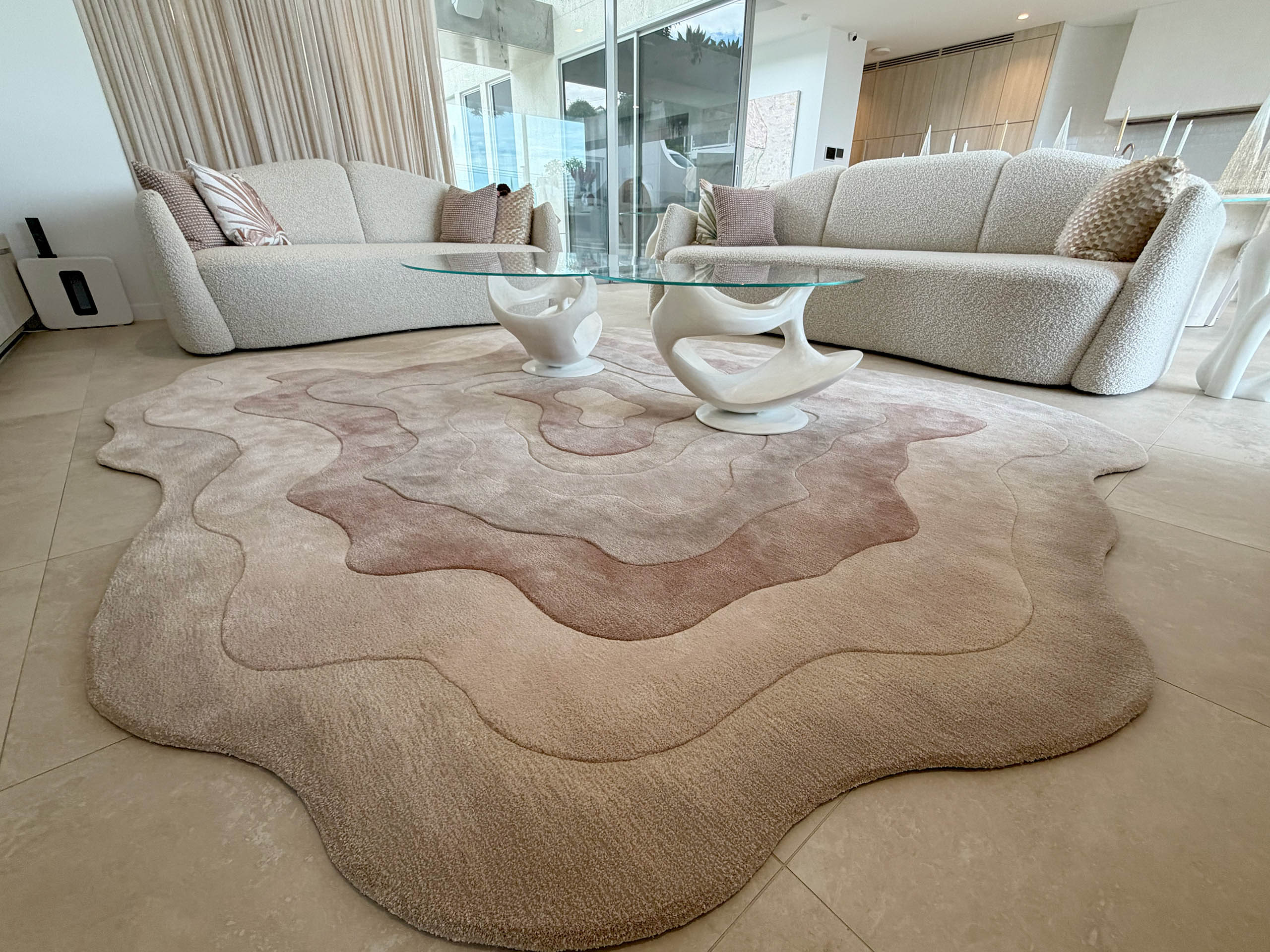 The bespoke living room floor rug is custom made to complement the existing sofa layout, featuring an organic, irregular silhouette that echoes natural contours and adds a soft, sculptural flow to the Mid Century living space. The custom shape visually anchors the seating area while enhancing the room’s overall balance, handcrafted by luxury interior designer and furniture manufacturer Mark Alexander.