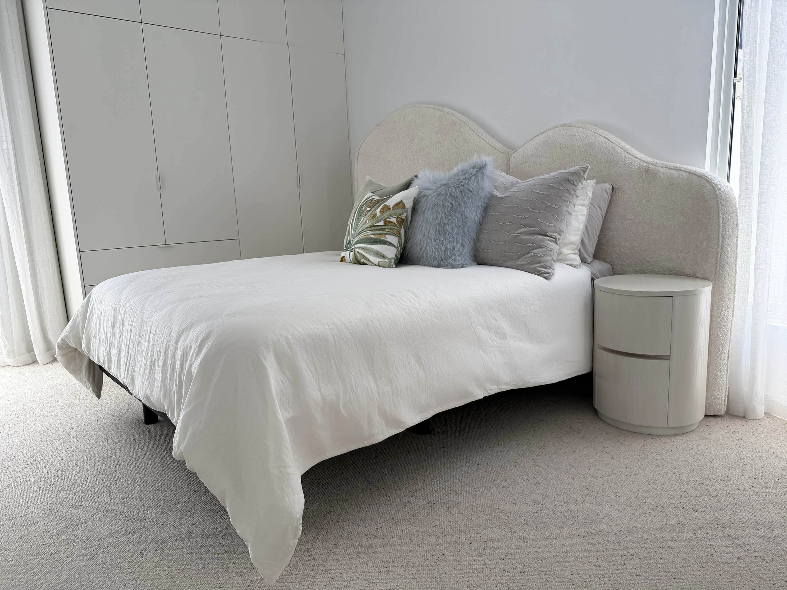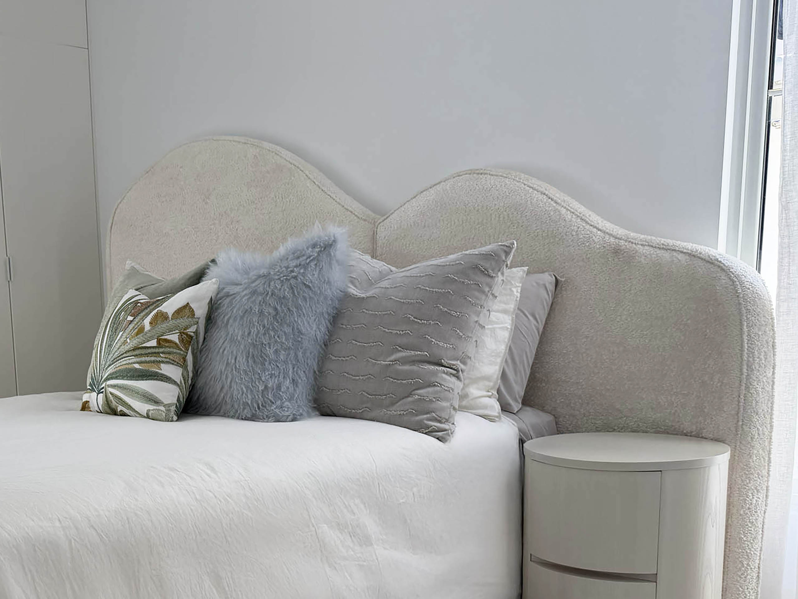 Crafted in two pieces for ease of installation, this design exemplifies the precision and attention to detail that define custom made furniture. Each curve and proportion has been carefully considered to harmonise with surrounding elements, ensuring a cohesive and balanced aesthetic. Part of a distinguished collection of luxury furniture, this Australian made bed head embodies modern elegance, comfort, and craftsmanship. It is a premium luxury bed head, seamlessly blending design integrity, quality materials, and tailored sophistication for a refined interior.