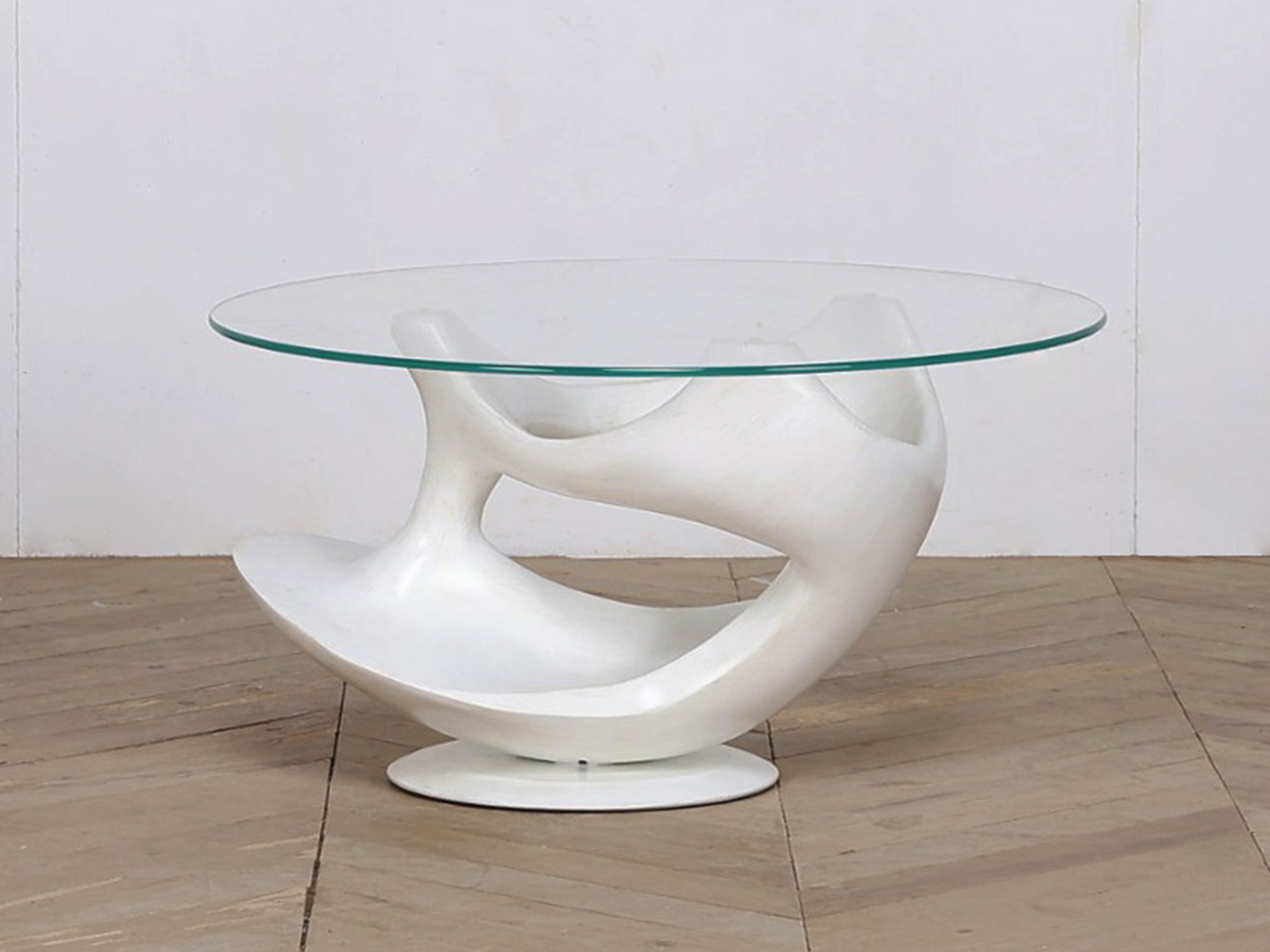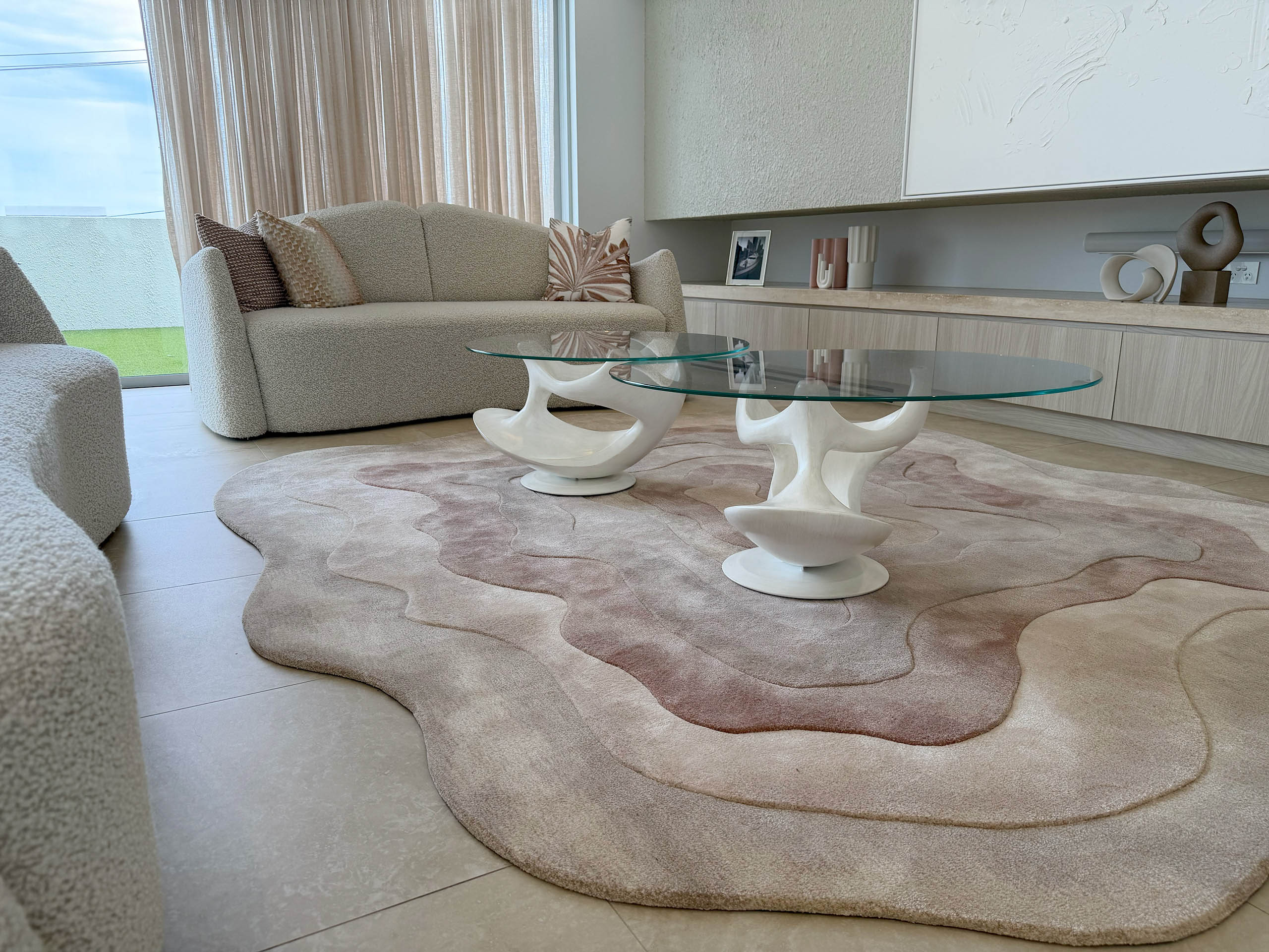 The bespoke Mid Century living room coffee tables are designed to complement the handcrafted floor rug, featuring two circular forms that provide surface space while also serving as a sculptural focal point in a Mid Century interior. Each table includes a clear glass top with a bevelled edge, reflecting the craftsmanship of luxury interior designer and furniture manufacturer Mark Alexander.