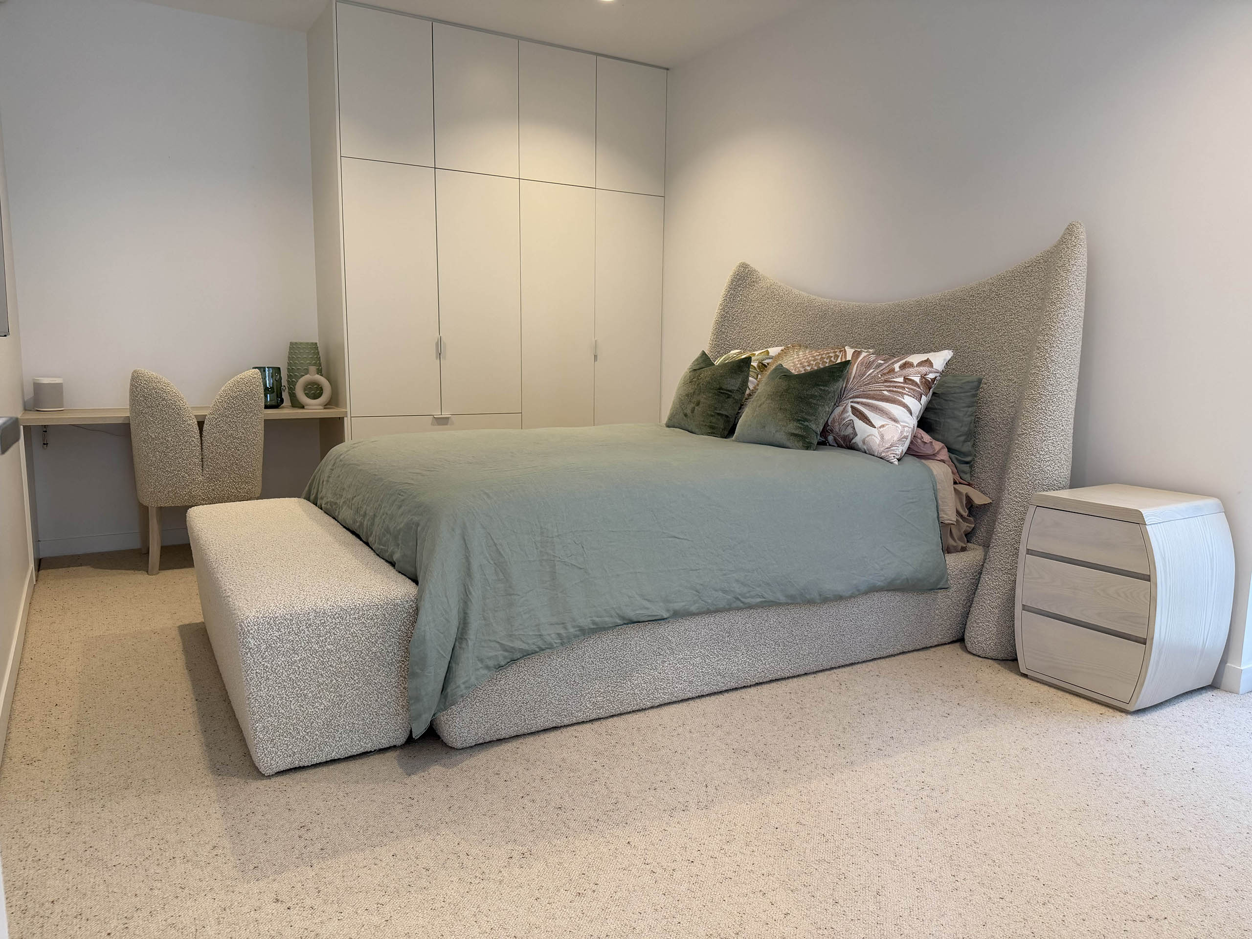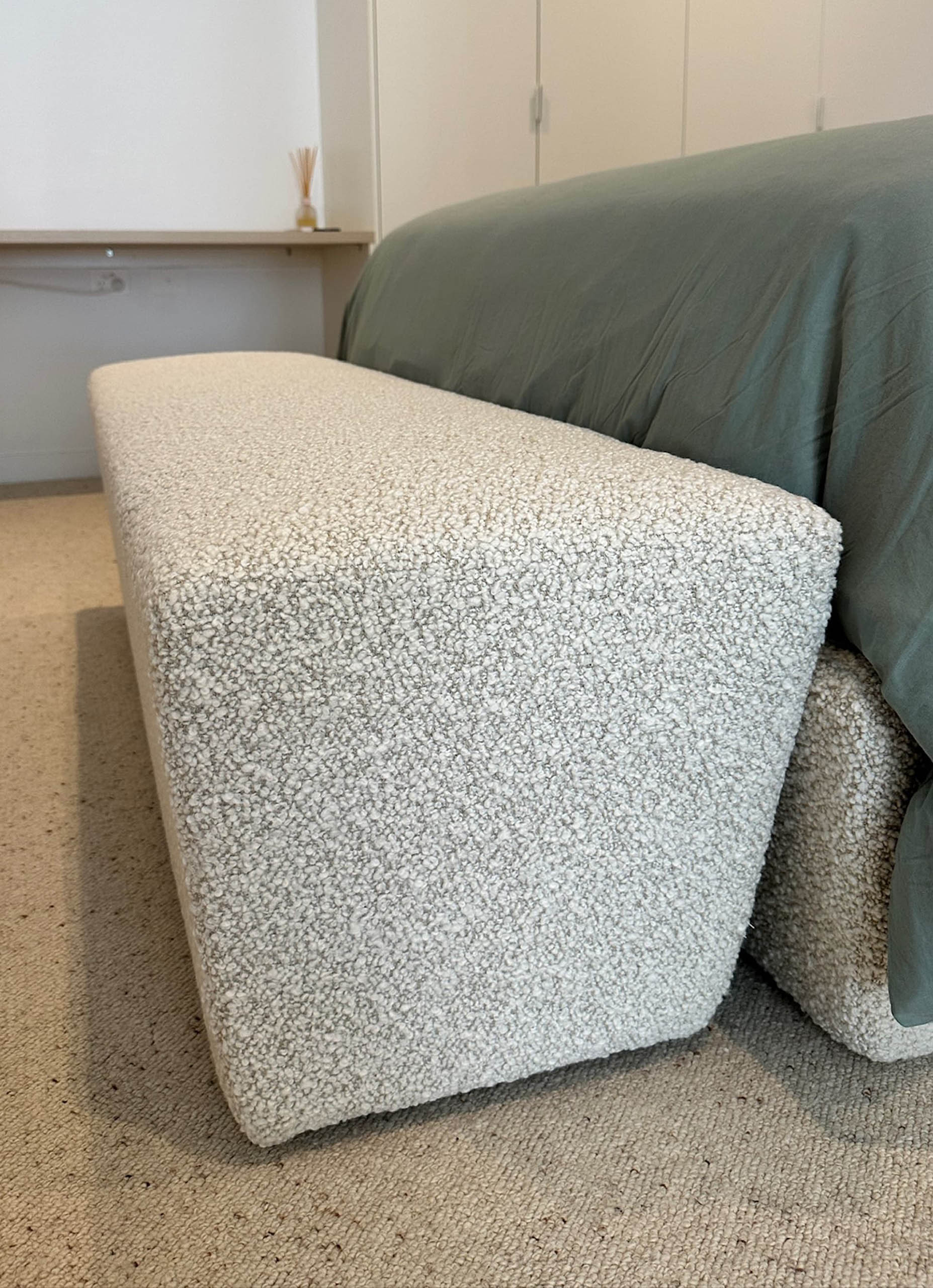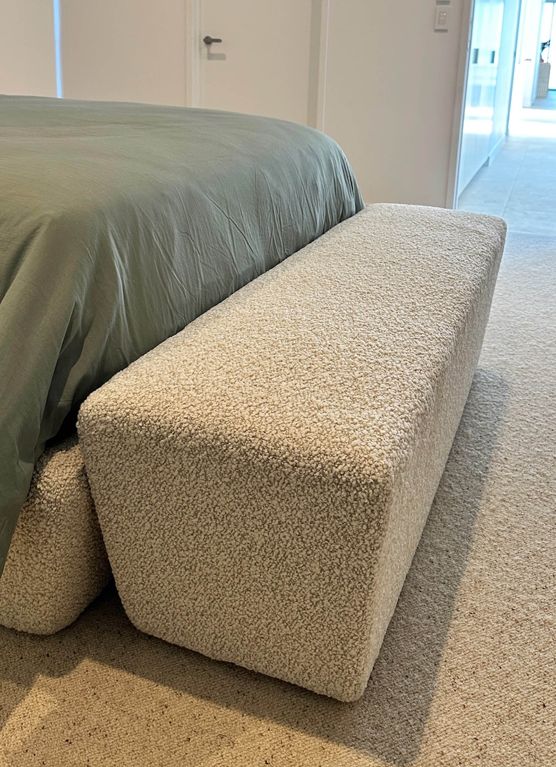 The bespoke Mid Century ottoman is custom made to complement the queen size bedhead and base, reflecting the same modern design and architectural harmony. Handcrafted for both comfort and sculptural presence, it is designed by luxury interior designer and furniture manufacturer Mark Alexander.
