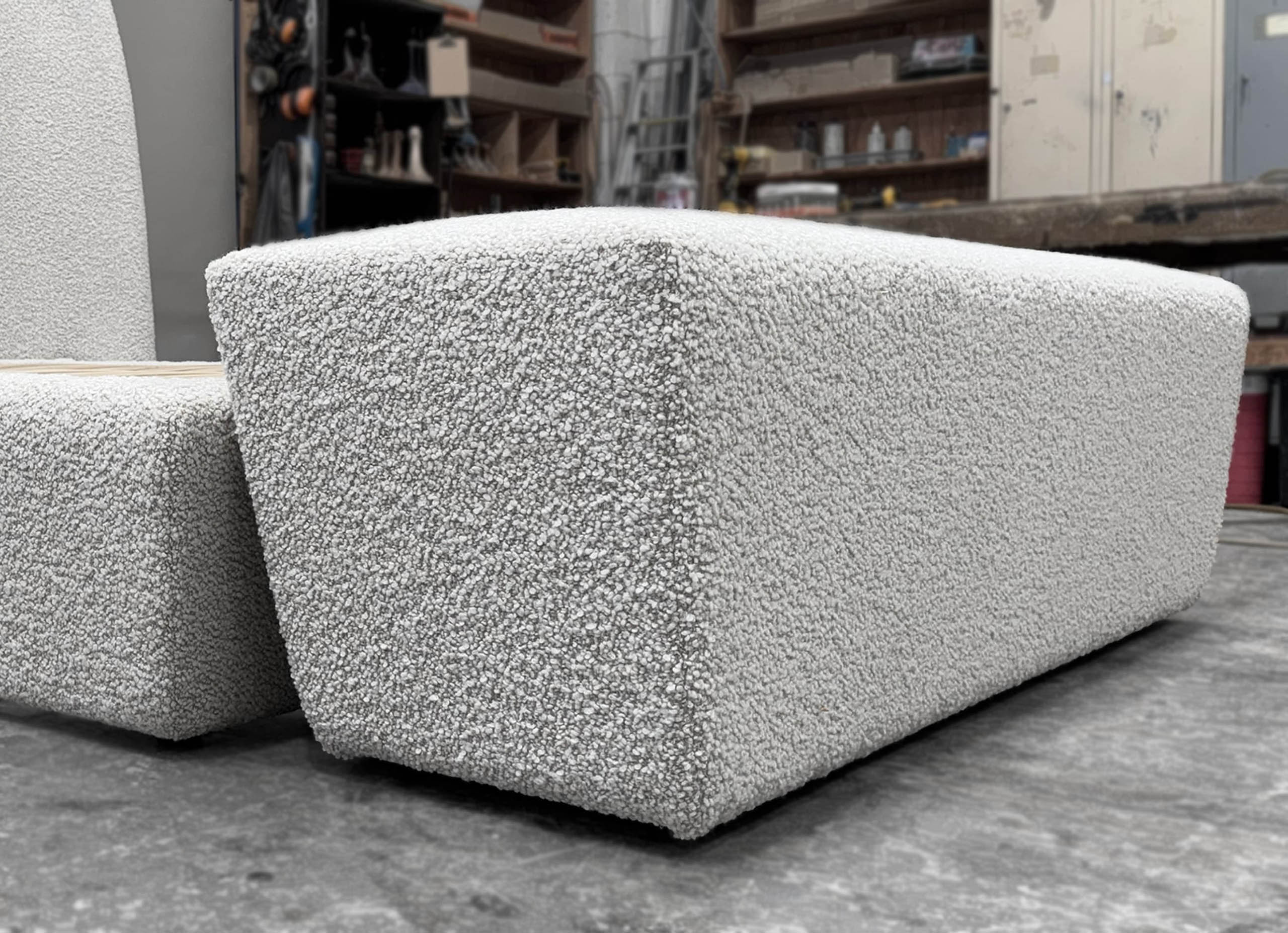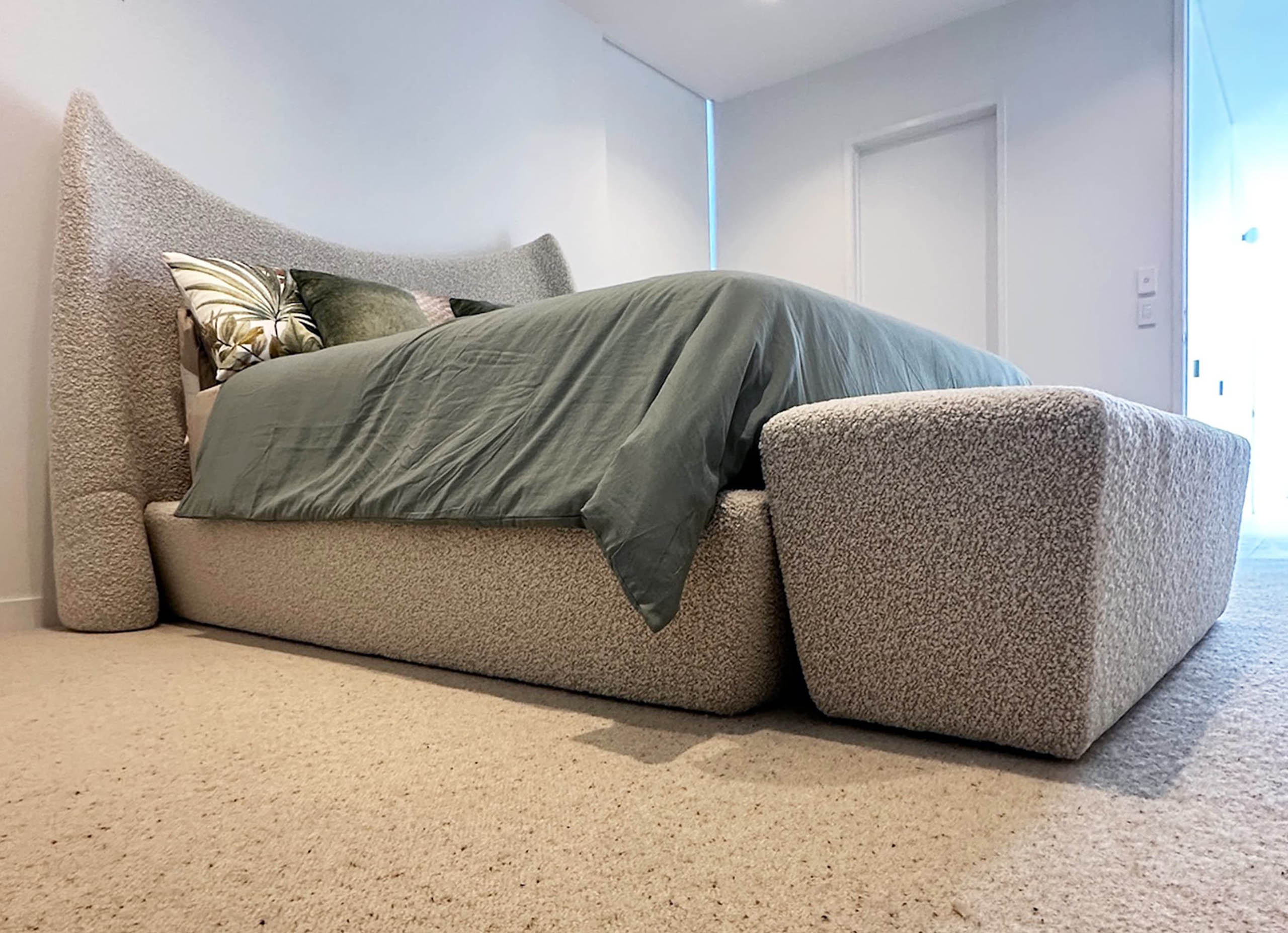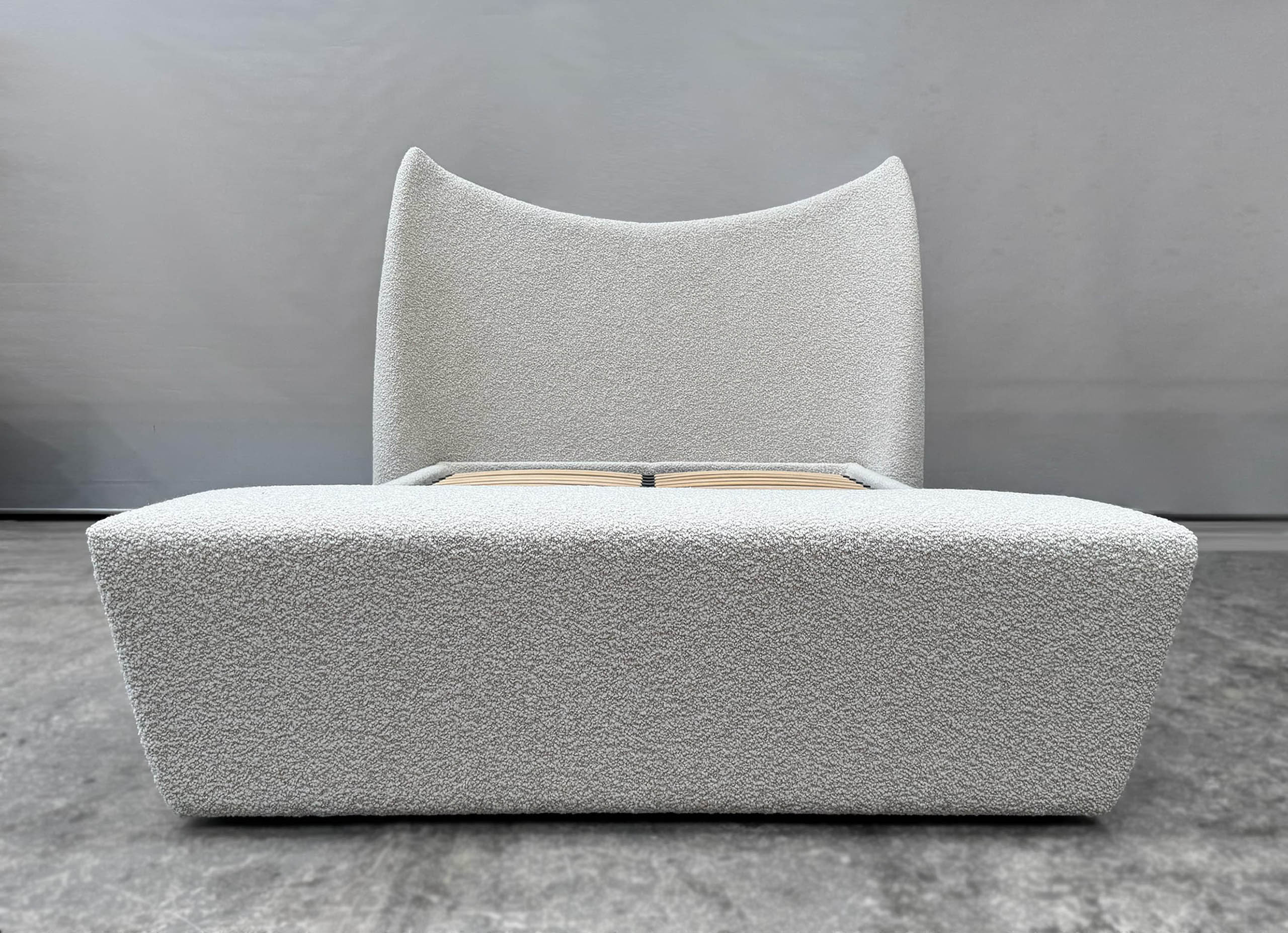 The bespoke Mid Century ottoman is custom made to complement the queen size bedhead and base, reflecting the same modern design and architectural harmony. Handcrafted for both comfort and sculptural presence, it is designed by luxury interior designer and furniture manufacturer Mark Alexander.