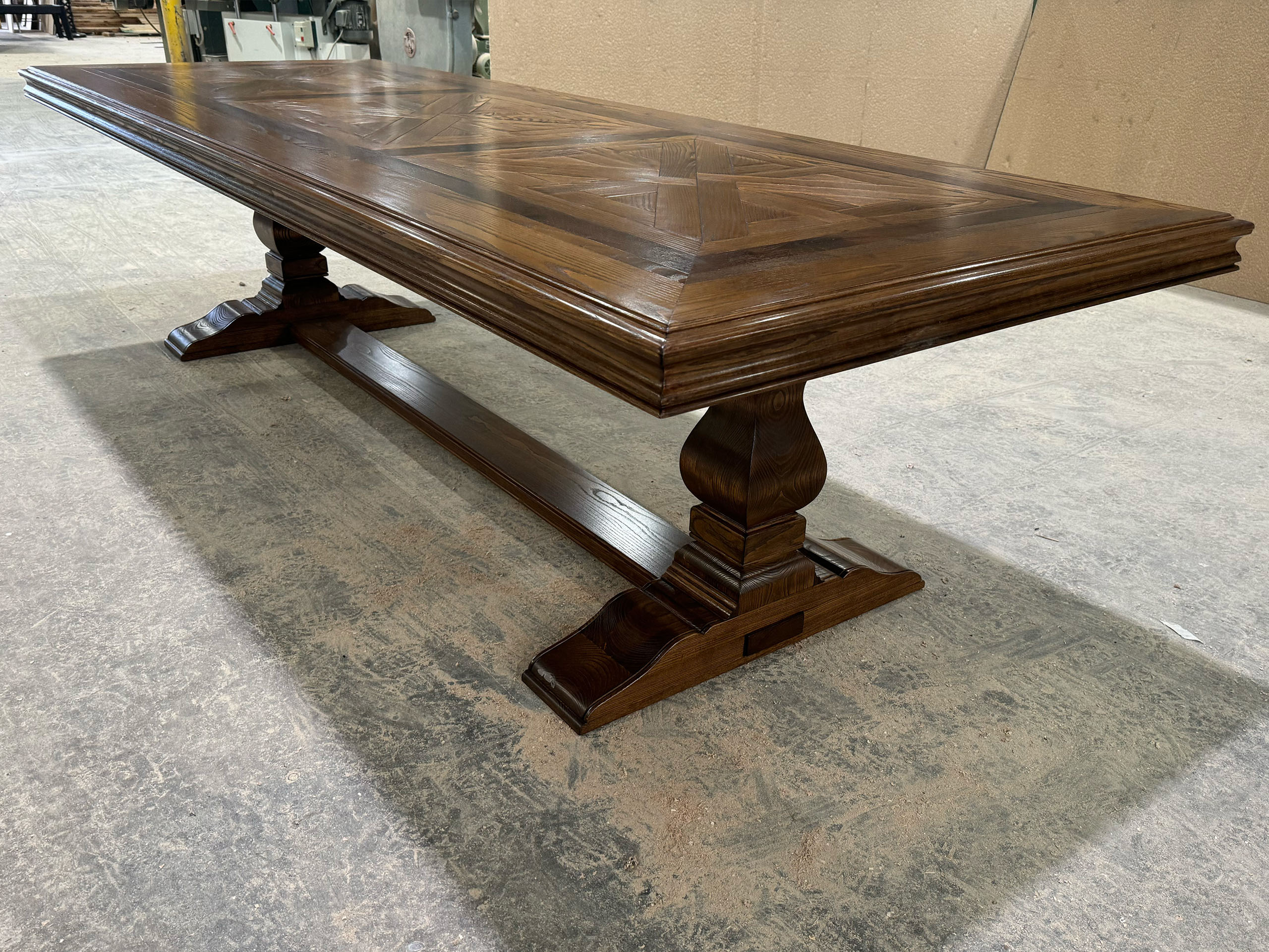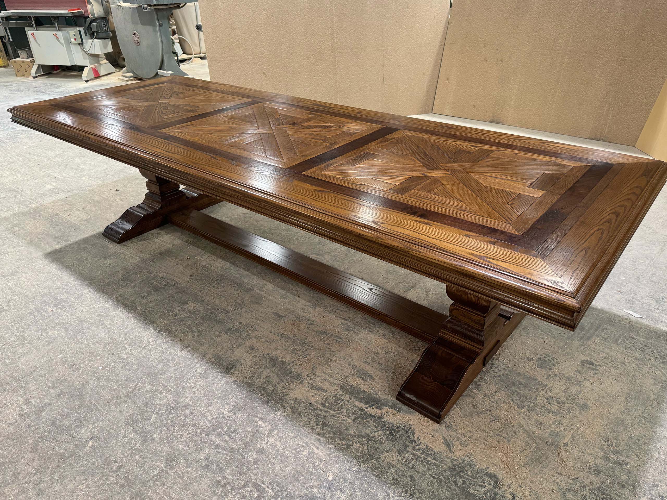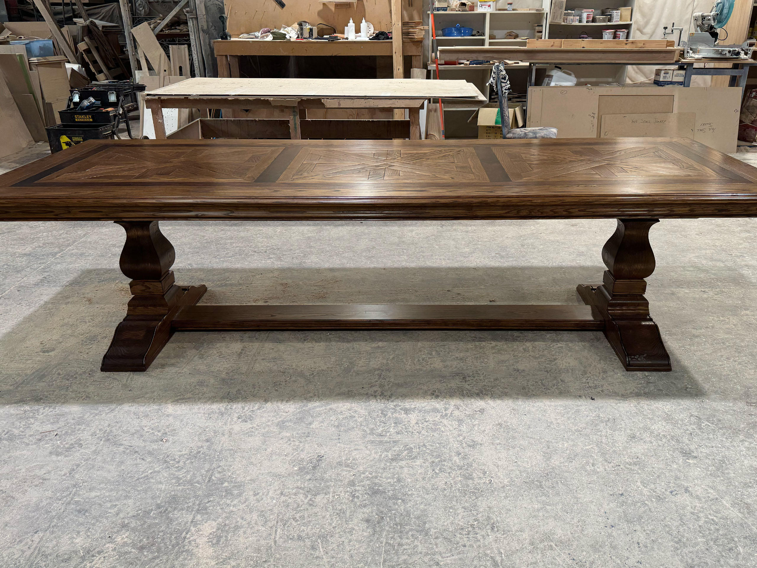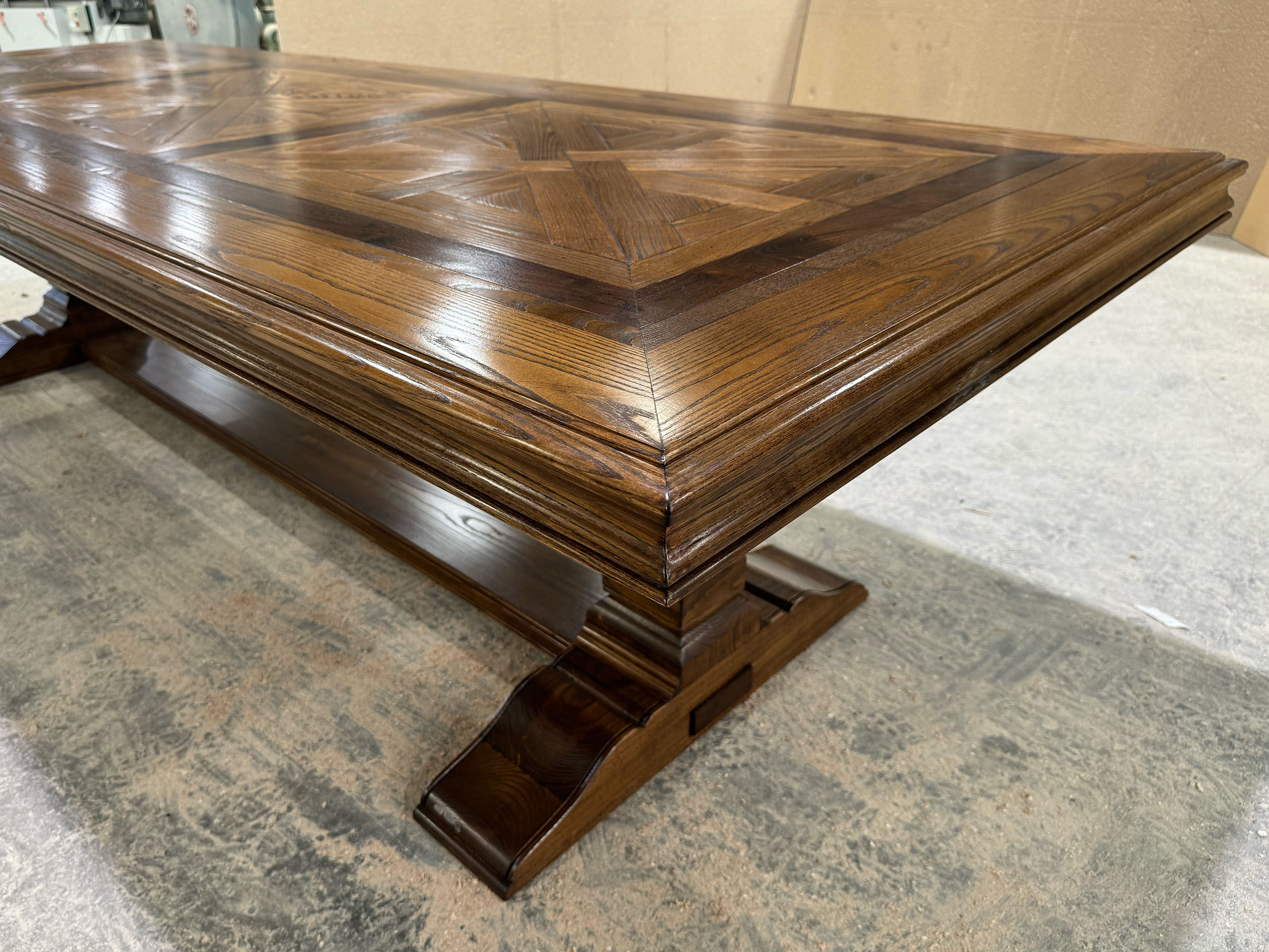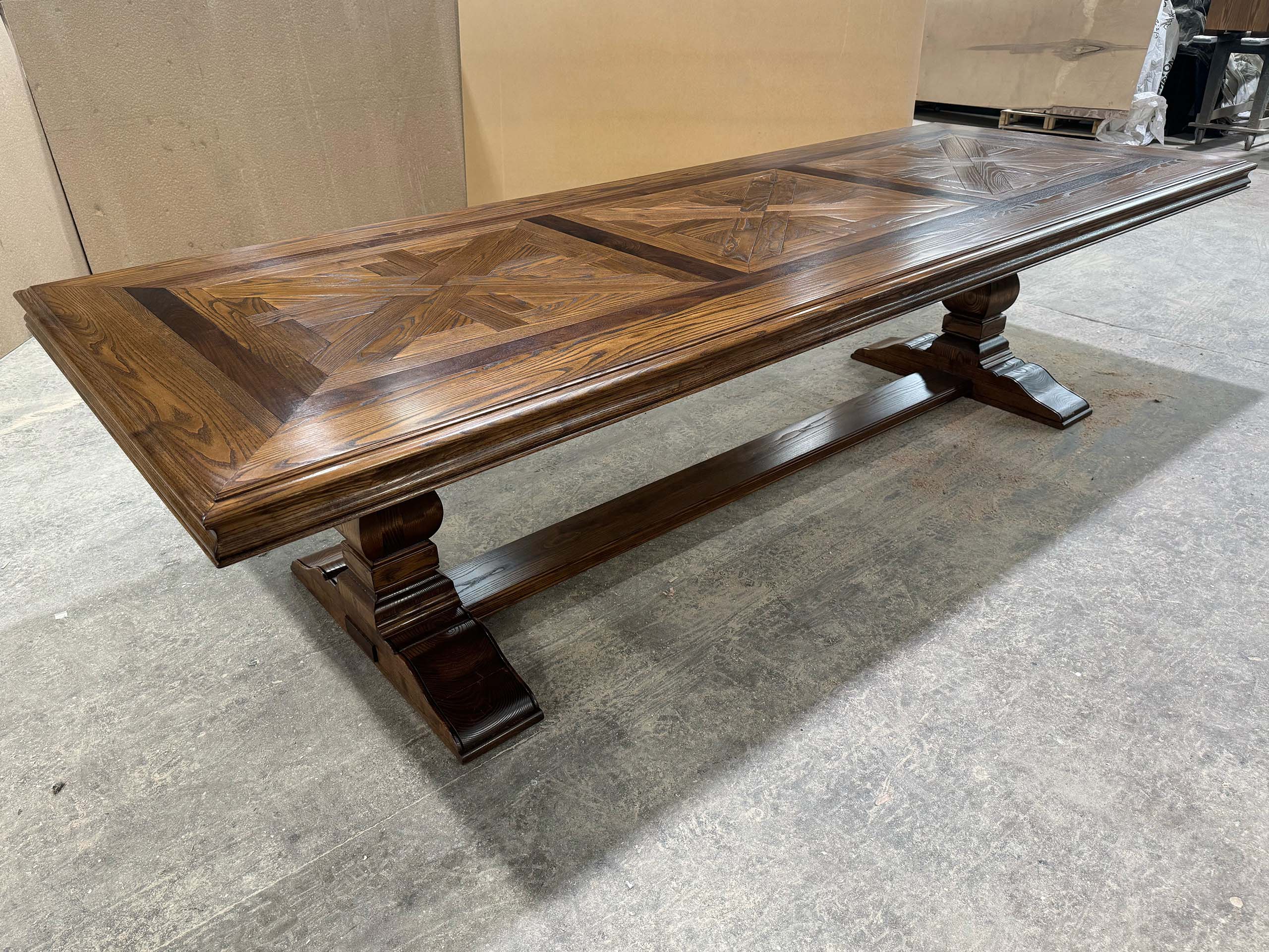 Luxury interior and furniture designer Mark Alexander created this bespoke French parquetry dining table, designed to enhance and complement the client’s home. Crafted from solid oak timber, this sturdy dining table features a pedestal base at each end with a stretcher, and a beautifully intricate wood inlay pattern on the tabletop. Finished with a high-quality stain, it is custom made to your specifications.