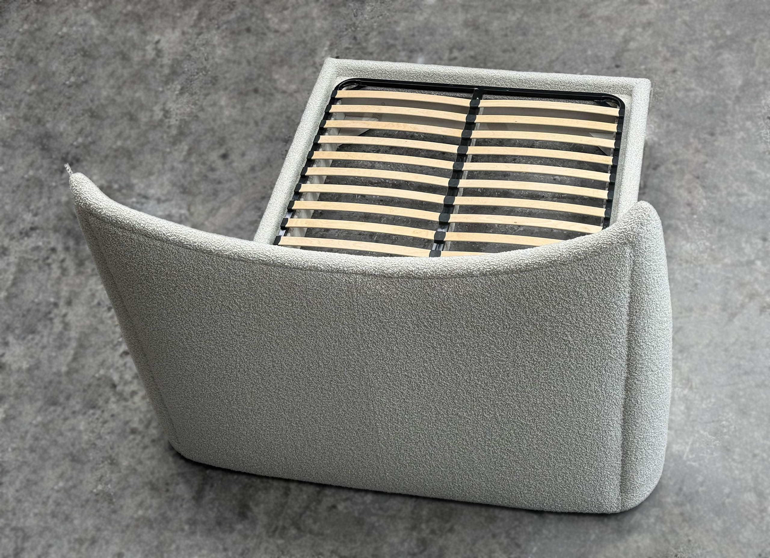 The bespoke queen size bedhead and base are custom made to harmonise with the sofa and the home’s architecture. Designed with a Mid Century aesthetic in mind, they provide both comfort and sculptural elegance, handcrafted by luxury interior designer and furniture manufacturer Mark Alexander.