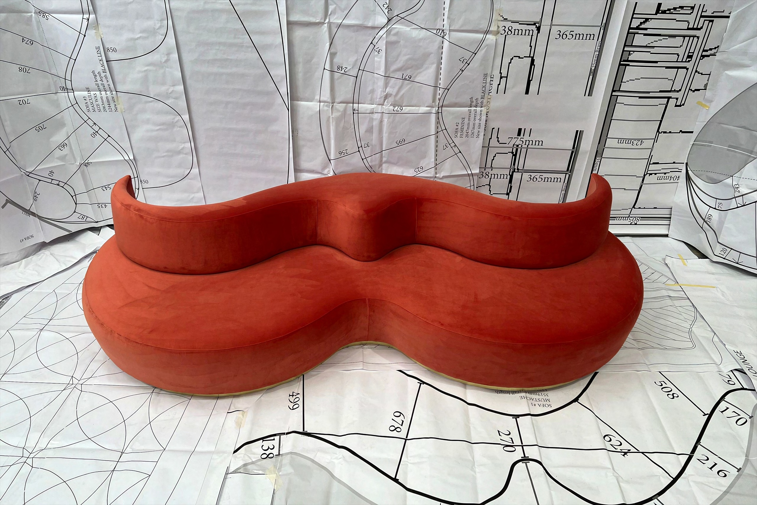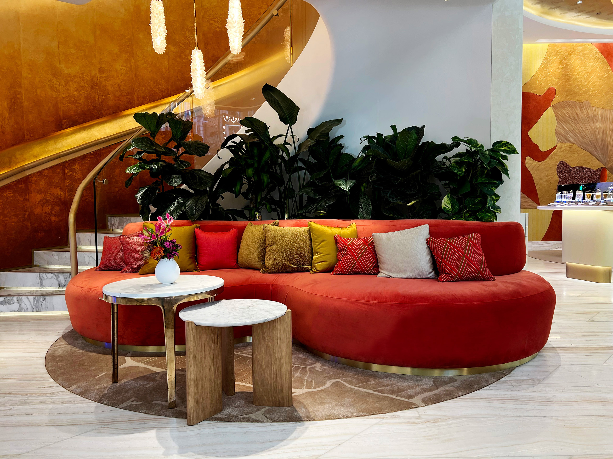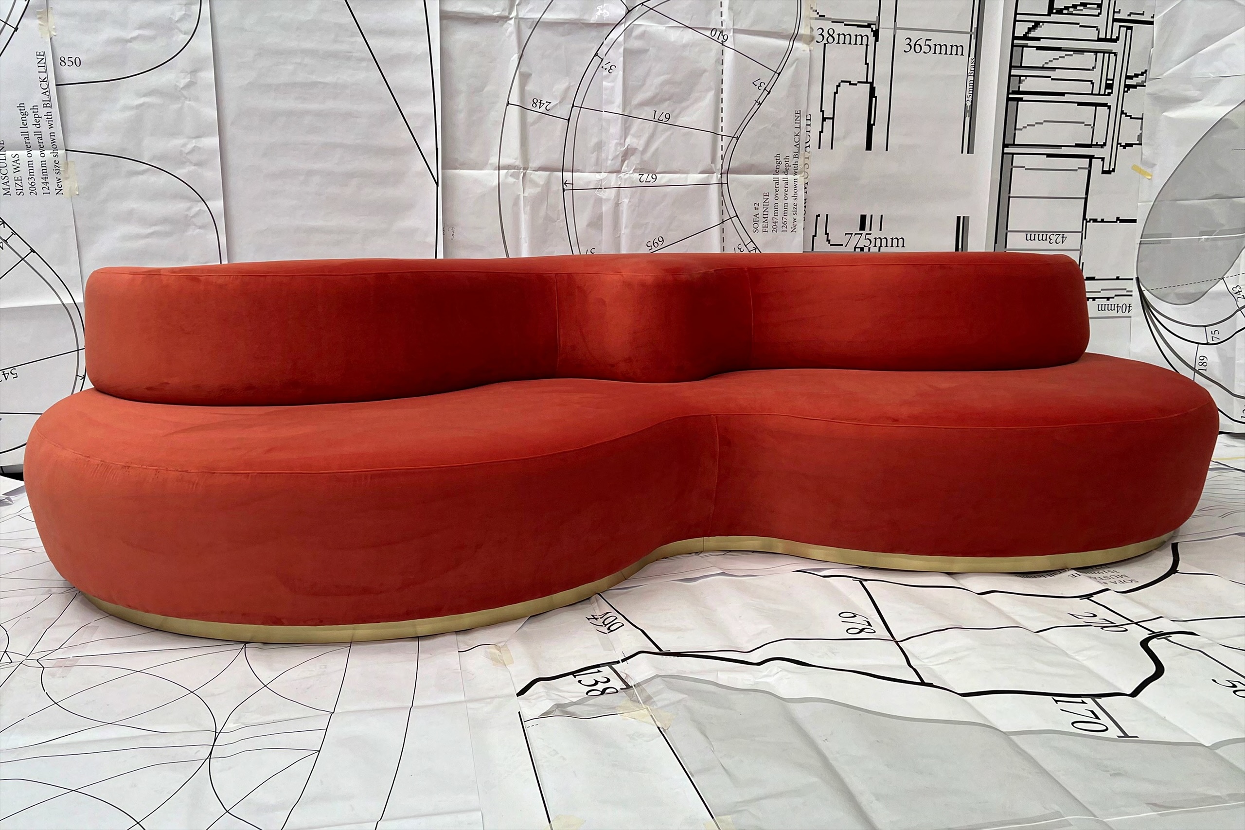 A custom made Mid Century sofa for Cartier in a ‘moustache’ shape, featuring a unique curved backrest inspired by architectural elements of the client’s building. Upholstered in rich red velvet and finished with nine MA signature scatter cushions that coordinate with the sofa’s brass base trim, this piece has been sculpted to fit along a garden bed within Cartier’s new Oceania Boutique in Sydney—part of Mark Alexander’s luxury commercial projects.