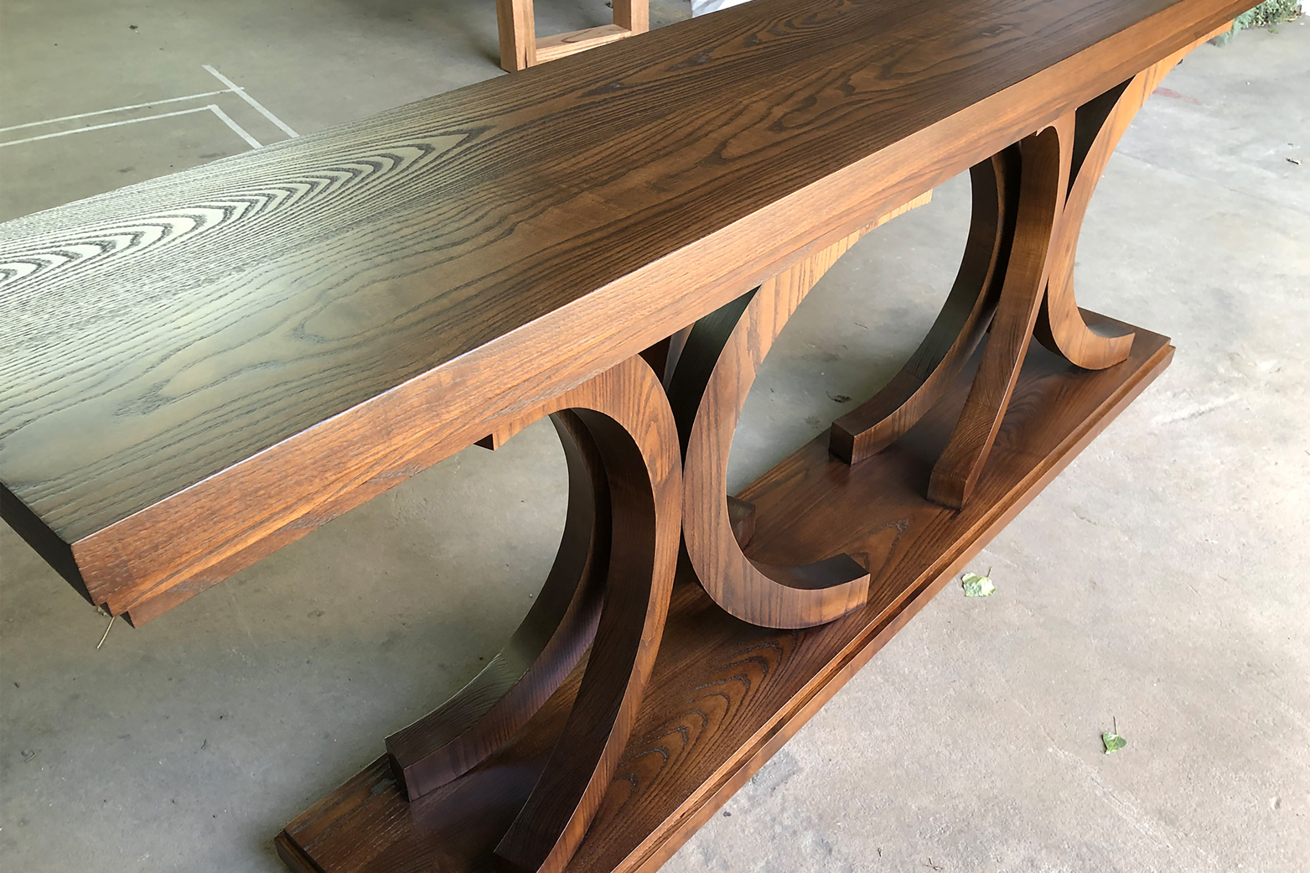 Custom designed and made feature entrance console table, crafted from stunning American Oak with beautiful character grain throughout. It showcases a unique curved leg design, exclusively sketched and planned by Mark Alexander.
