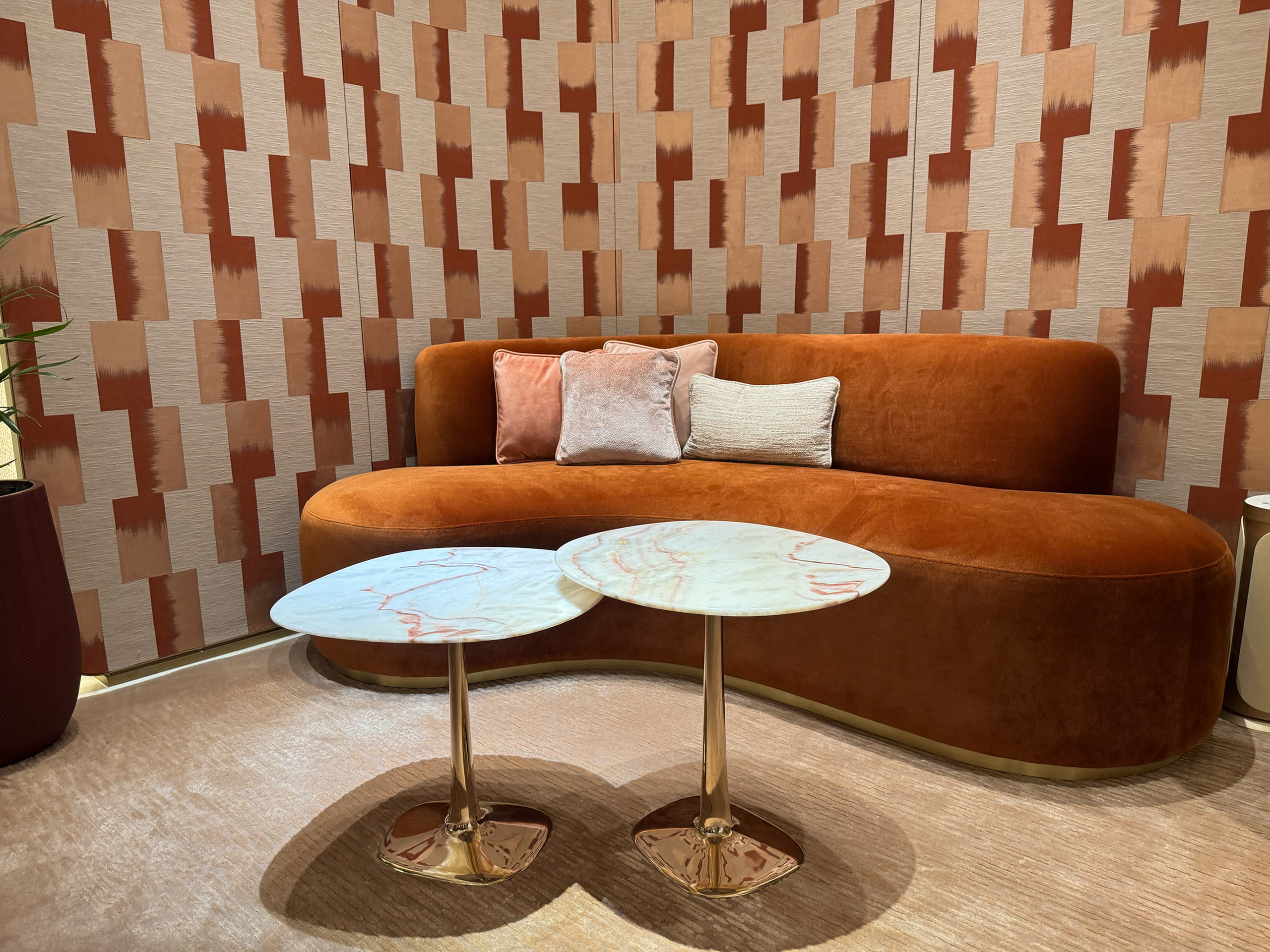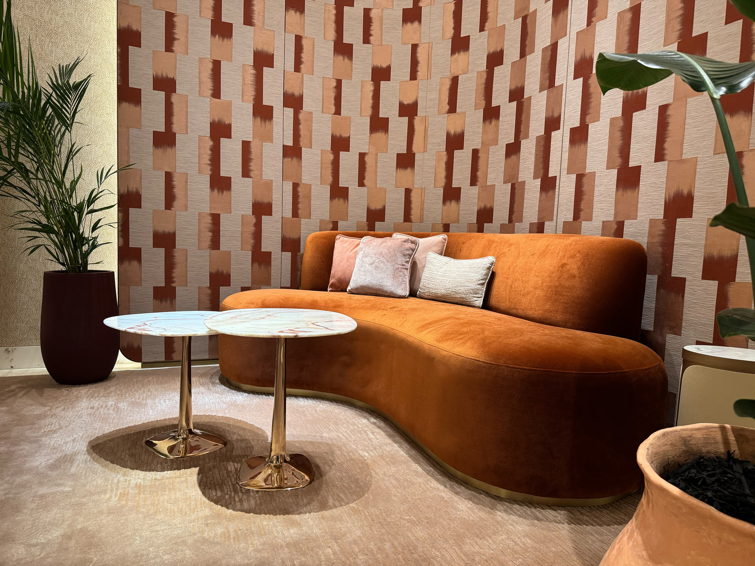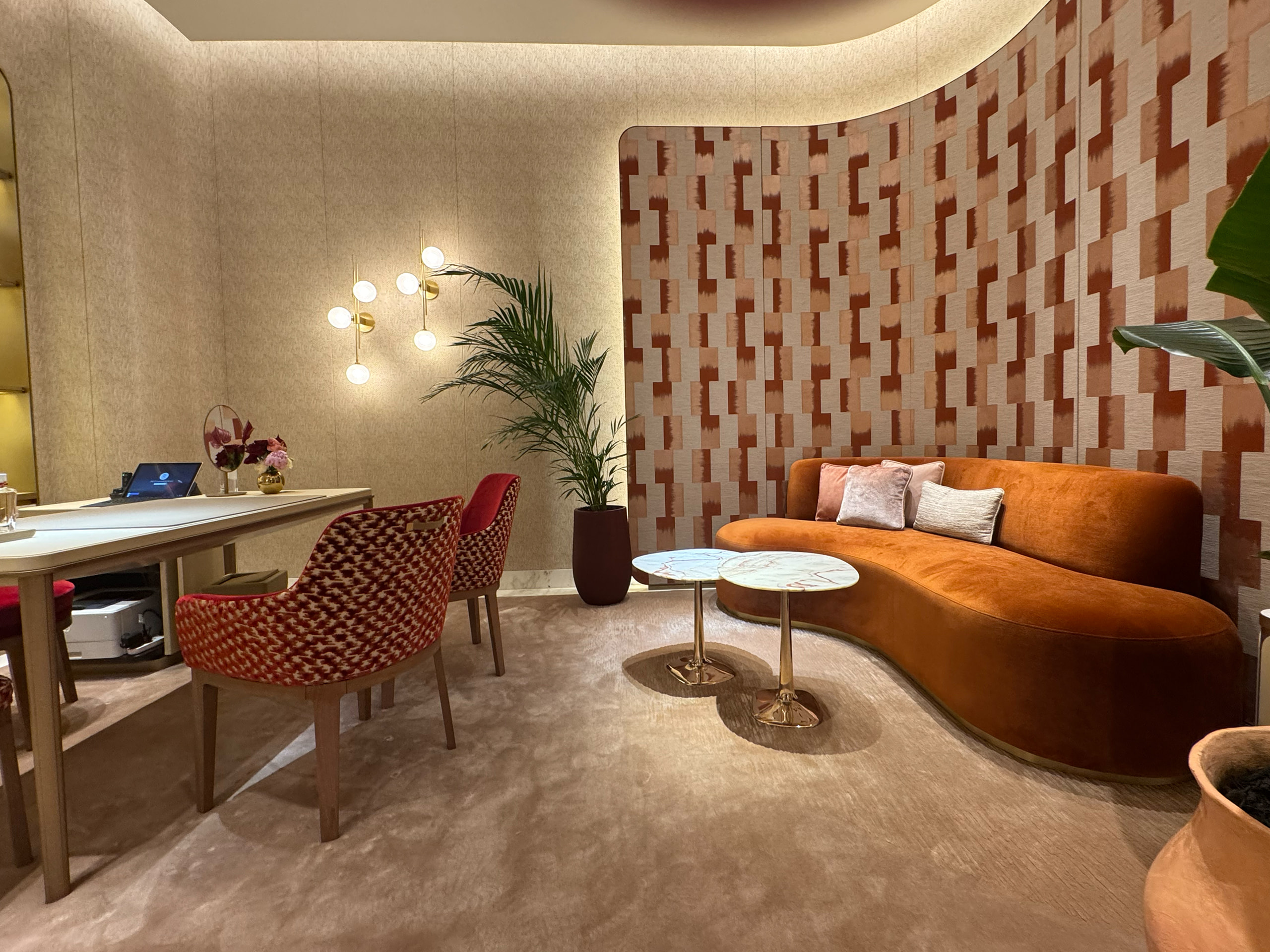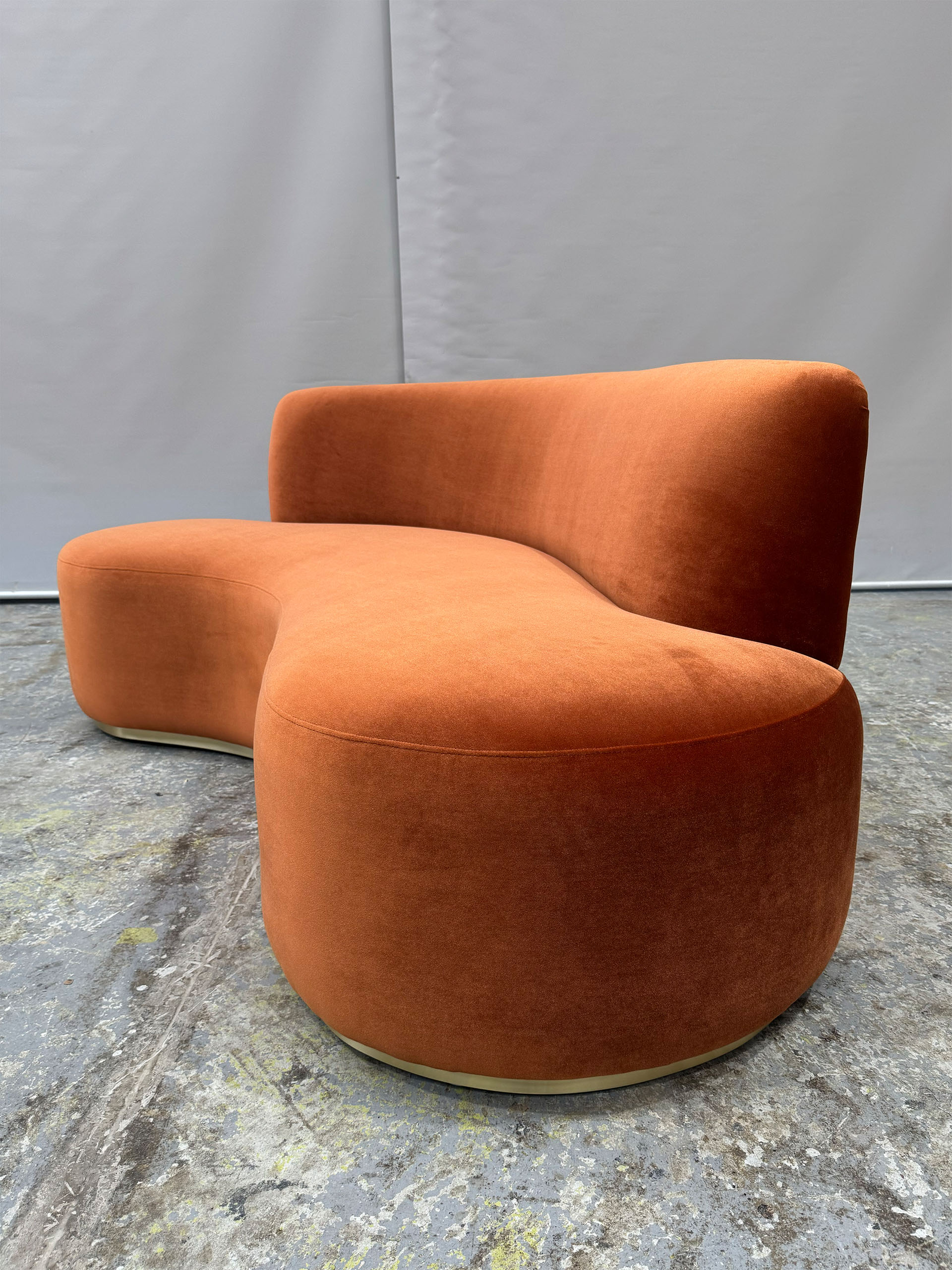 A bold, custom designed Mid Century curved sofa, meticulously crafted and upholstered in luxurious fabric. Featuring a brushed gold brass base, this statement piece is built on a high-quality solid timber framework with premium foam and cushioning for ultimate comfort. Its vibrant colour and soft, rounded shape create a striking centrepiece. Custom made and handcrafted in Australia by luxury interior designer and furniture designer Mark Alexander for Cartier’s new boutique on Collins Street, Melbourne—showcasing his expertise in luxury commercial projects.