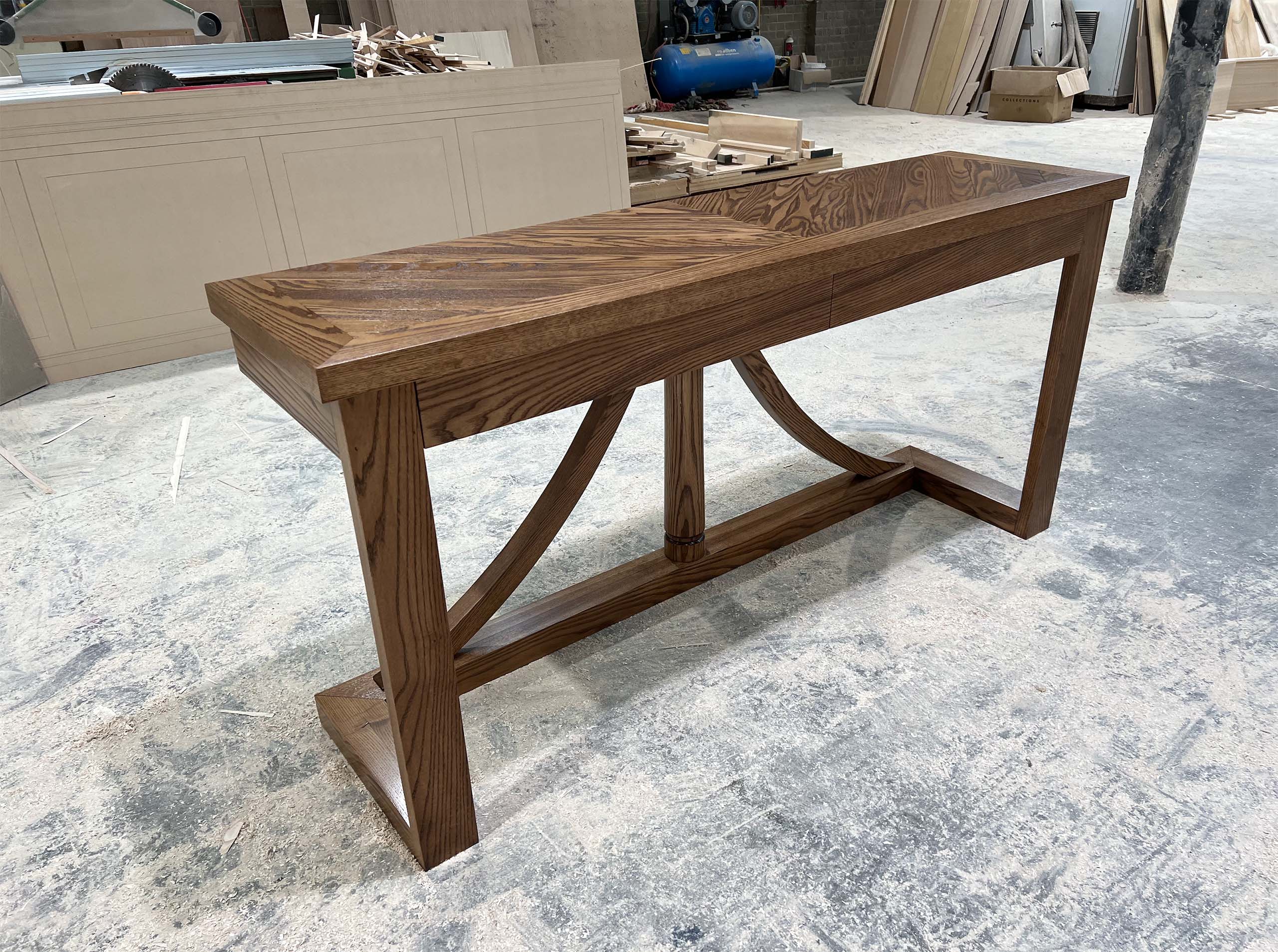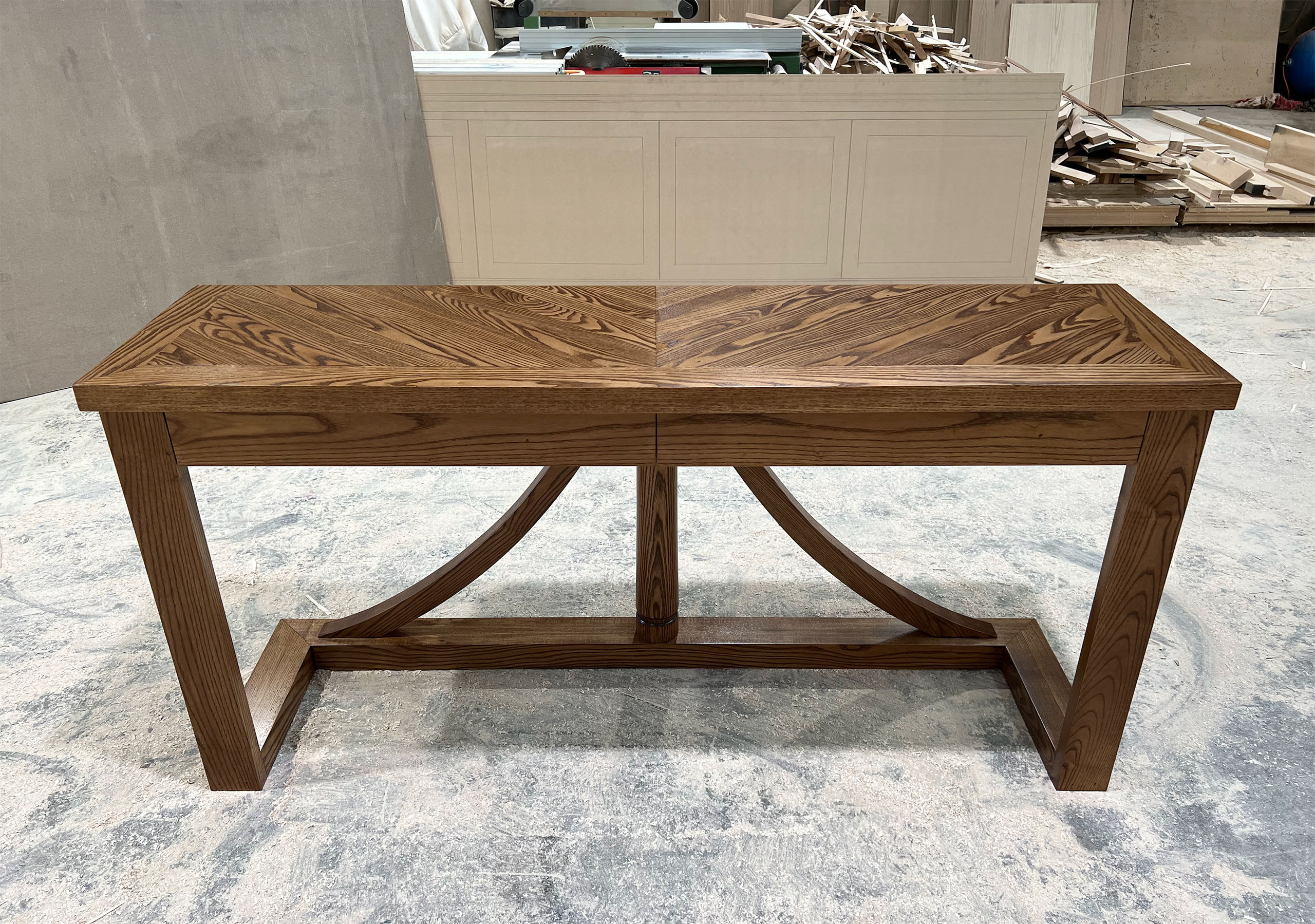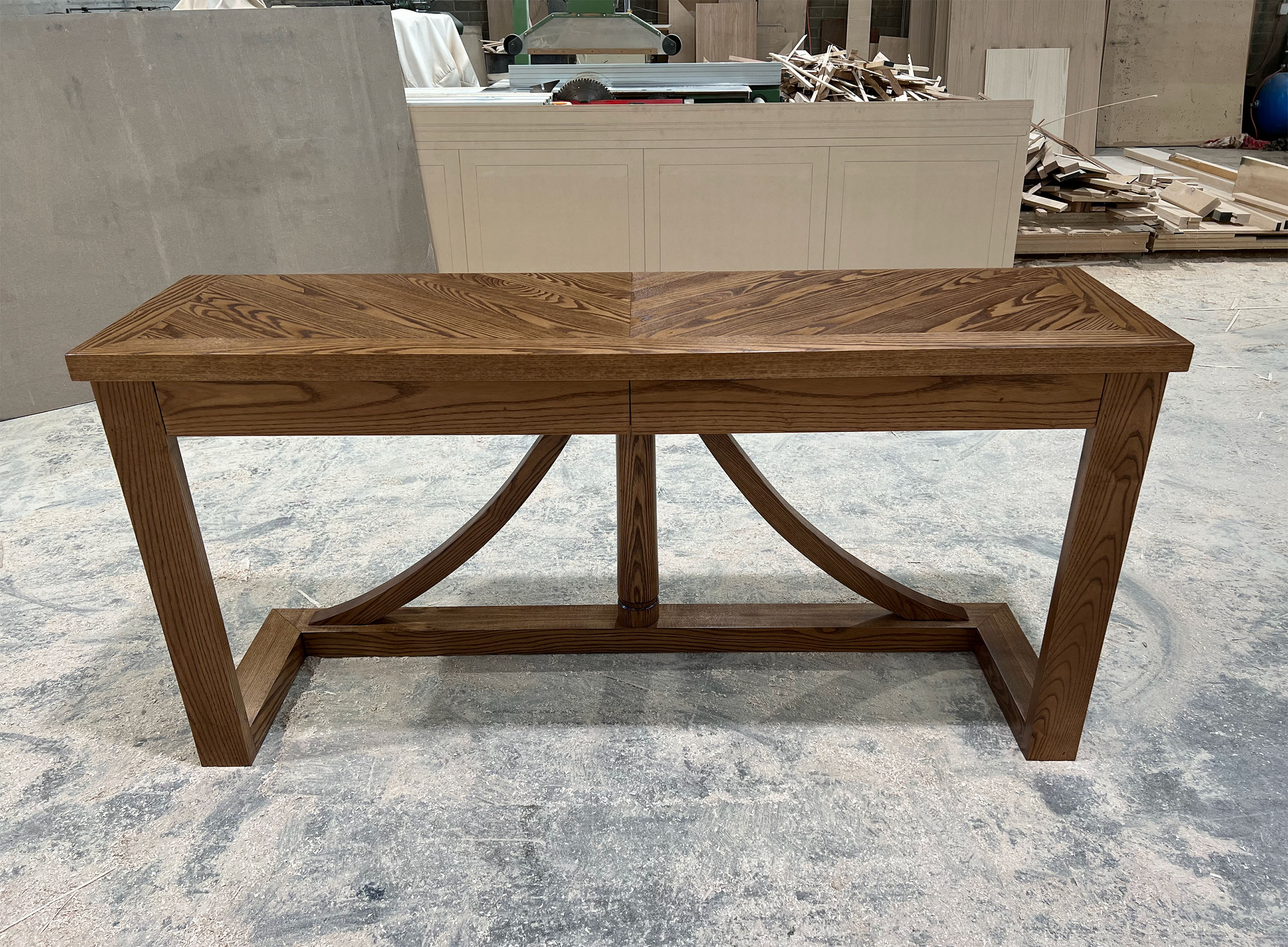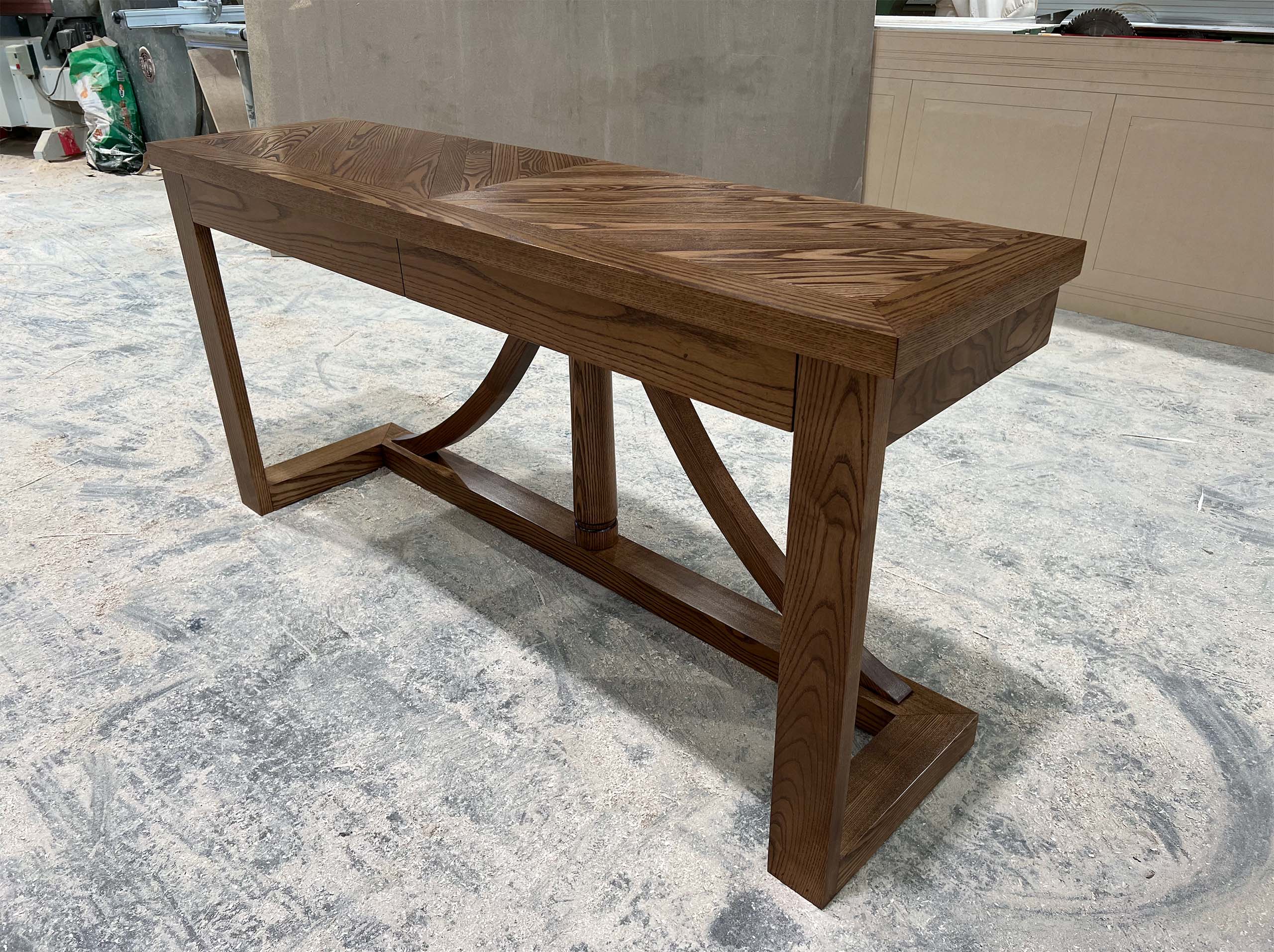 A console table with a unique base, designed, planned, and produced with a modern style, complements the custom-made dining table base. This contemporary piece is crafted from solid oak timbers, with custom dimensions, colours, and finishes available to suit your preferences. The console is custom stained to match the timber floorboards in the home.