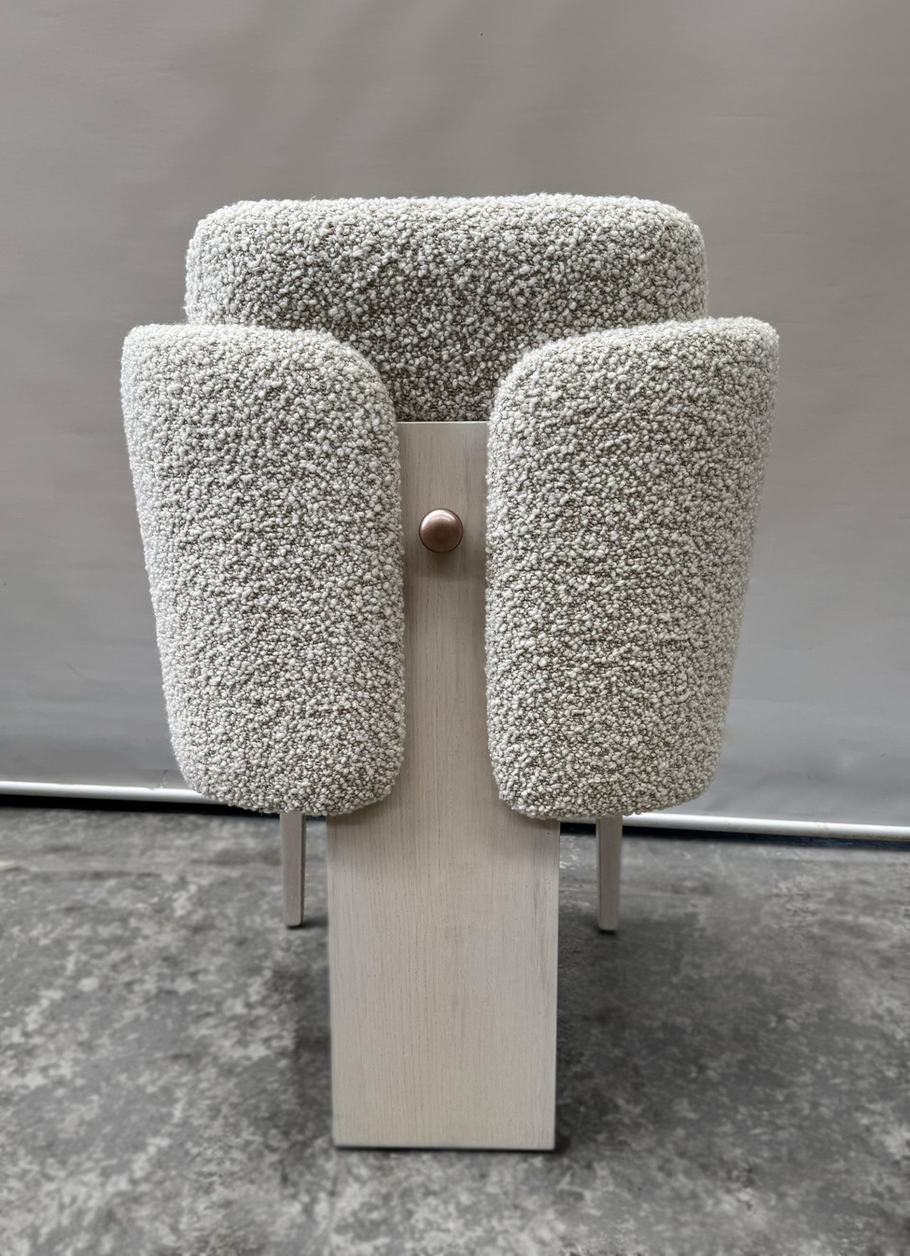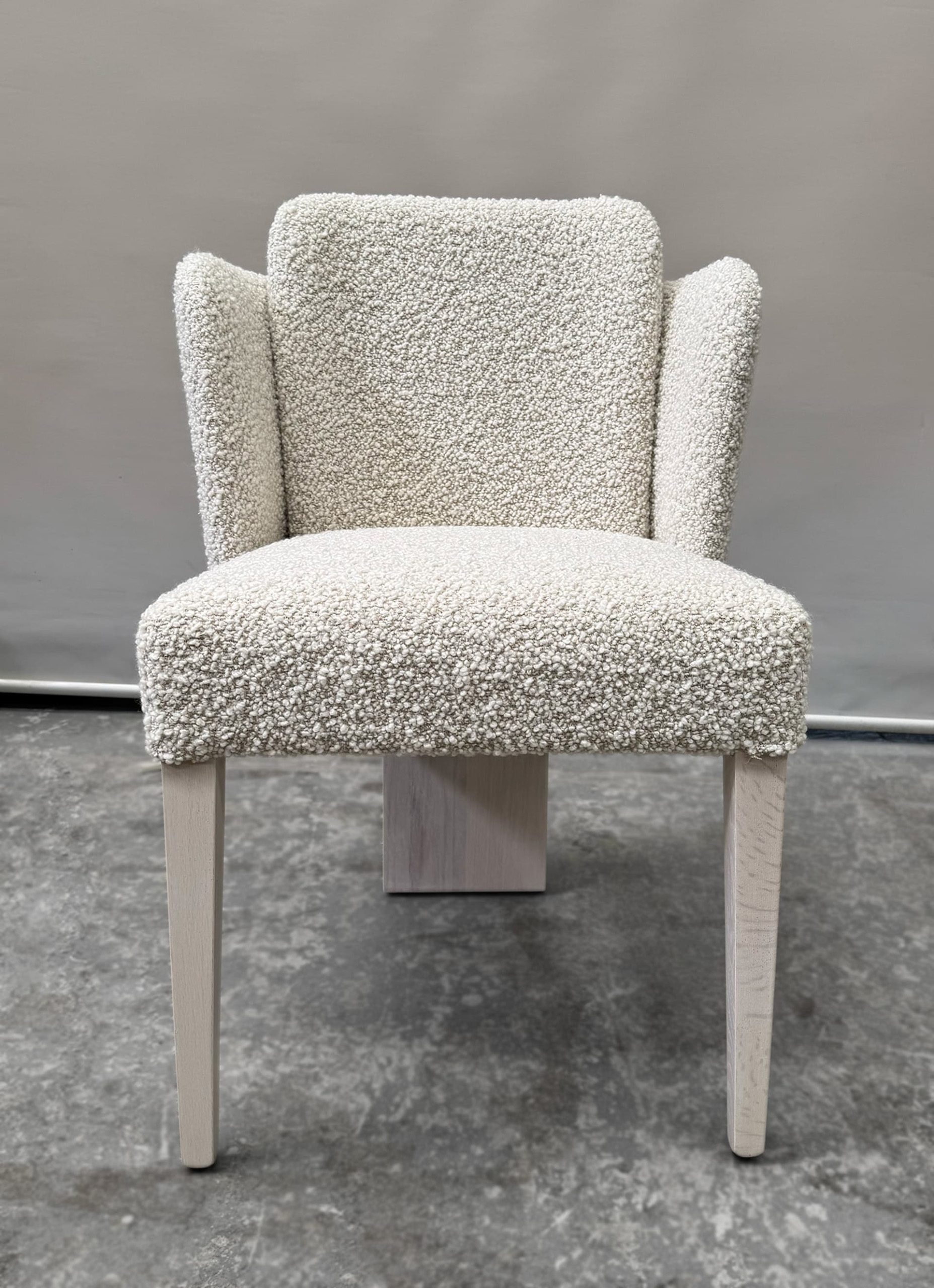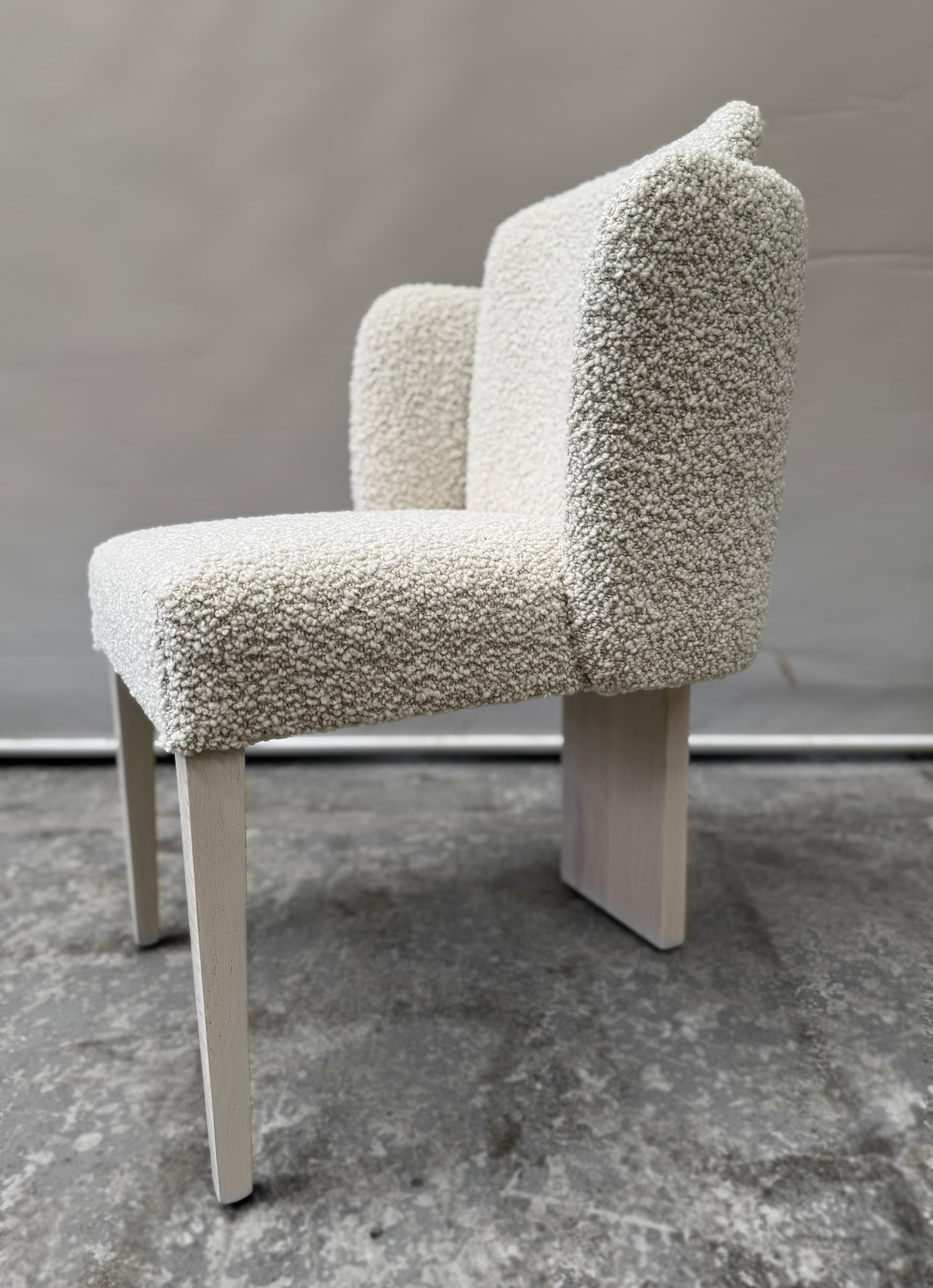 The custom made Mid Century dining chair merges sculptural elegance with ergonomic function. Its enveloping backrest curves gently around the seat, providing excellent support and comfort while introducing a refined, contemporary silhouette. The frame is expertly handcrafted from high-quality solid wood for structural stability and lasting durability. Sleek, tapered legs feature subtle geometric elements, adding depth and sophistication, designed by luxury interior designer and furniture manufacturer Mark Alexander. Perfect for Mid Century interiors.