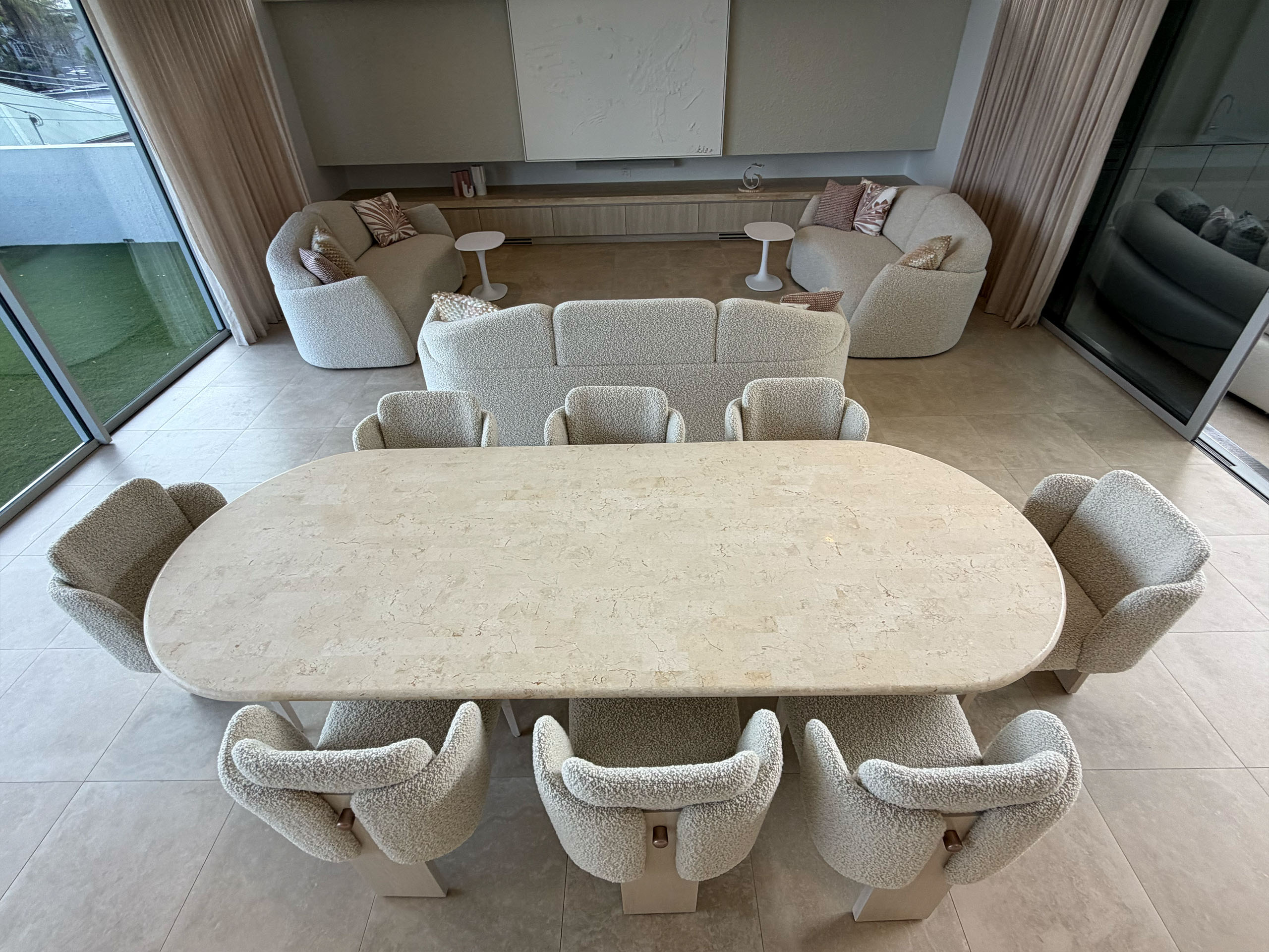 Each dining chair is custom designed and entirely made in Australia to a premium standard of quality and finish. Dimensions, colour, and finish of our luxury furniture can all be custom made to your specific requirements, with a wide range of luxurious fabrics or leathers and frame colour options available.