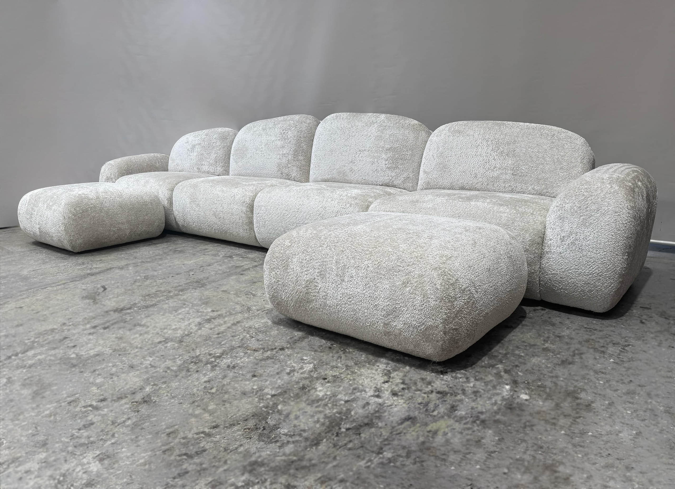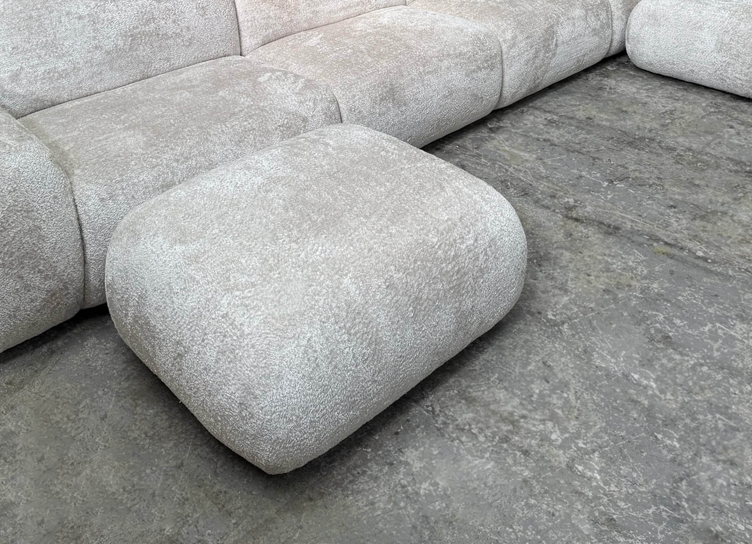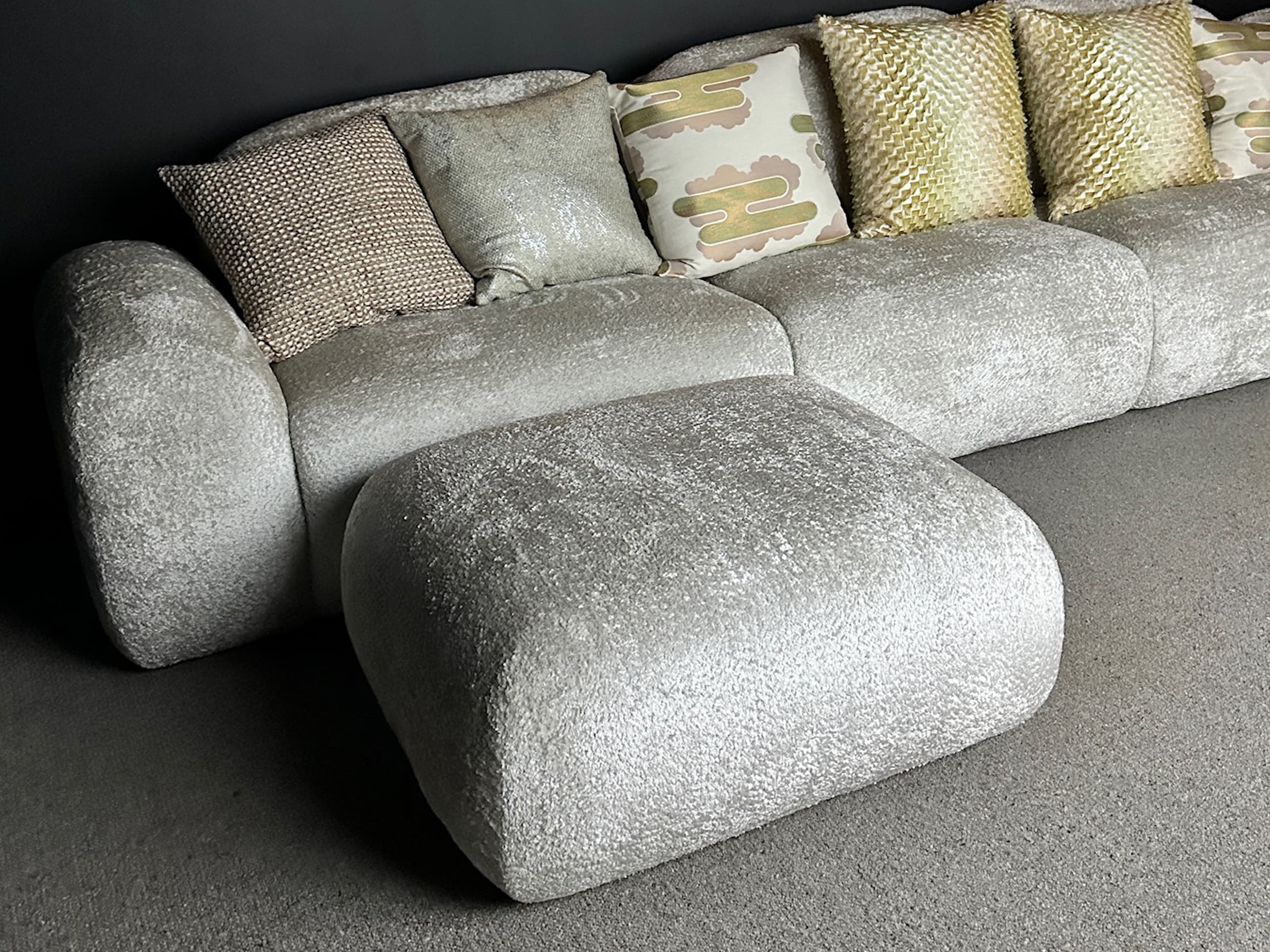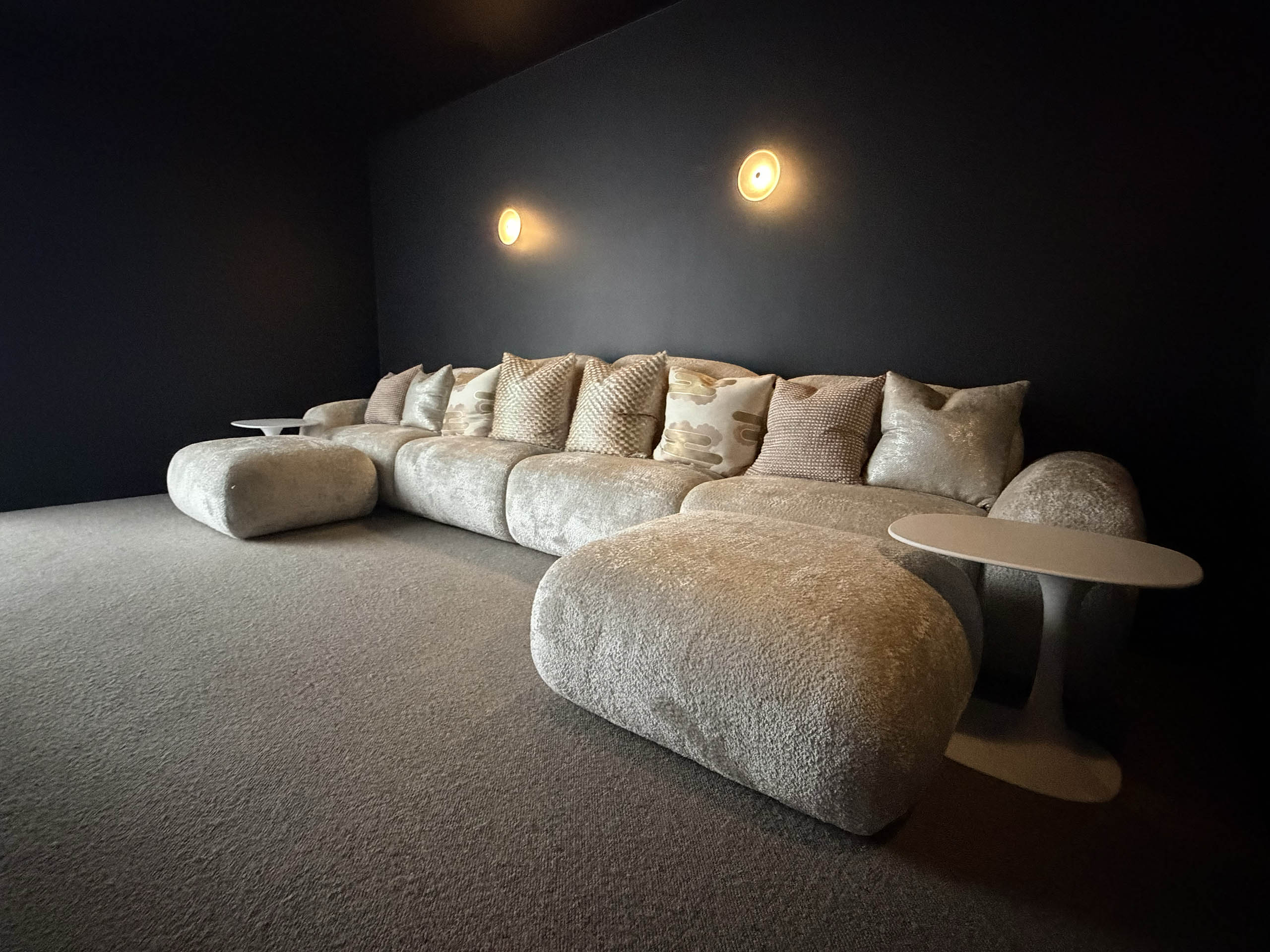 The custom made Mid Century ottoman is designed to complement the home theatre lounge sofa, echoing its sculptural form and modern style. Handcrafted for comfort and visual harmony, it is made by luxury interior designer and furniture manufacturer Mark Alexander.