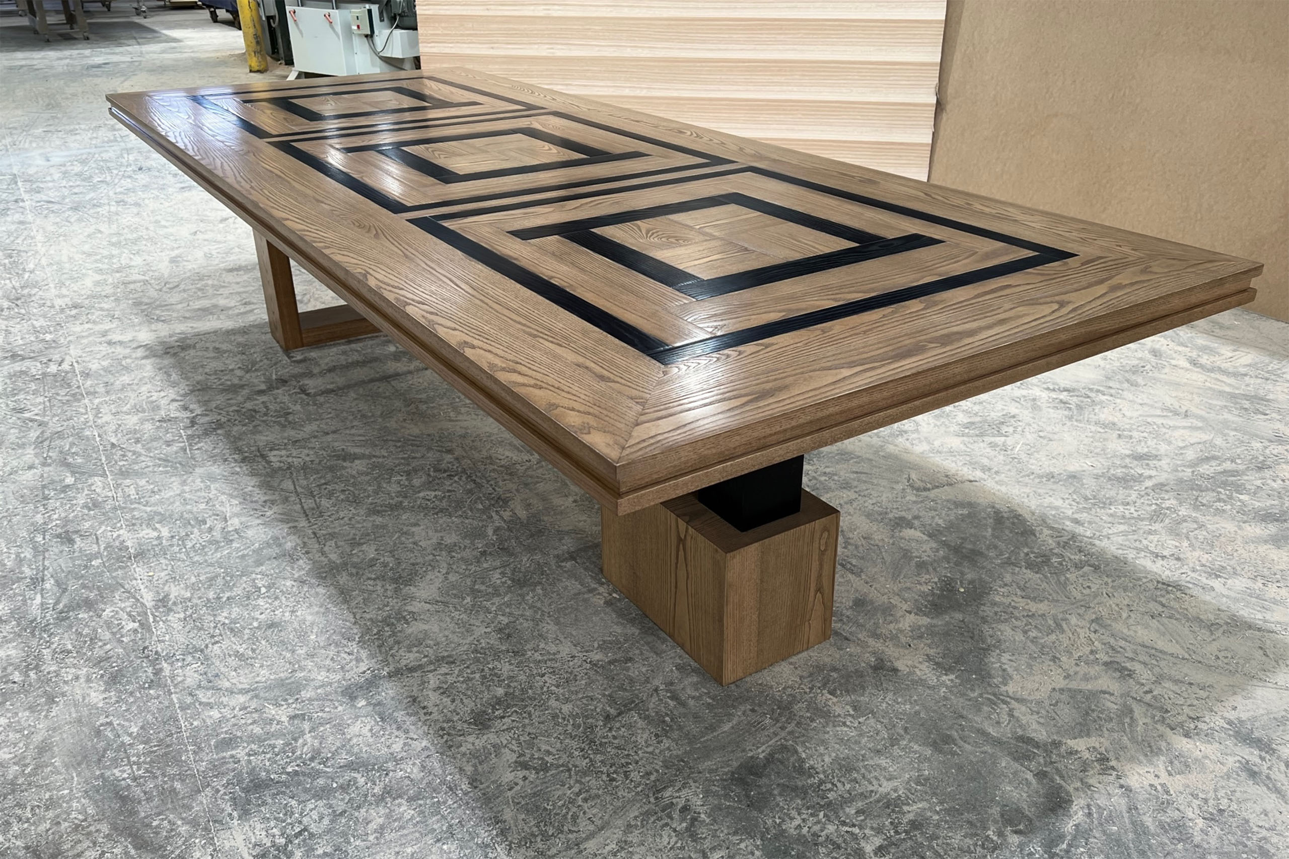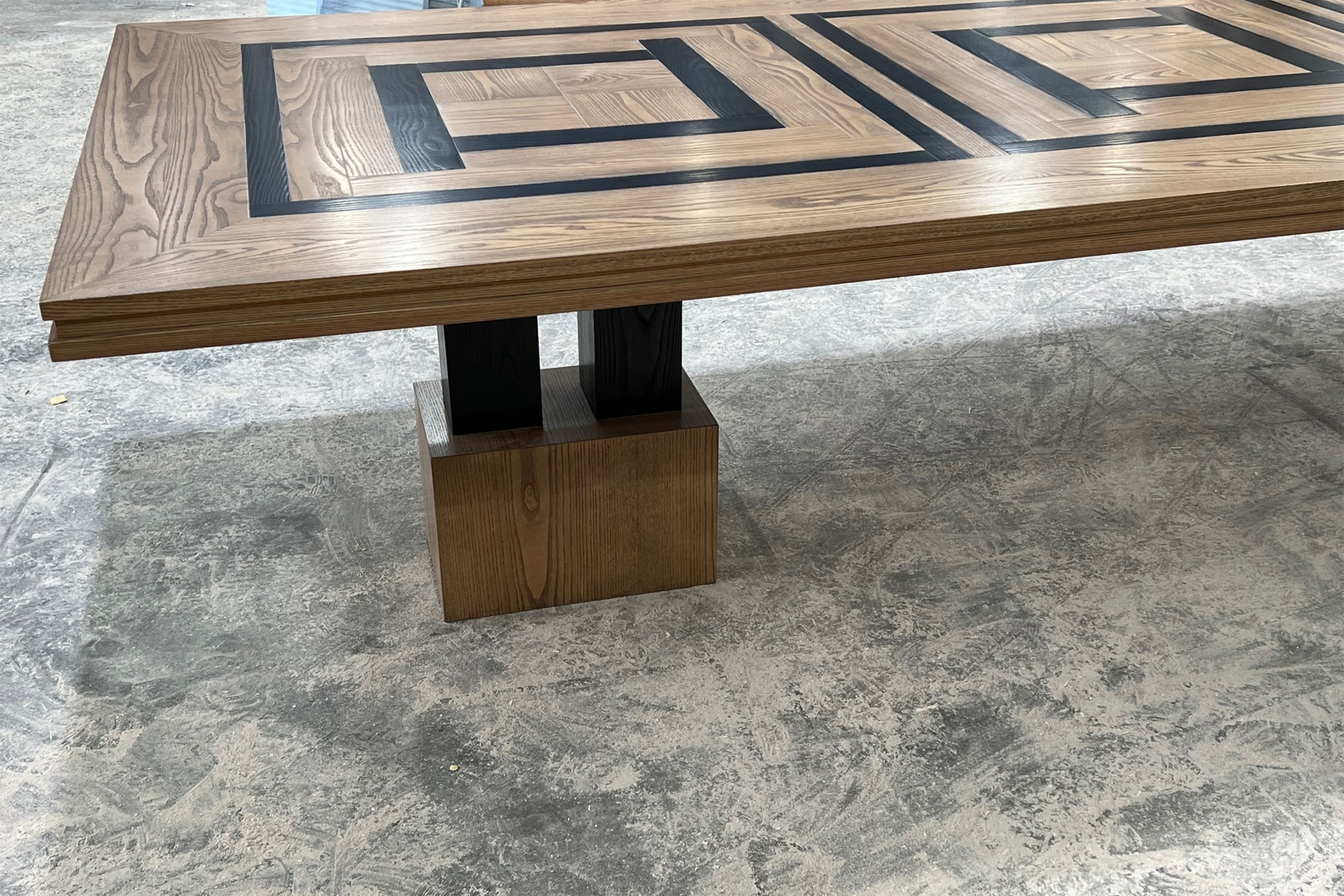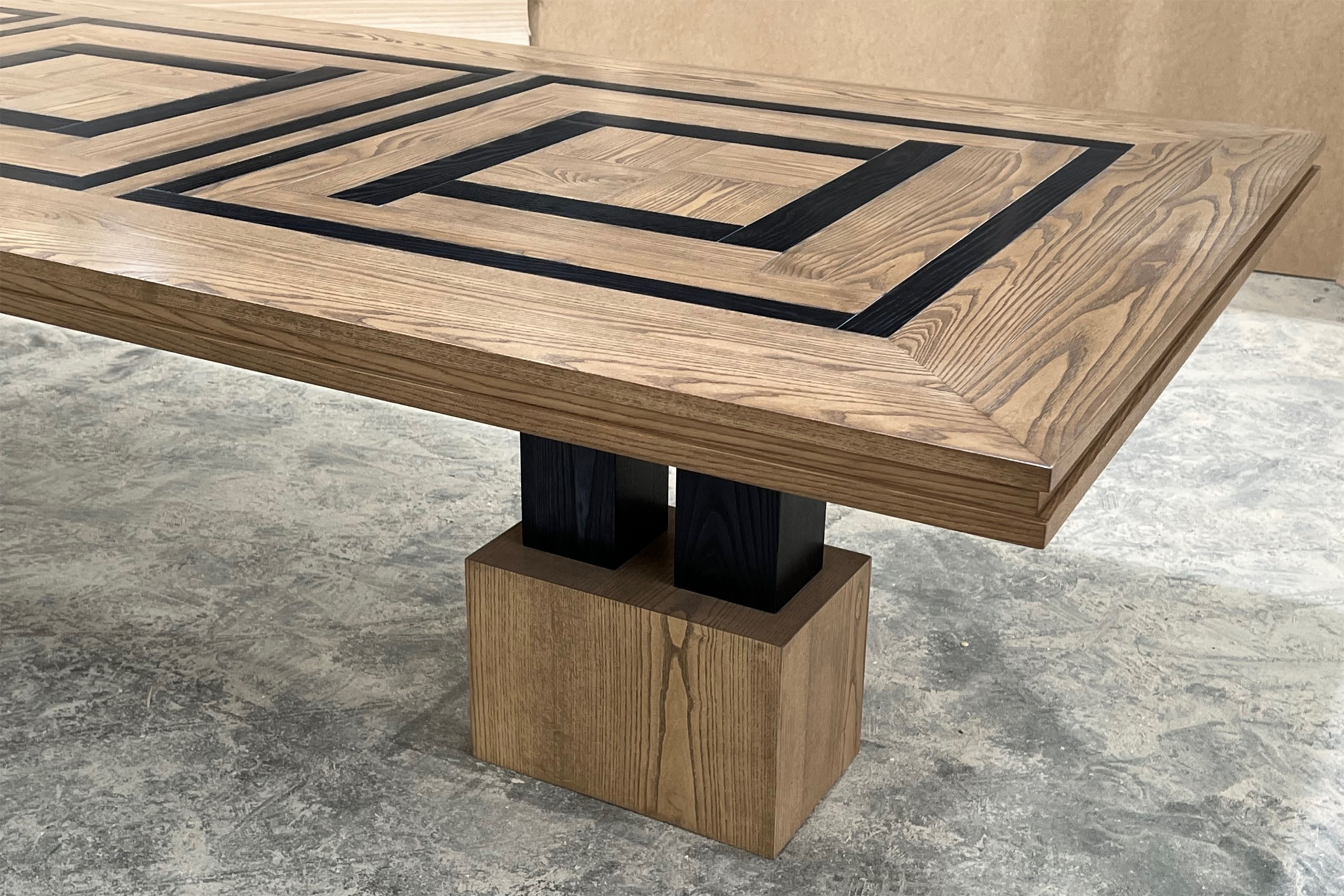 Custom designed parquetry dining table with a unique pedestal base made from solid Oak timber. The table features a square style parquetry top with a custom designed modern style base. Regarding the design, Mark took direct inspiration from the clients home to ensure that this is a statement piece. The colour has been specifically chosen to blend and balance with the home.