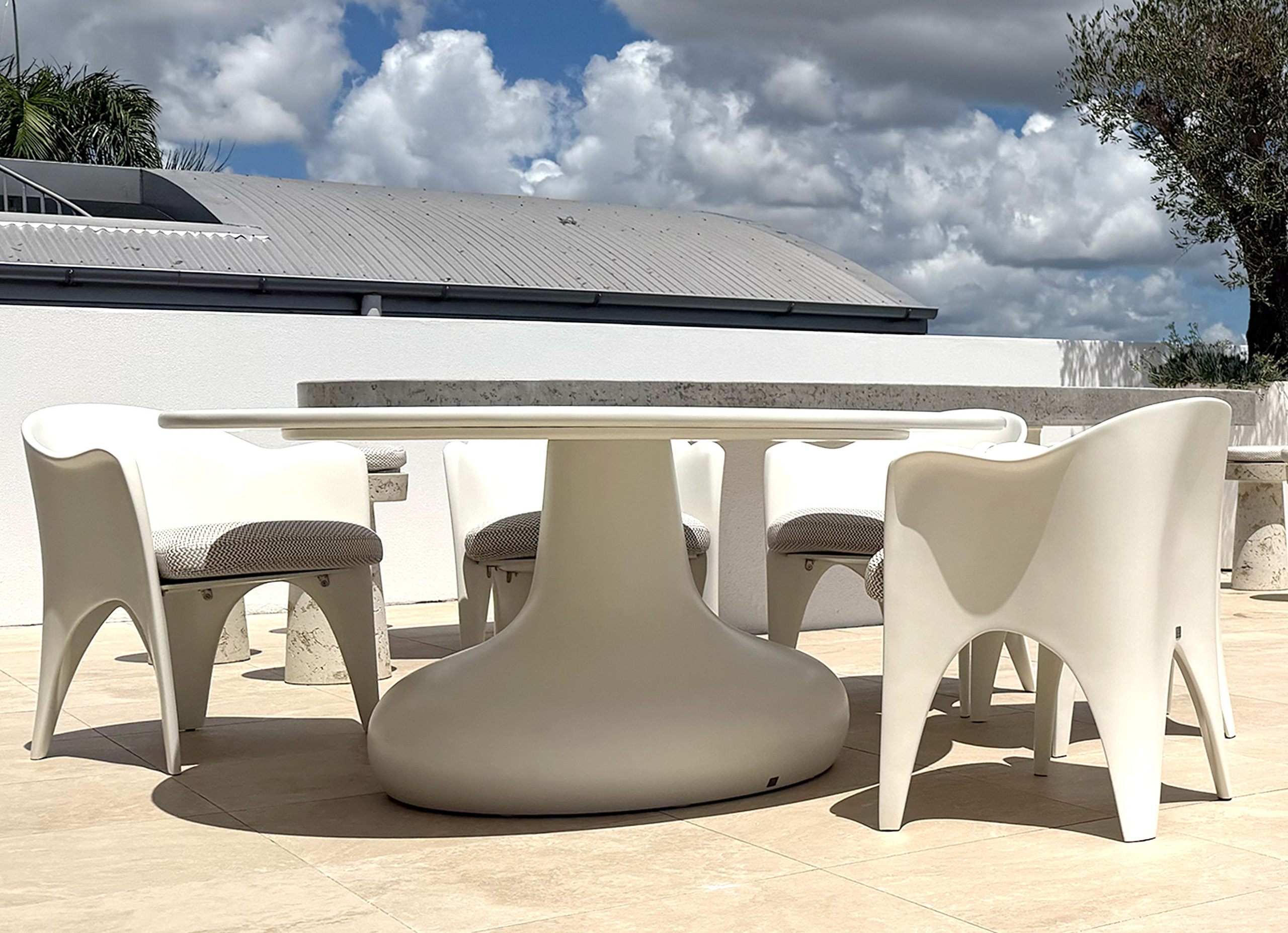 This outdoor bespoke Modern Mid Century dining chair by luxury interior designer and furniture manufacturer Mark Alexander, in collaboration with GANSK outdoor furniture, combines comfort, style, and sculptural luxury outdoor furniture design. Its elegant, flowing lines create a sophisticated and inviting presence, ideal for premium outdoor living in residential or hospitality settings. Custom designed and custom made, this designer outdoor furniture piece brings architectural presence and contemporary elegance to luxury outdoor furniture across Australia.