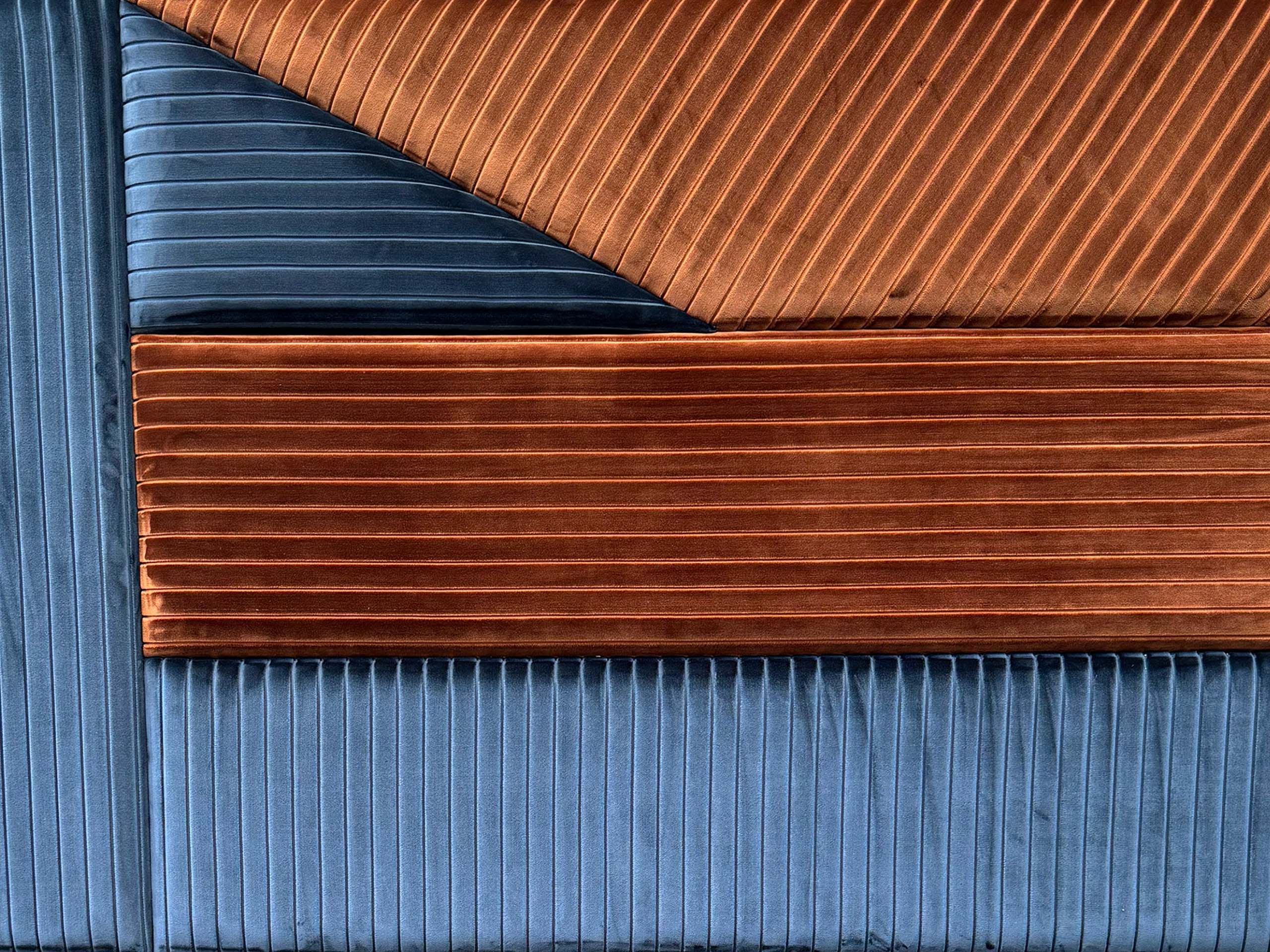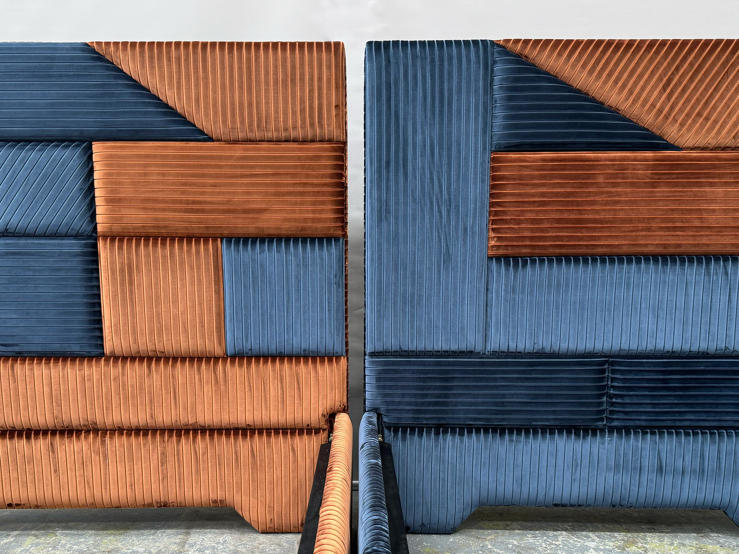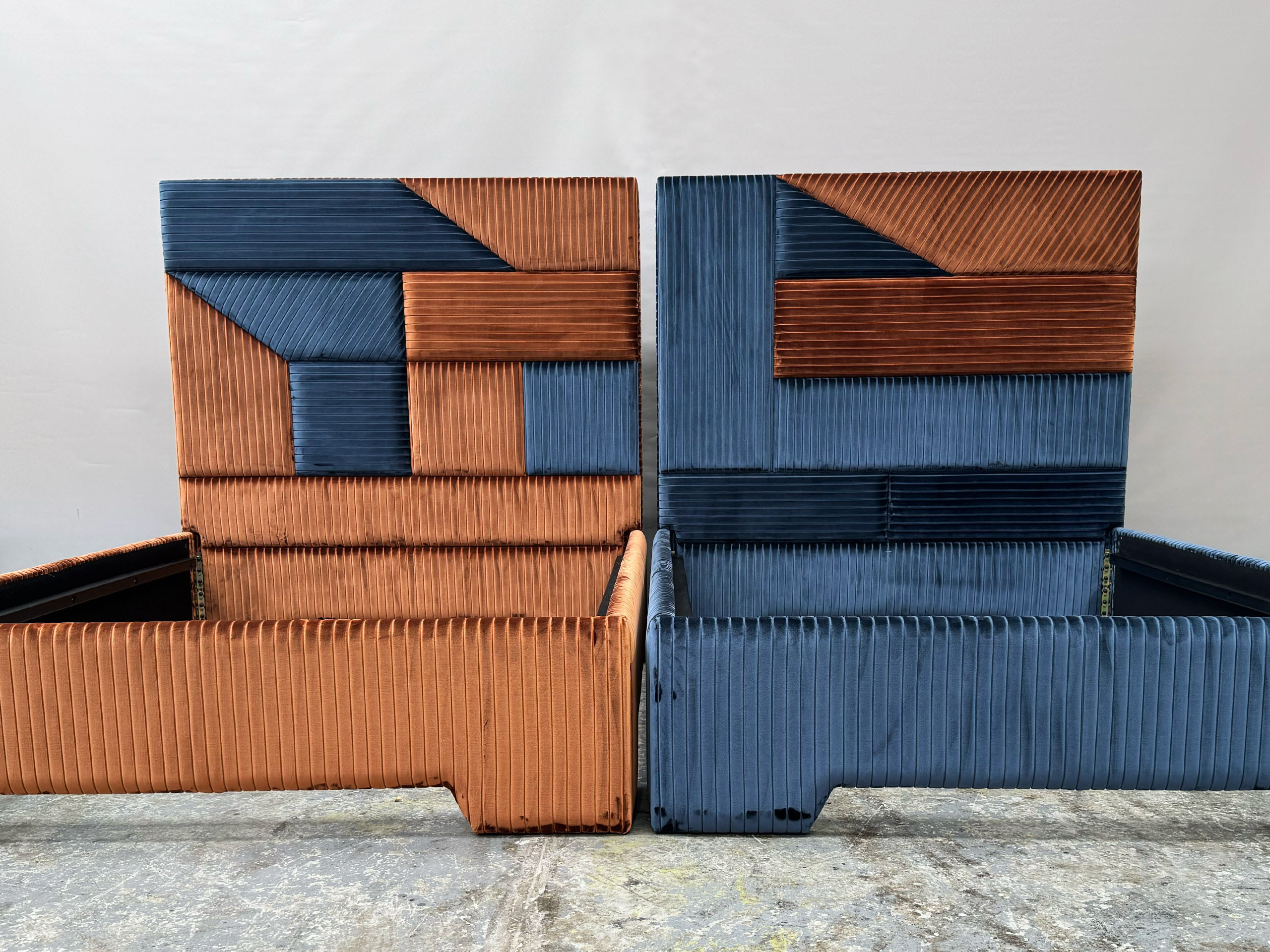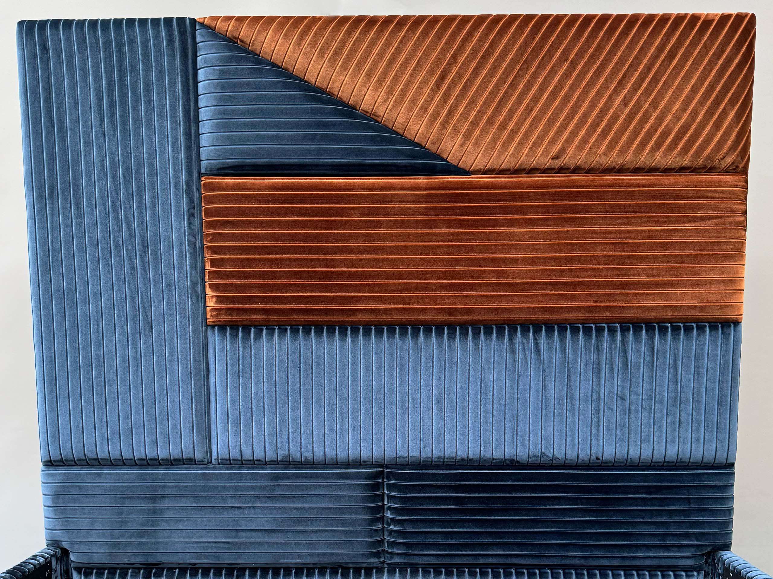 Custom designed geometric style headboard with a base constructed to fit the mattress size. Designed to suit the client’s home and upholstered in luxurious fabric.