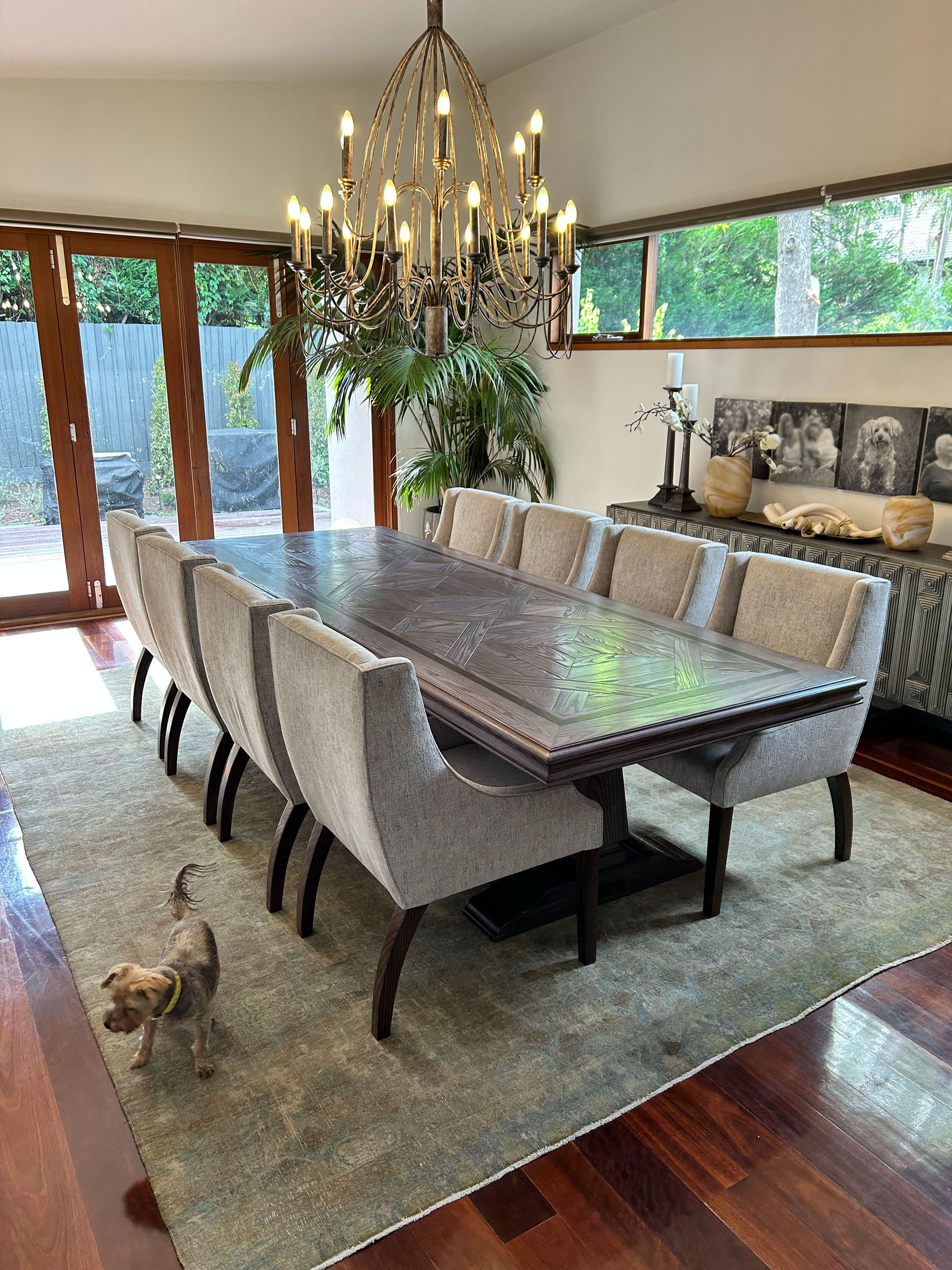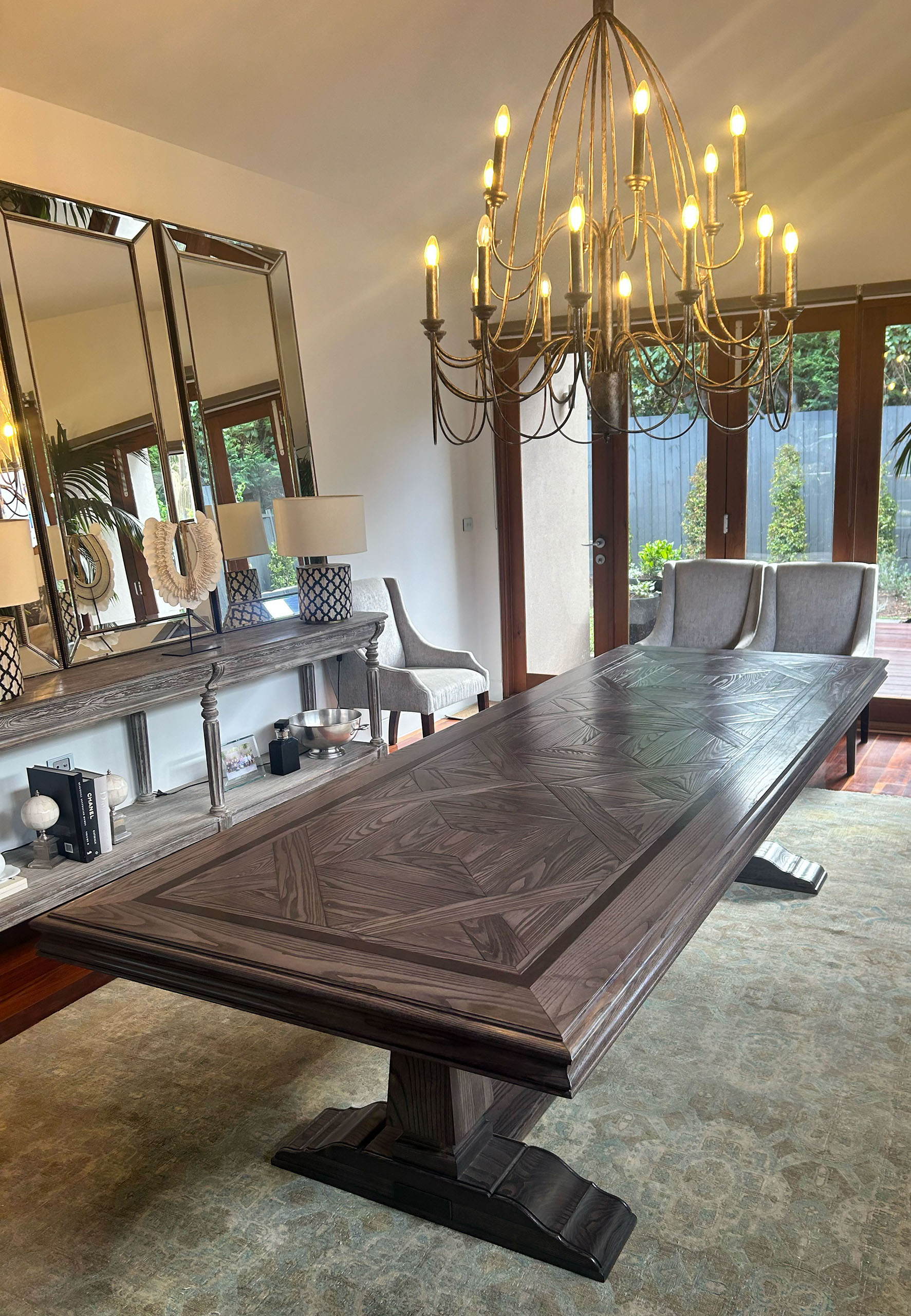 Each Australian made parquetry dining table is custom designed to a premium level of quality and finish. Dimensions, parquetry design, colour, level of ageing, and finish of our luxury furniture can all be custom made to your specific requirements.