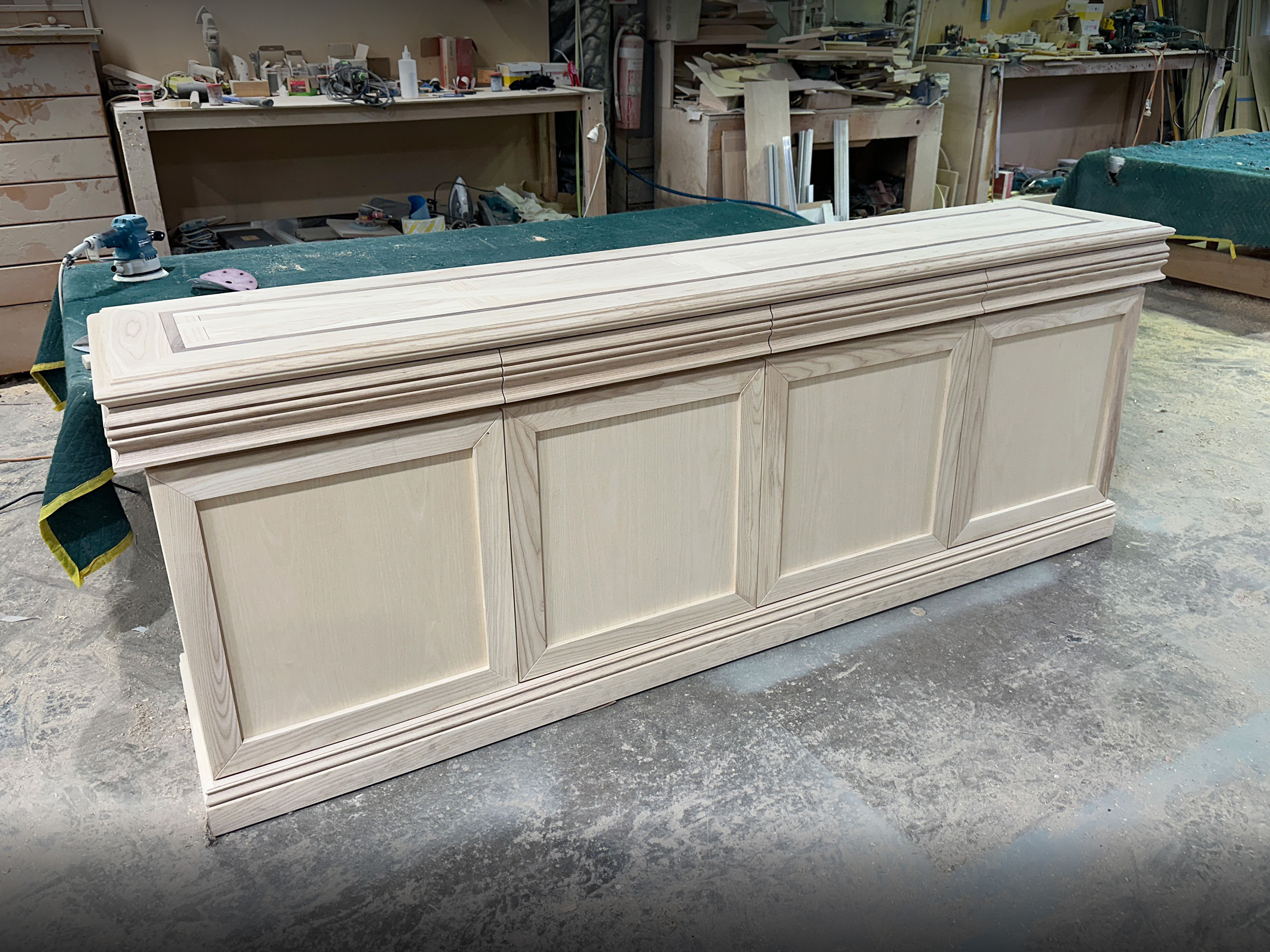 The Hamptons Parquetry sideboard features a top with matching parquetry to complement its dining table counterpart, showcasing an elegant undulating effect across the boards. With a smooth, clean finish and four neatly concealed drawers, this piece offers both refined style and practical storage. Custom designed by luxury interior and furniture designer Mark Alexander, it brings timeless sophistication to any dining or living space.