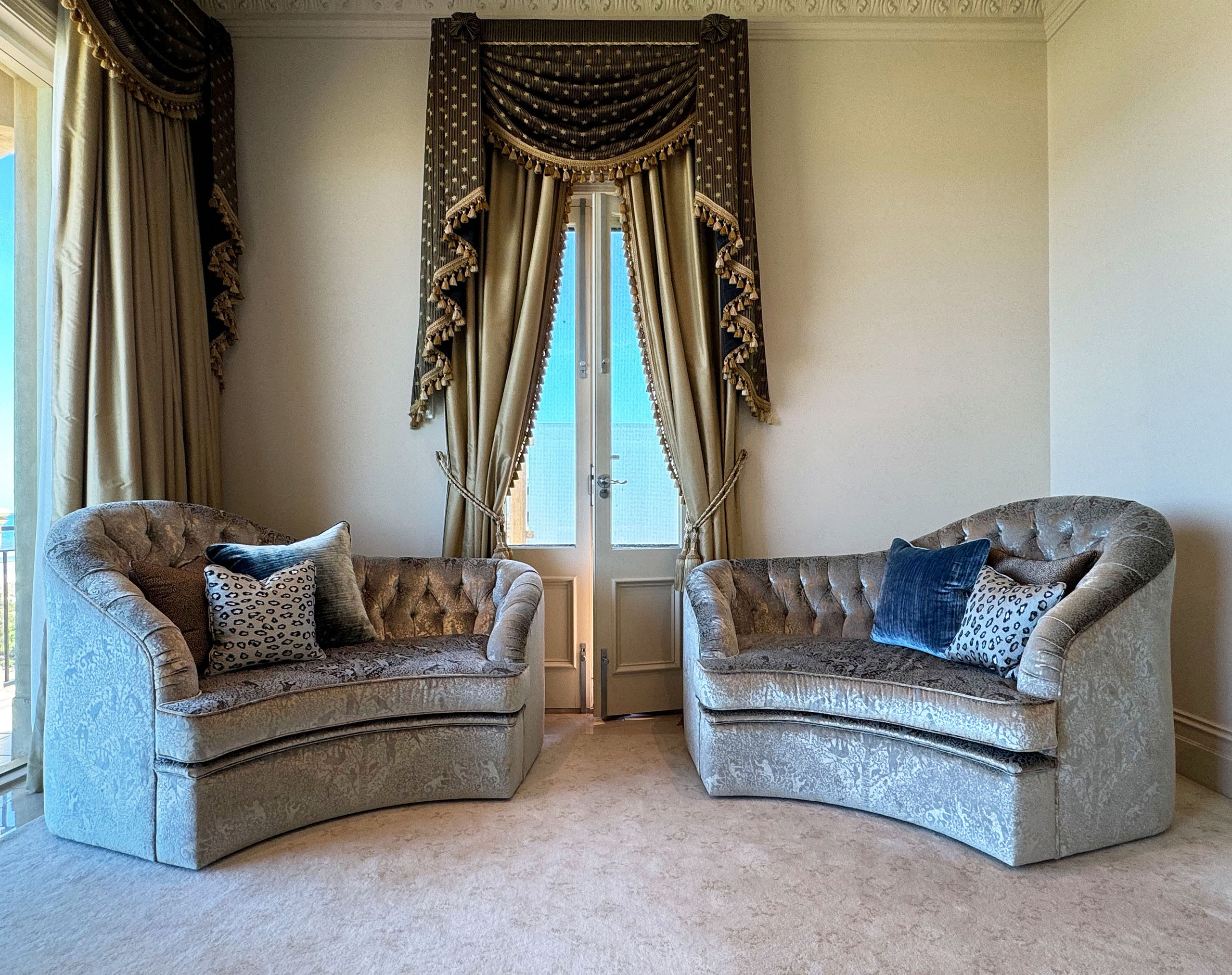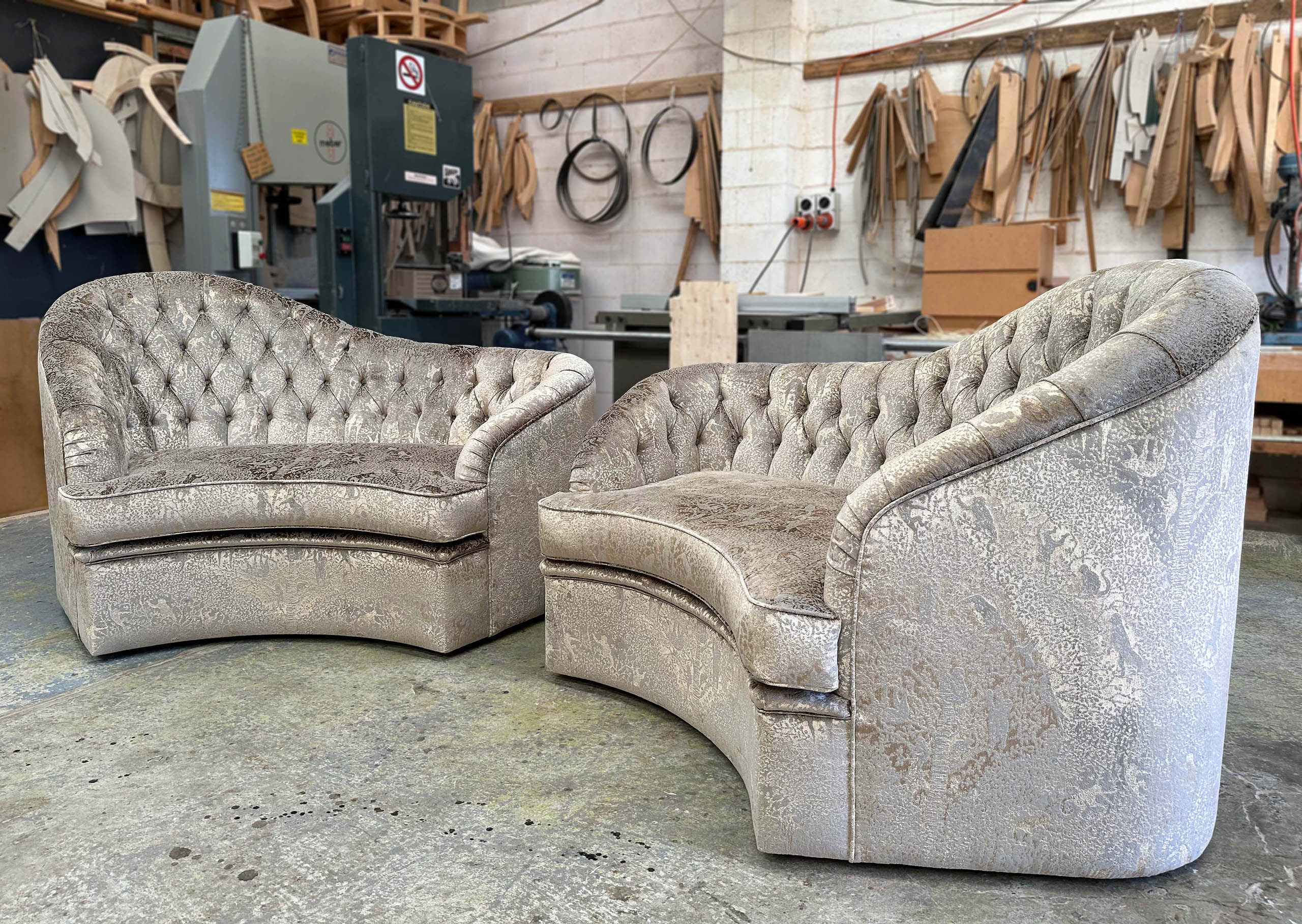 These luxurious curved chaise sofas are custom made and designed using elegant functional fabrics. These smooth soft curved sofas are made with luxurious European fabrics and are highlighted with deeply tufted buttons. Luxury Interior and Furniture designer Mark Alexander designed these curved chaise sofas with premium foams and cushioning for enduring long lasting comfort. Options of scatter cushions and coordinating room items are also available.