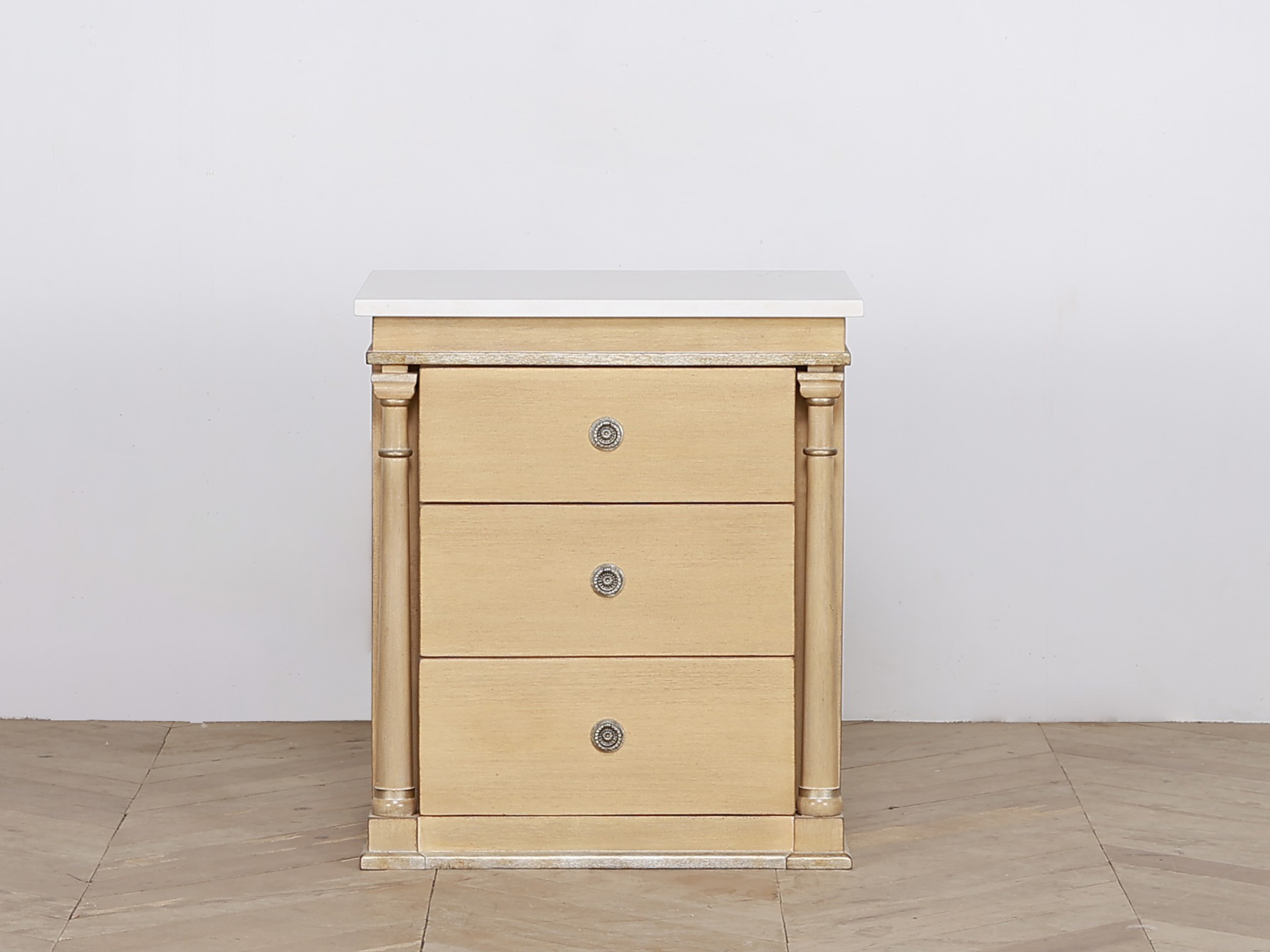 The luxury custom made Art Deco bedside table in light gold with gilded detailing features three seamlessly integrated drawers beneath a marble-topped surface. Handcrafted by luxury interior designer and furniture manufacturer Mark Alexander, it complements the bed while showcasing refined Art Deco style.Art Deco style with bespoke craftsmanship by luxury interior designer and furniture manufacturer Mark Alexander.