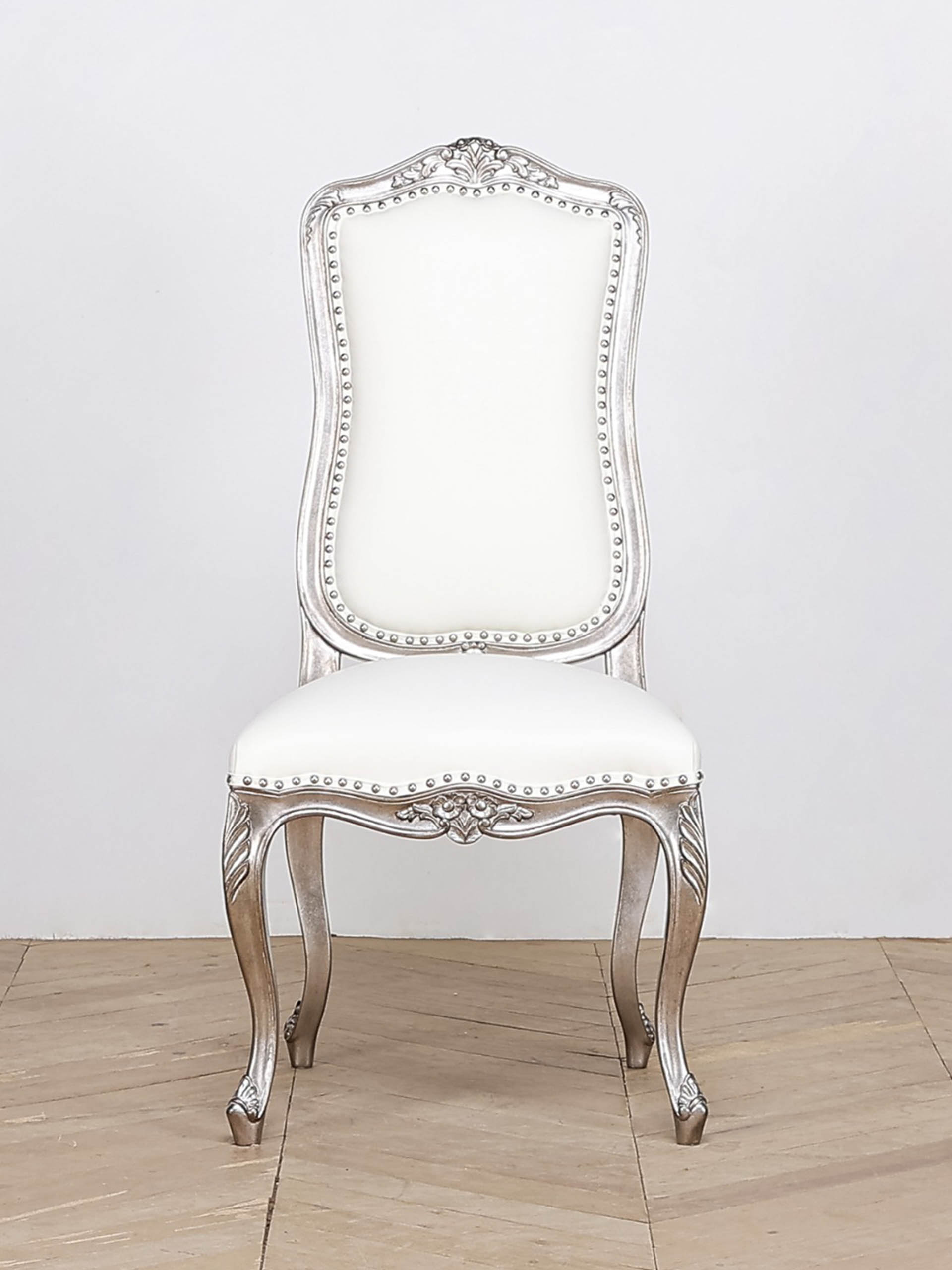 The luxury custom made French bar stool is bespoke, with white leather upholstery and a silver gilded frame, finished with silver stud detailing for a refined look. Handcrafted by luxury interior designer and furniture manufacturer Mark Alexander.