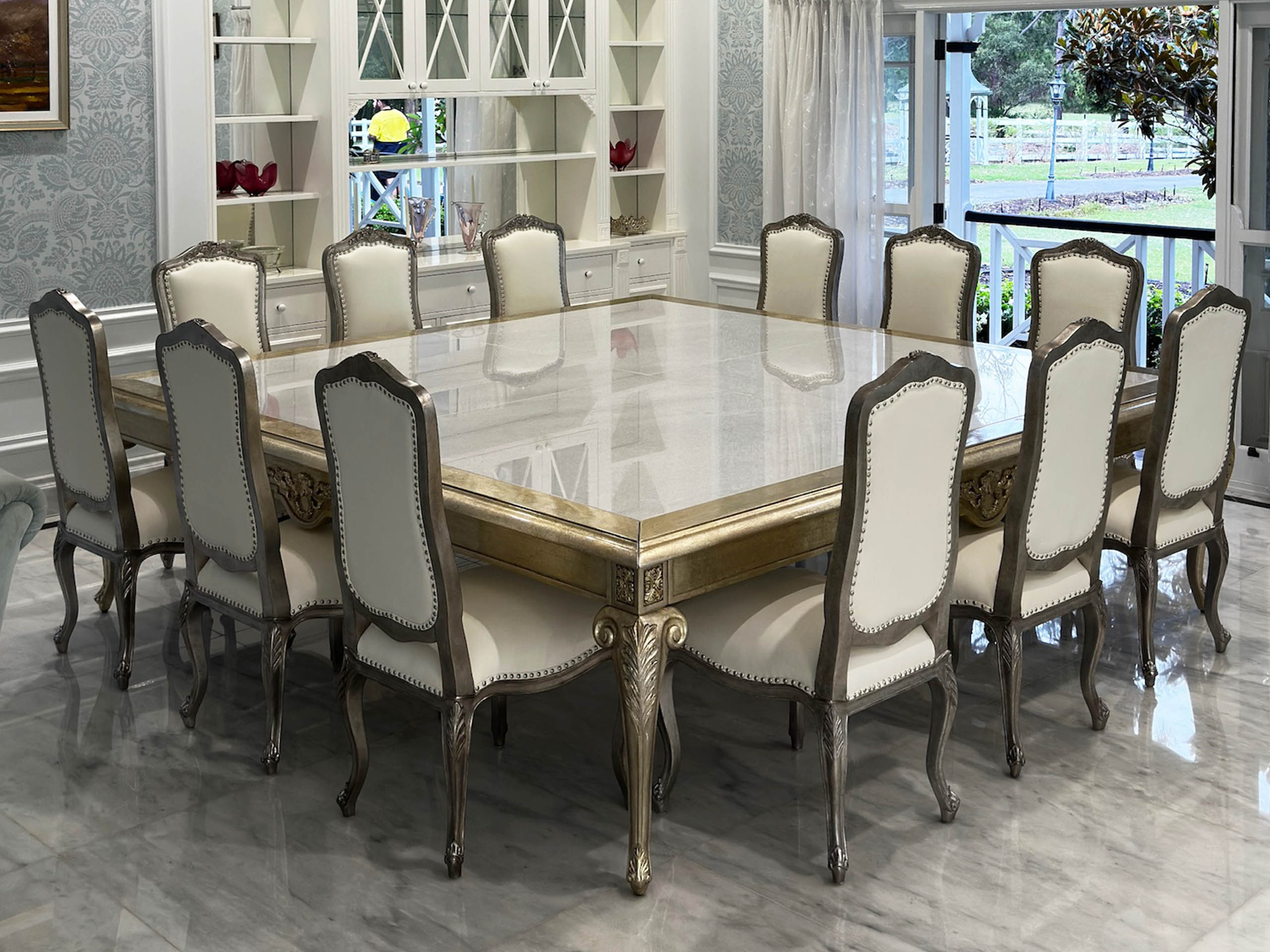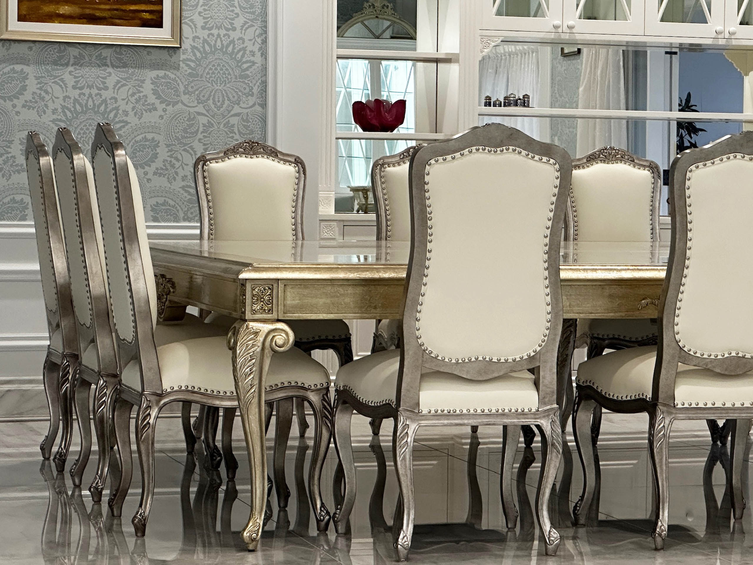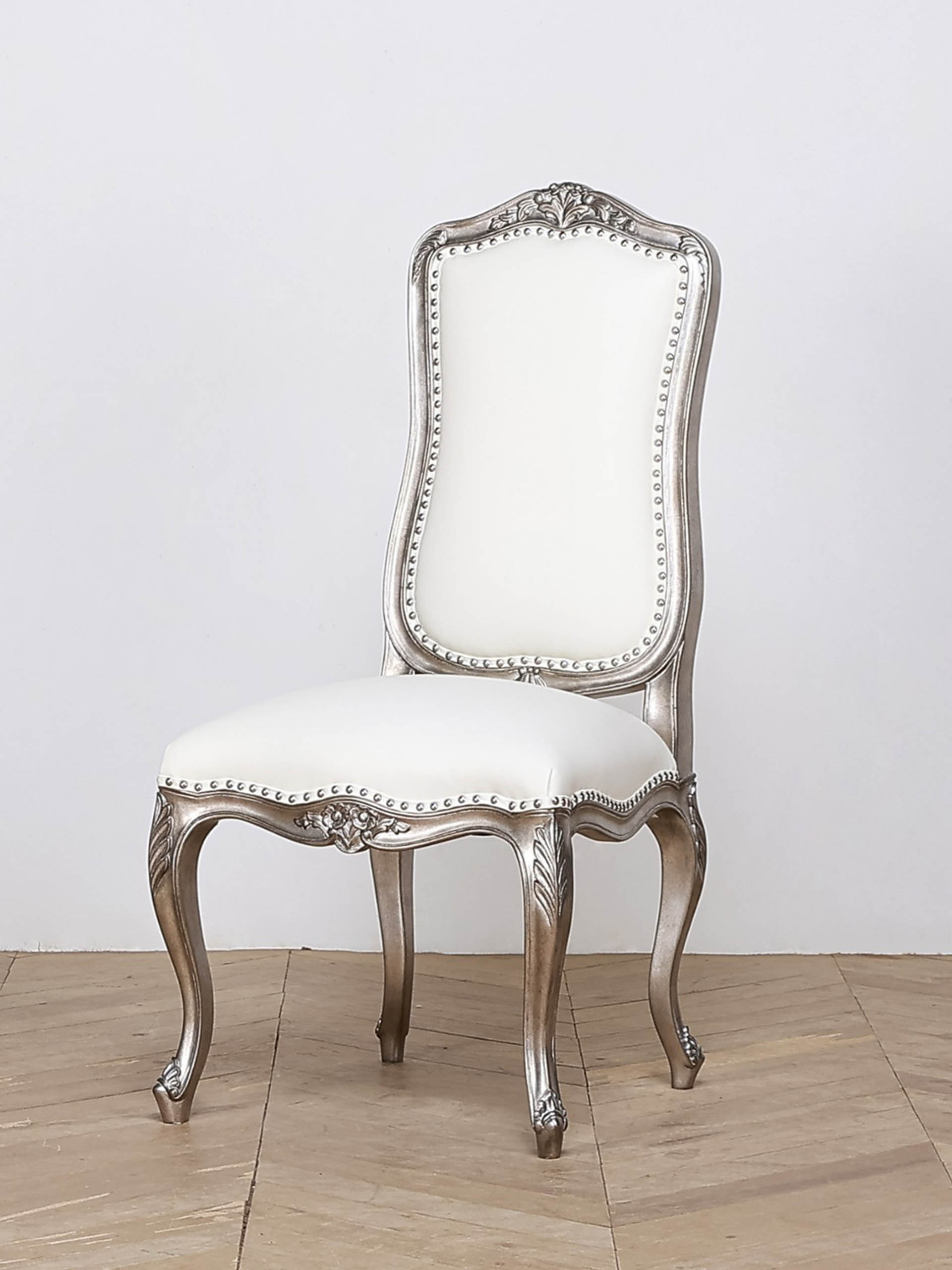 The luxury custom made French dining chair is bespoke, with white leather upholstery and a silver gilded finish, accented with silver studs for a refined and elegant touch. Handcrafted by luxury interior designer and furniture manufacturer Mark Alexander.