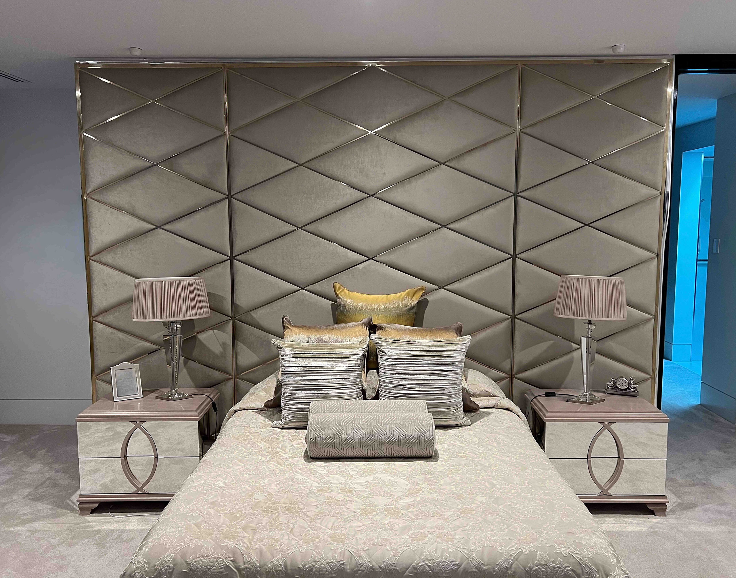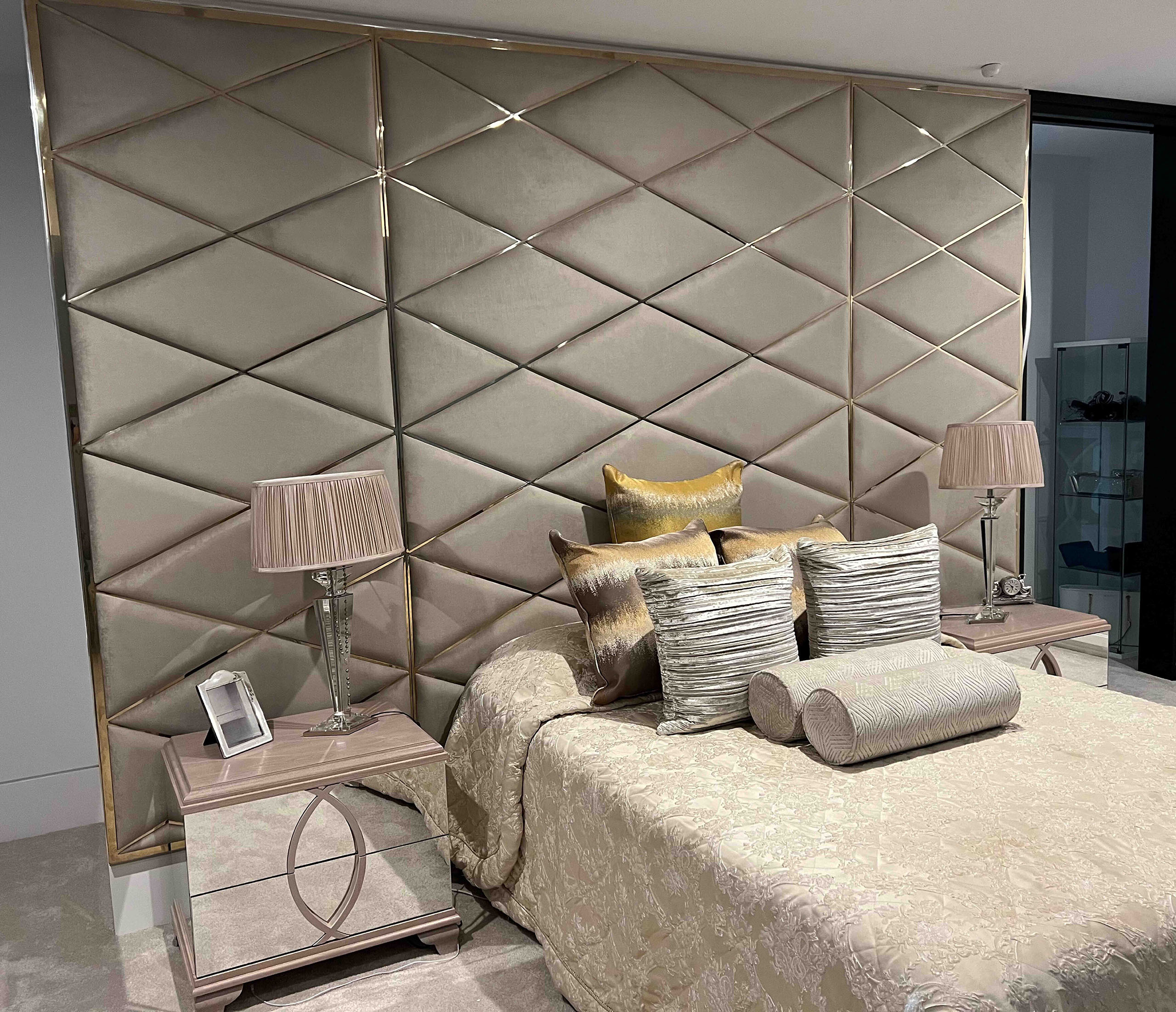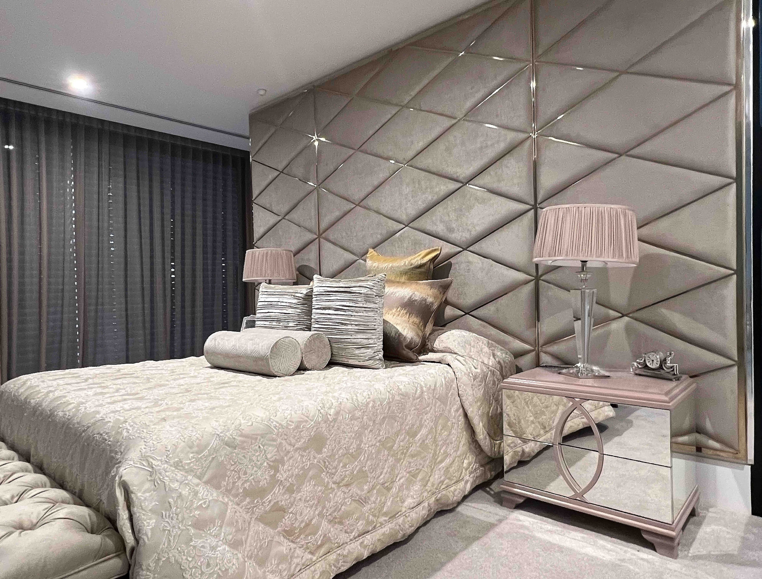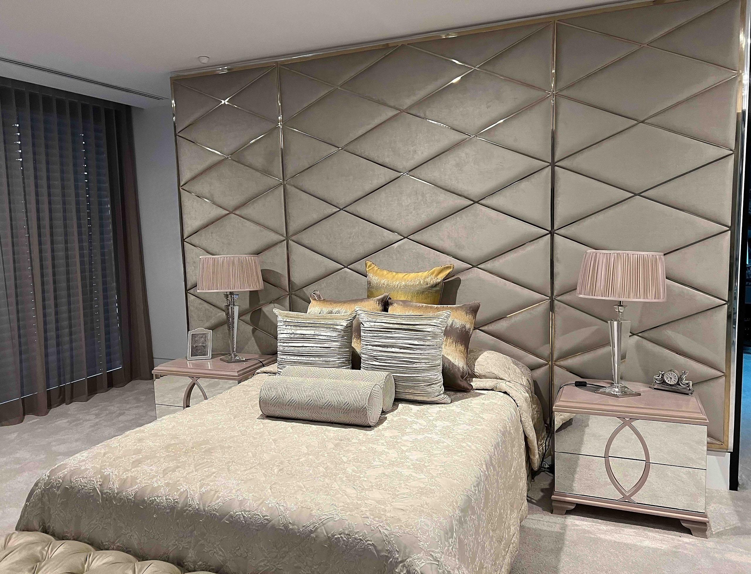 Custom designed and made luxury modern headboard with a contemporary design featuring diamond-patterned upholstered panels in a bespoke wide finish.