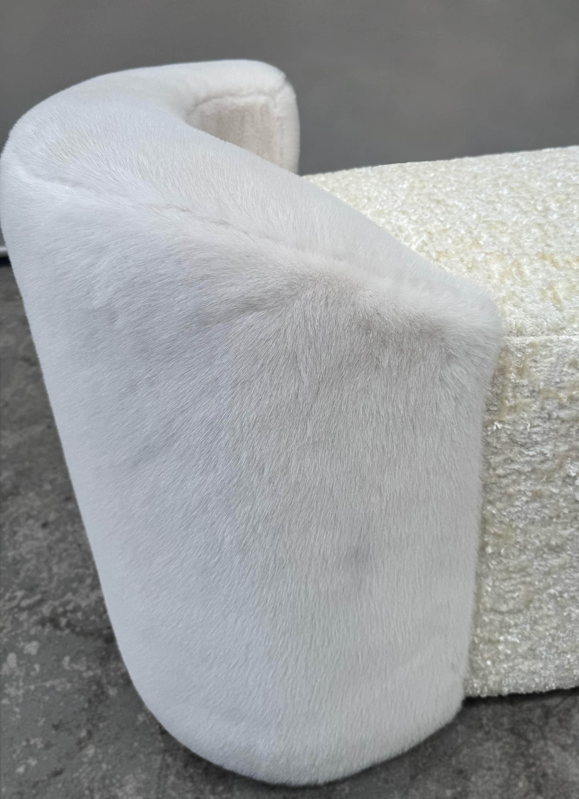 The luxury Mid Century ottoman is custom made to match the armchair, highlighting the distinctive curves of the arms. Handcrafted for both comfort and visual cohesion, it complements the sculptural design, created by luxury interior designer and furniture manufacturer Mark Alexander.