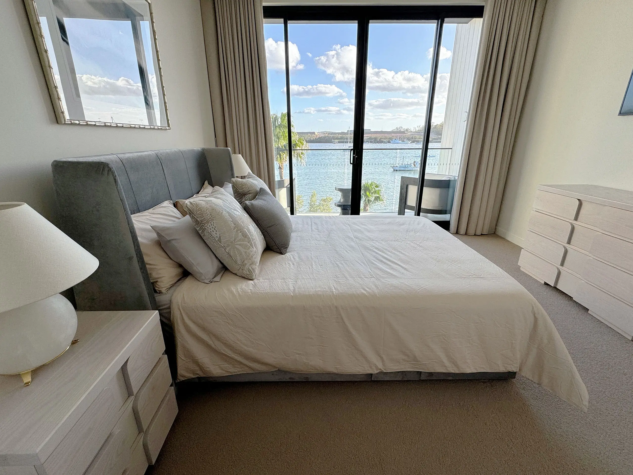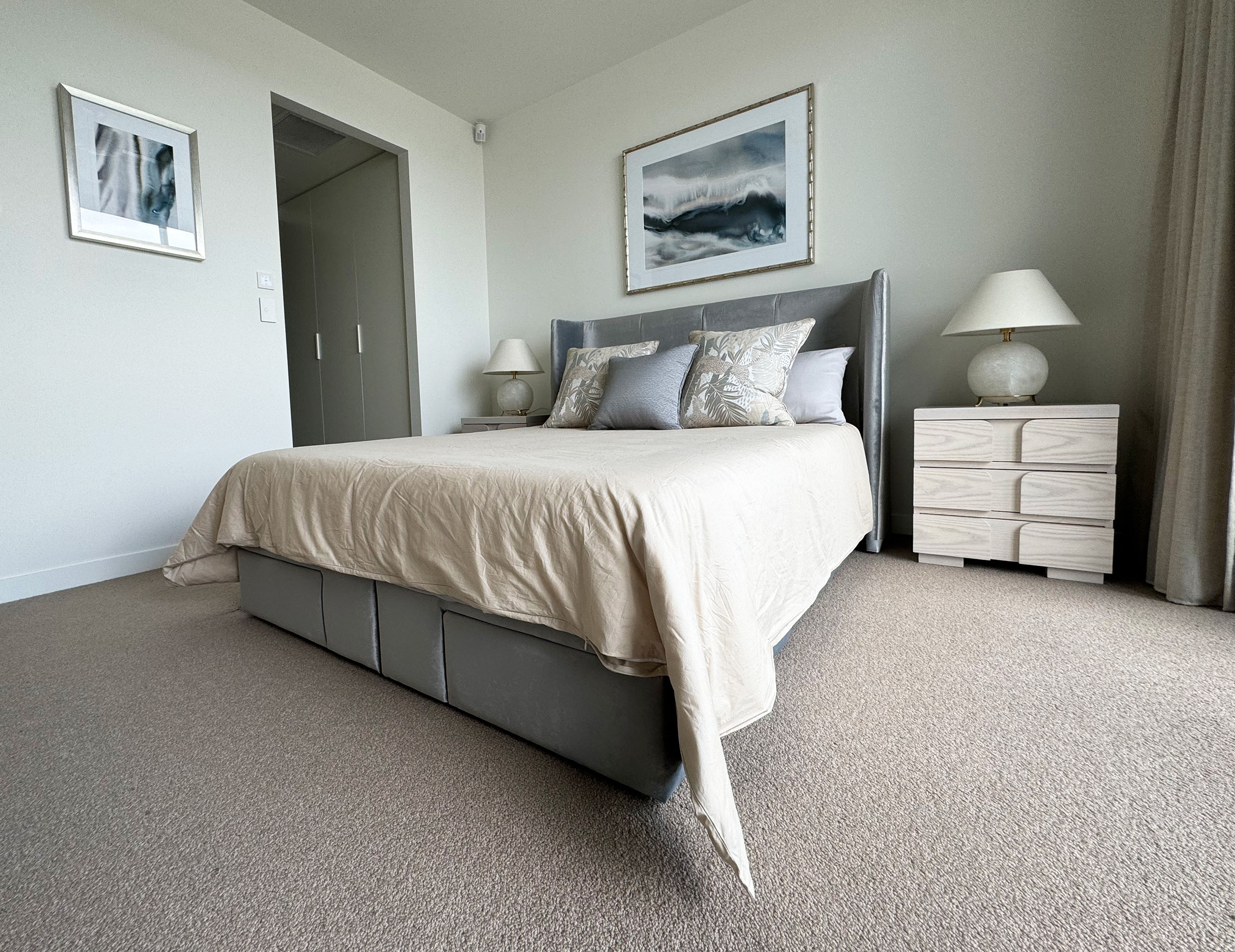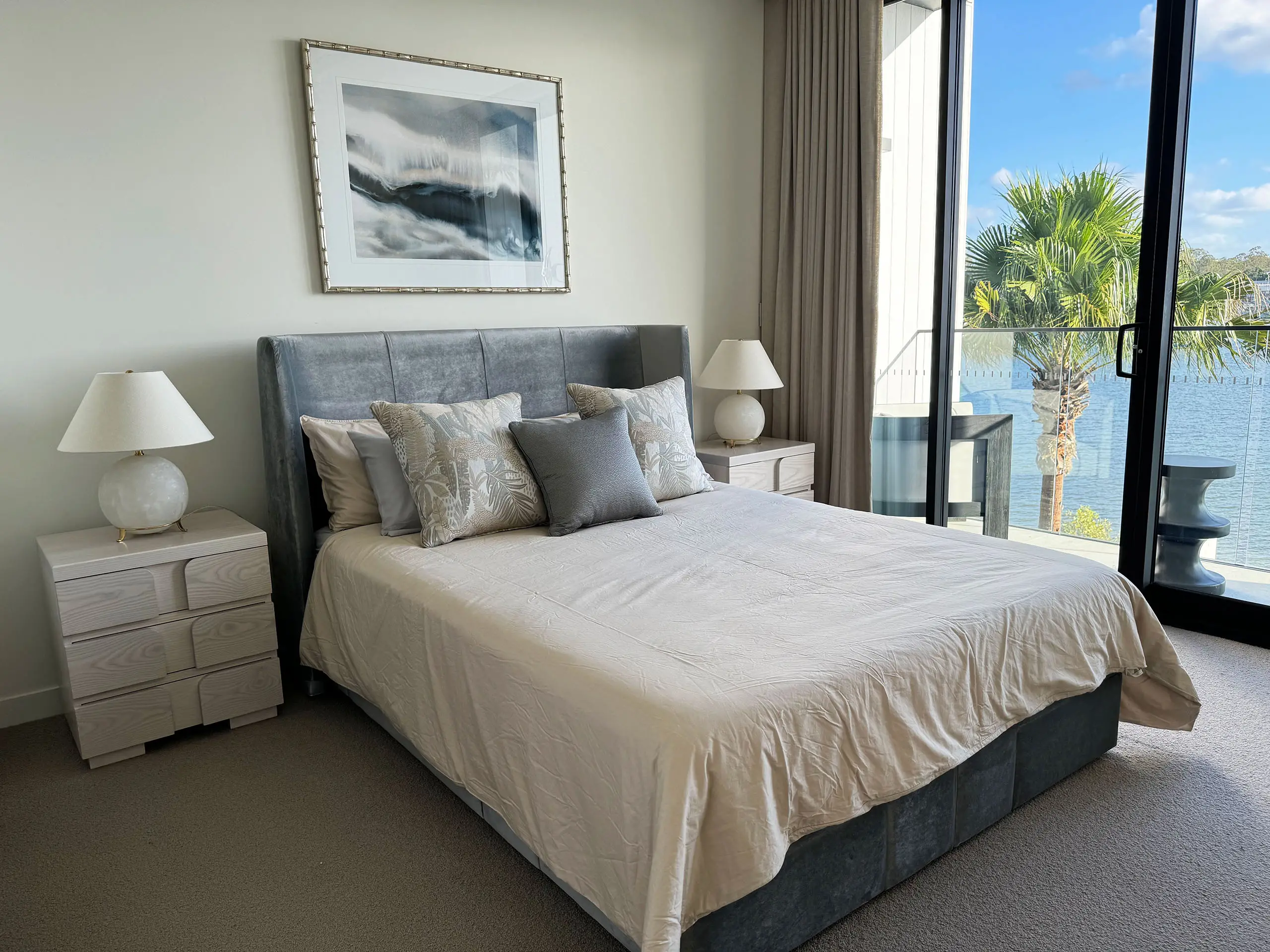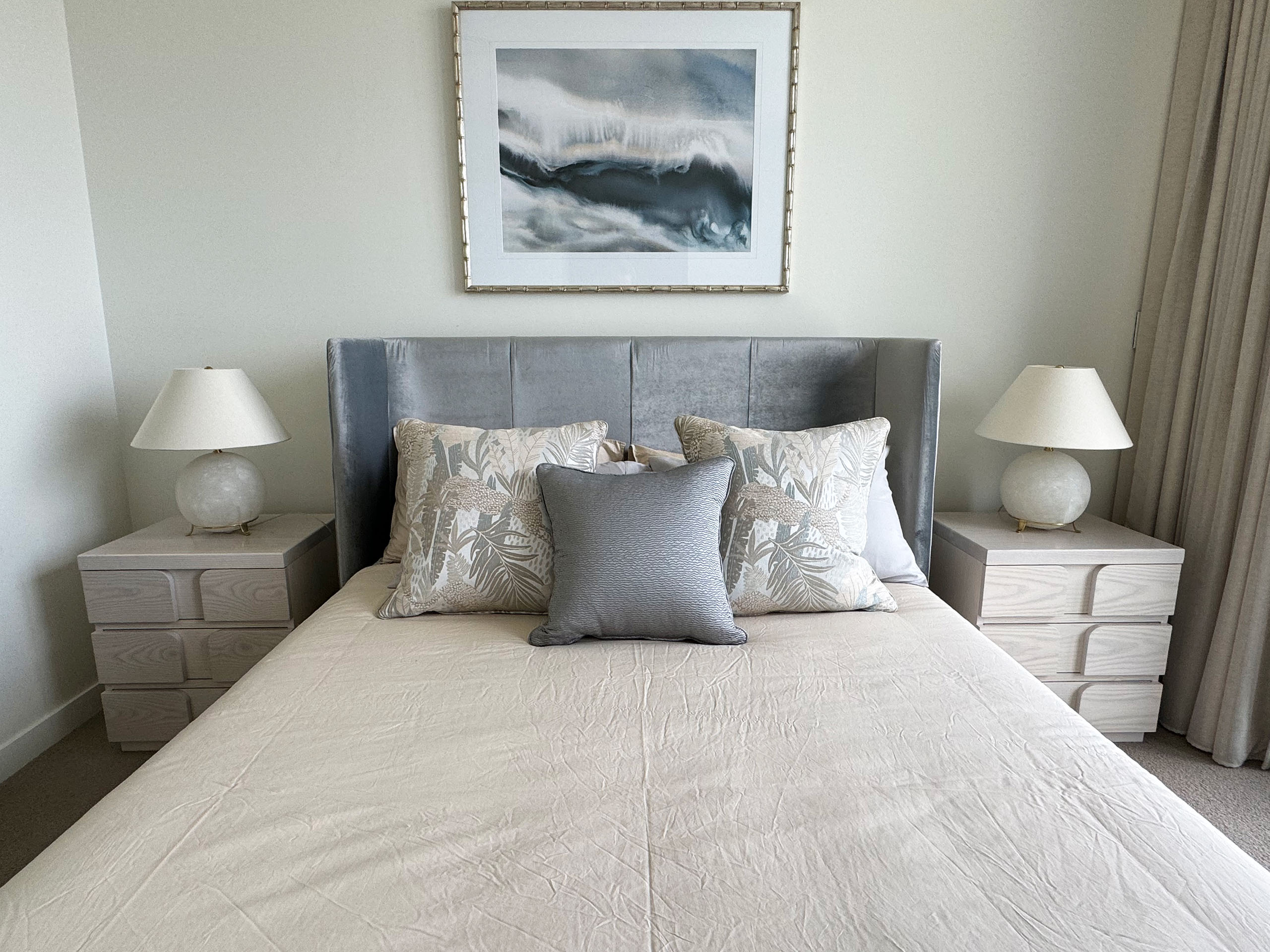 Inspired by Mid Century Modern aesthetics, this stunning queen bed head frame is crafted by Luxury Interior and Furniture Designer Mark Alexander, blending both style and functionality. Constructed with a robust bed frame, it is topped with premium foam and cushioning, and finished with sumptuous upholstery to add an elegant touch.