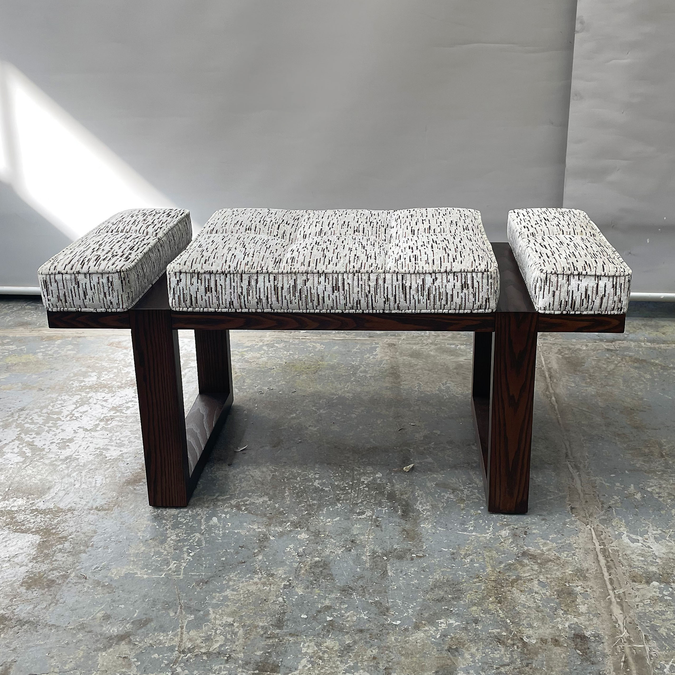 Modern solid timber and upholstered oak stool made by luxury interior and furniture designer Mark Alexander. Featuring a contemporary design of solid oak finished in high quality stain. Arranged in a unique look is the premium seat padding in opulent fabric with a square stitched detail. All Australian made and workmanship.