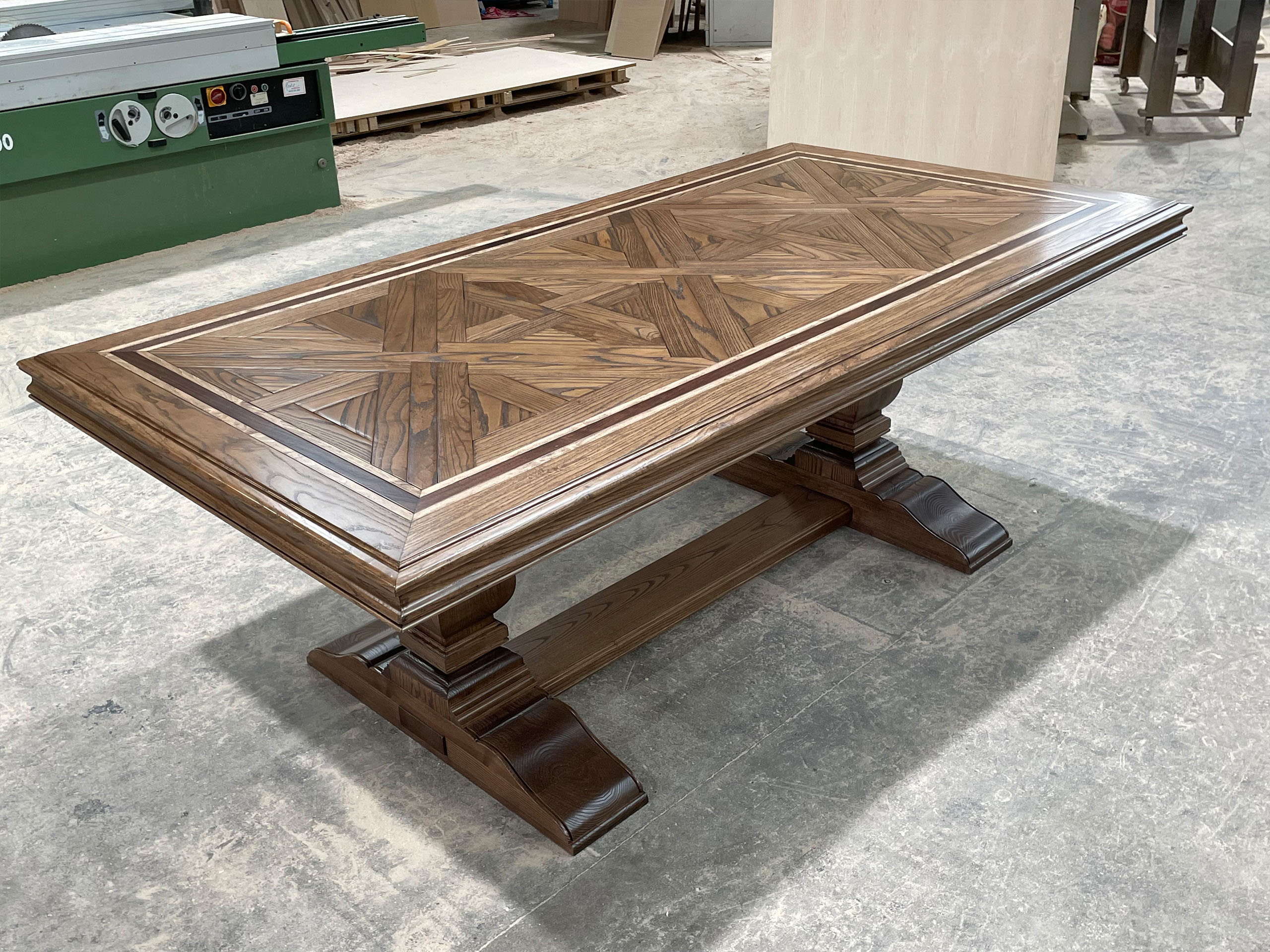 Australian made and designed contrasting border parquetry dining table, hand crafted from solid oak timber with beautiful character grain throughout. Featuring our classic single pedestal base at each end with stretcher, with a beautiful light contrasting timber parquetry inlay to the top.