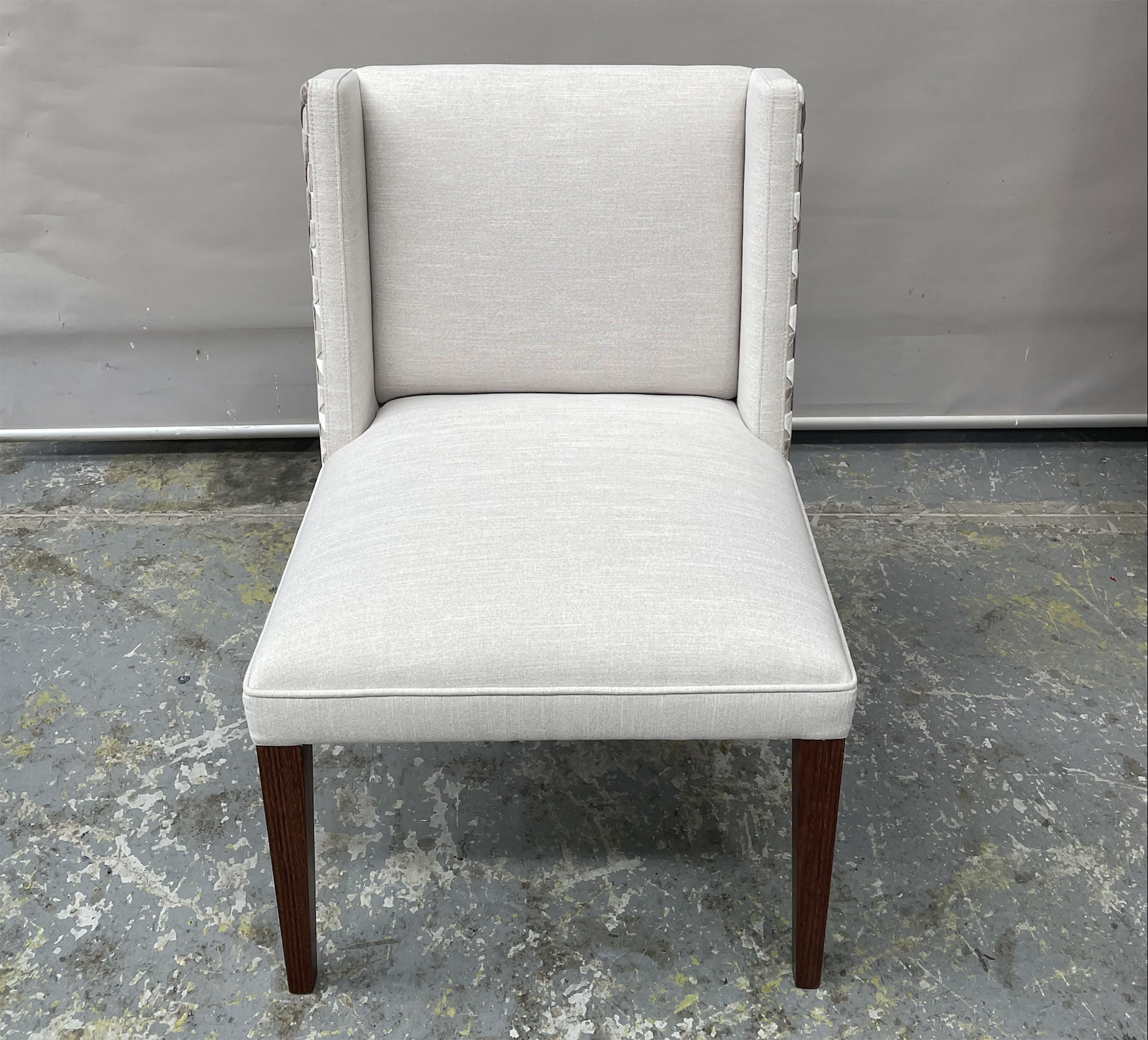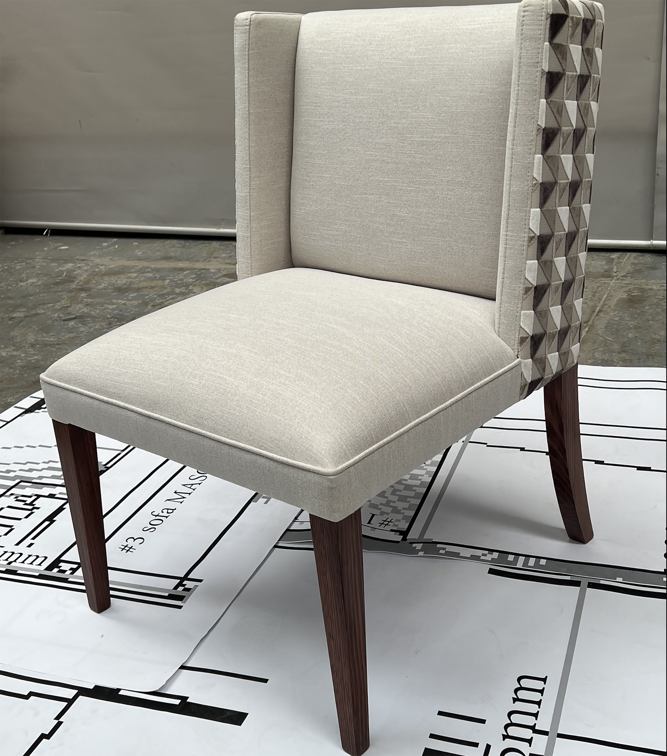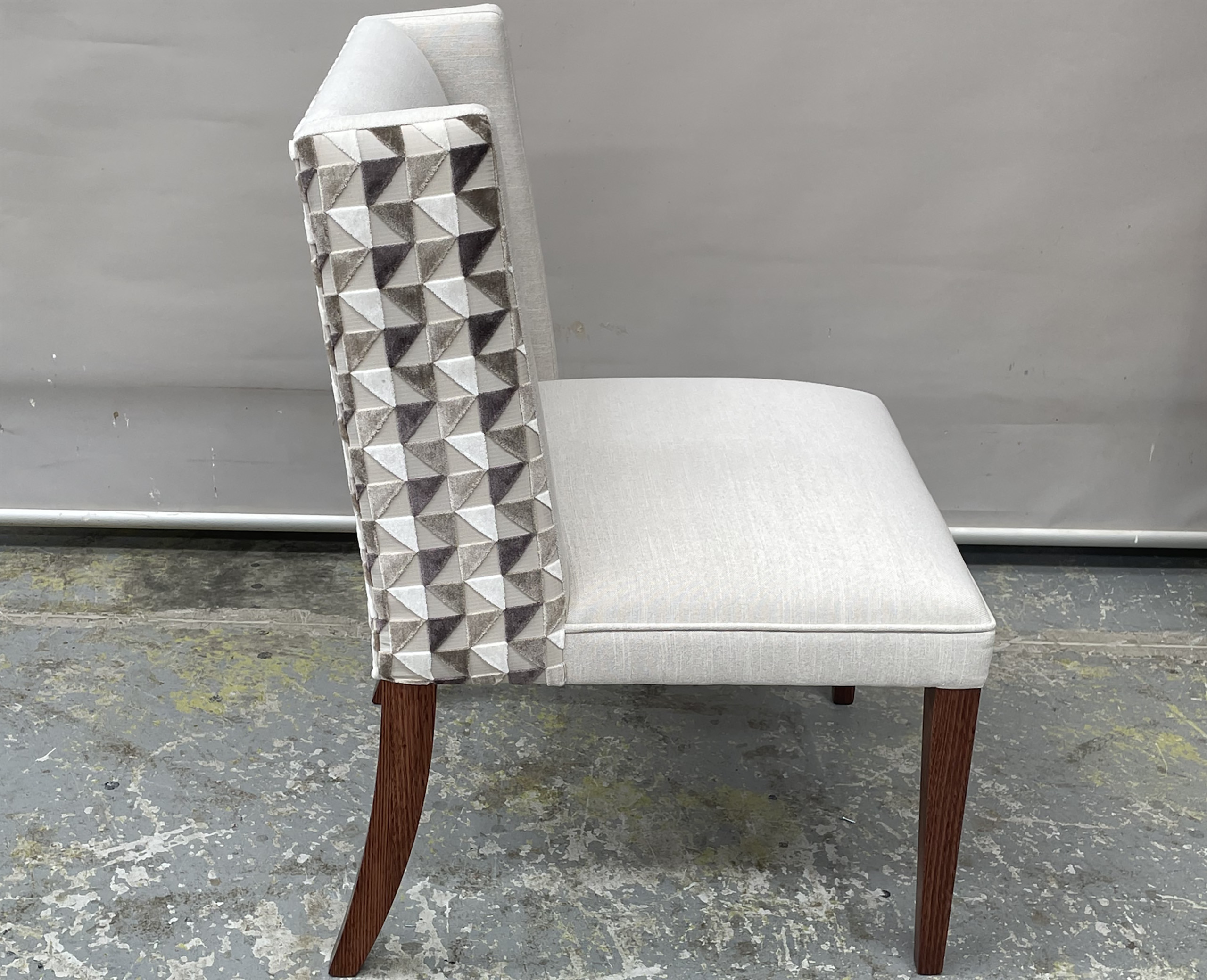 Custom designed and made patterned wingback dining chairs. A contemporary wingback design superbly finished by skilled artisans.