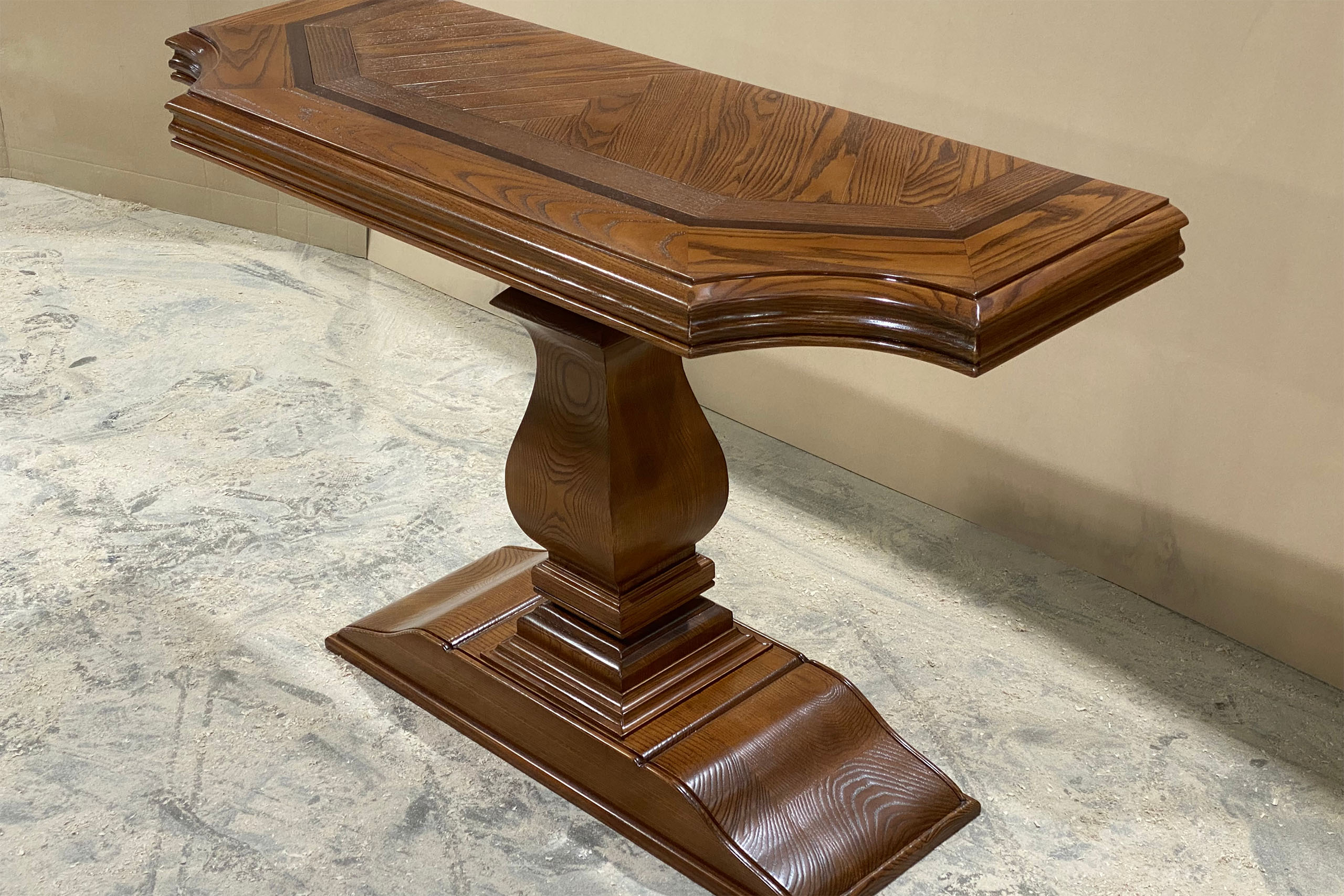 Custom designed and made in Australia, this solid oak entrance table features a striking pedestal base. Elegantly handcrafted from solid oak timber, it includes a darker contrasting inlay border. The beauty and luxury of the piece are highlighted by the rich timber grain and captivating figure swirls throughout the base.