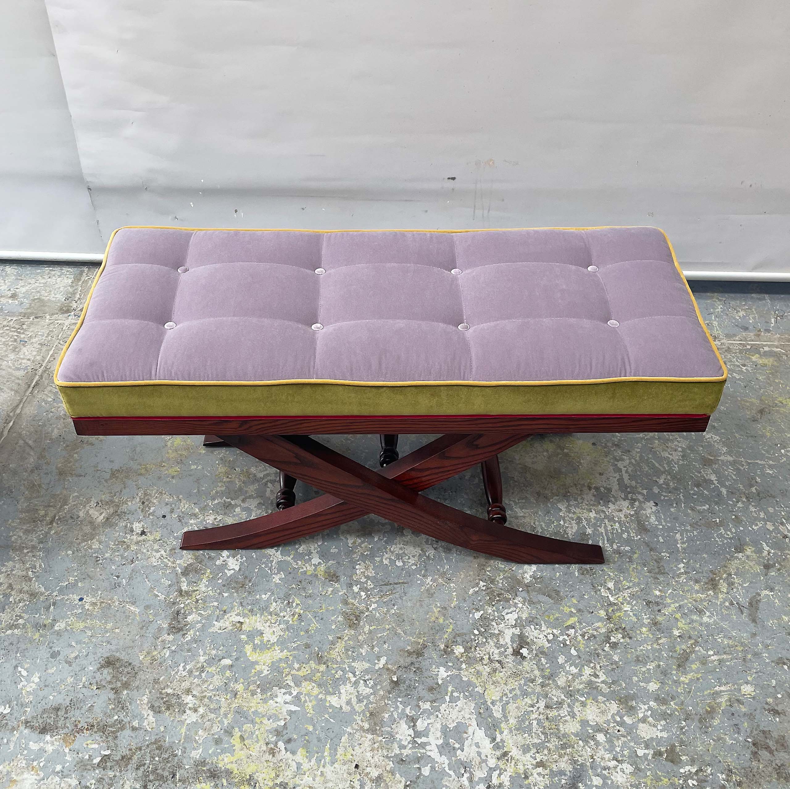 Unique in its form, this upholstered stool features a Victorian take on the X-shaped frame hand crafted from a polished solid oak timber. It has a padded seat upholstered in premium velvet fabric and finally completed with a buttoned detail.